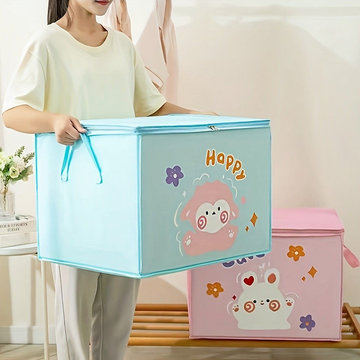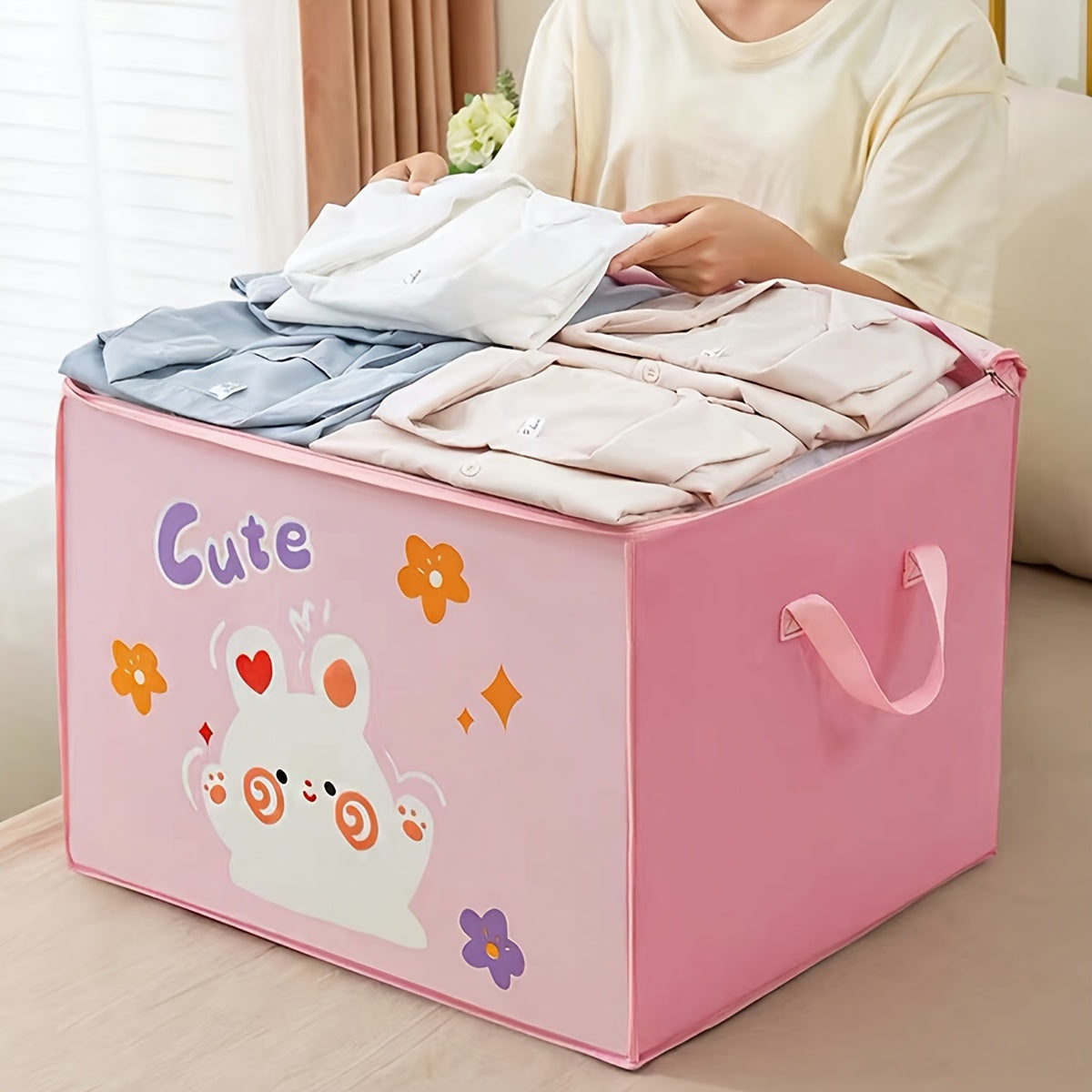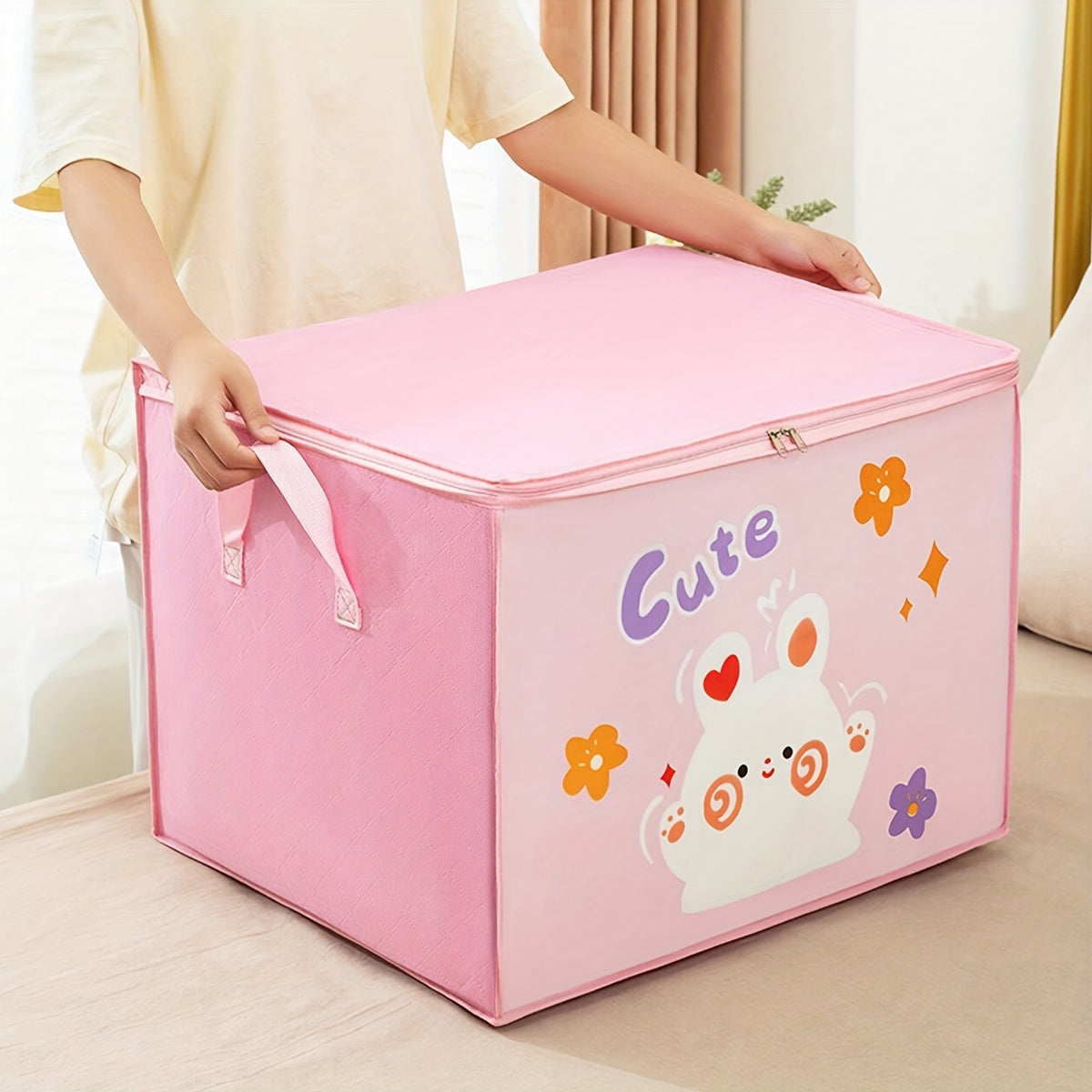 Просторная картонная коробка для хранения с молнией - изготовлена из нетканого материала, включает прозрачное окно для организации одежды и подушек