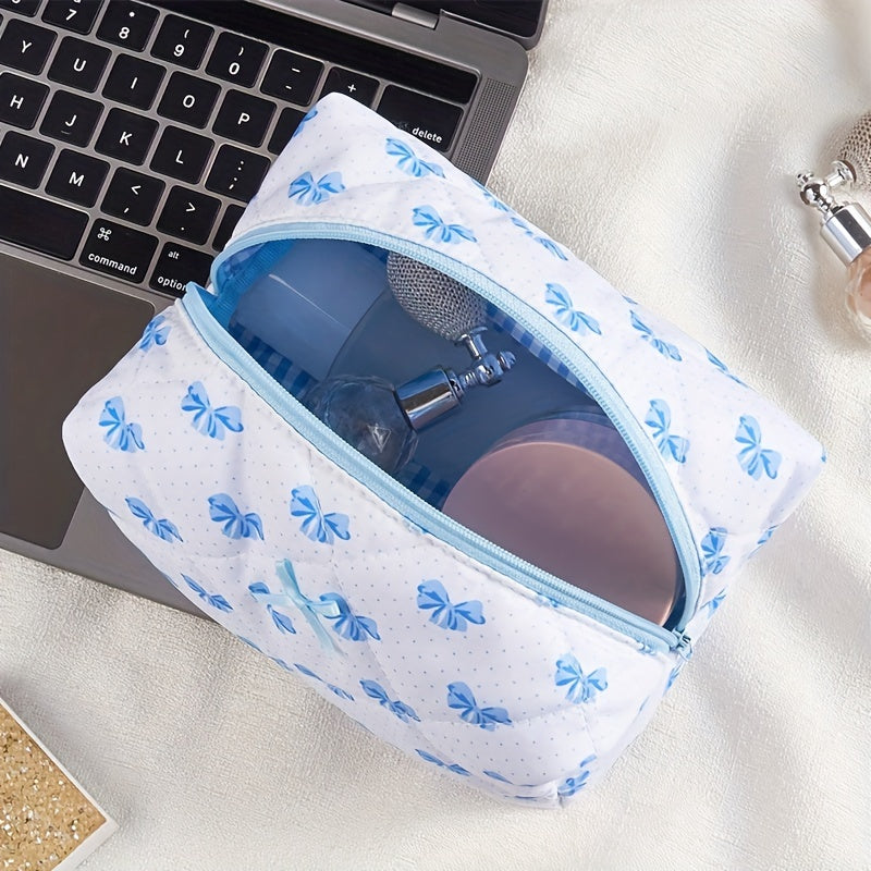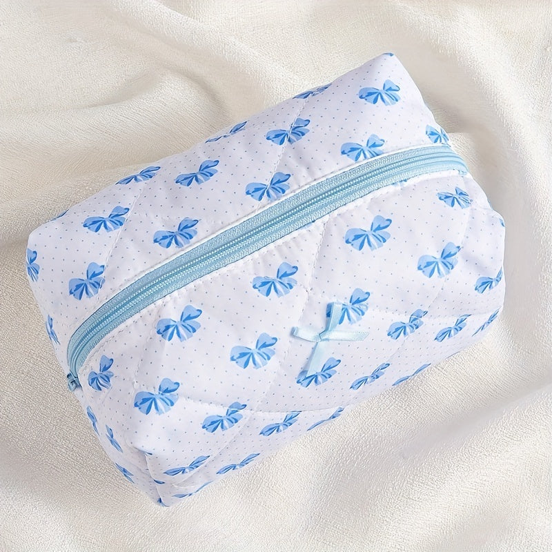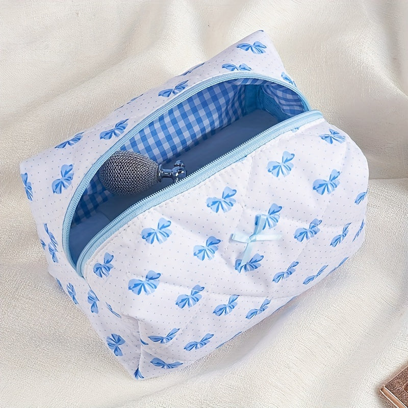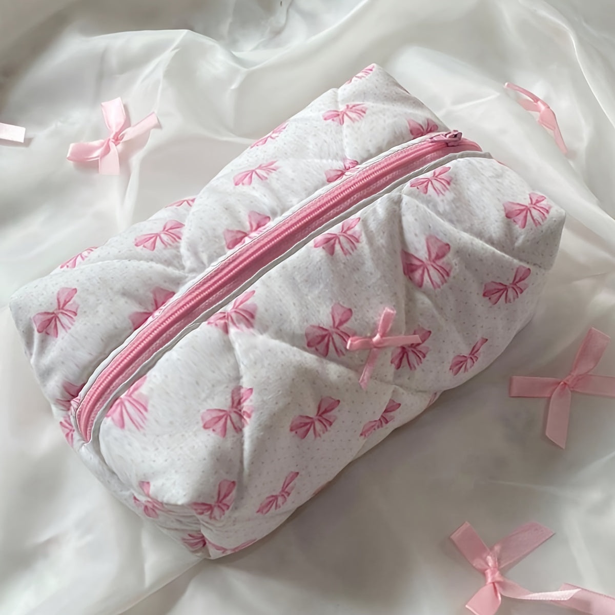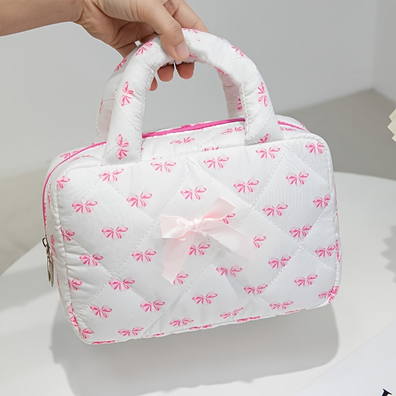Просторный портативный органайзер для макияжа с шикарным розовым принтом и бантиком, изготовленный из неводонепроницаемого полиэстера.