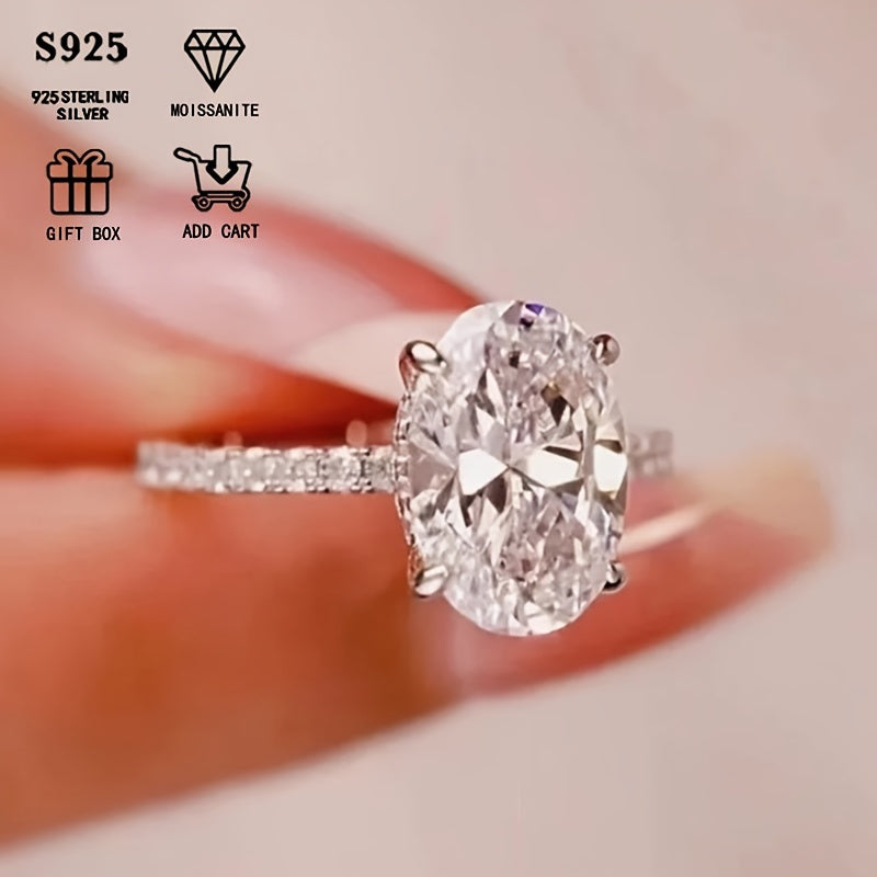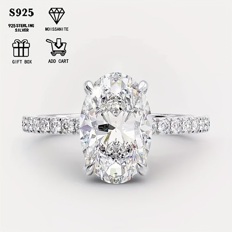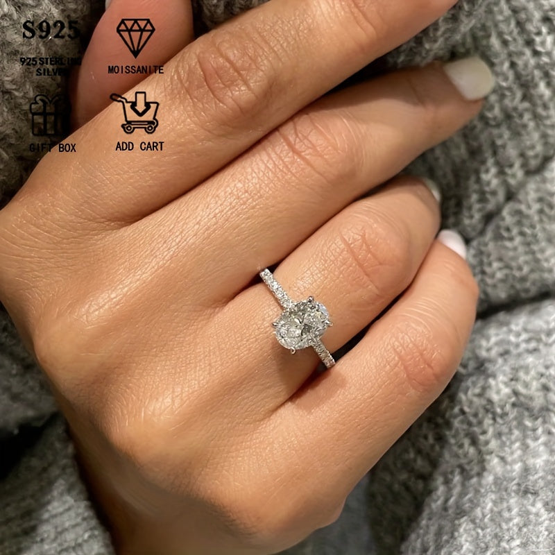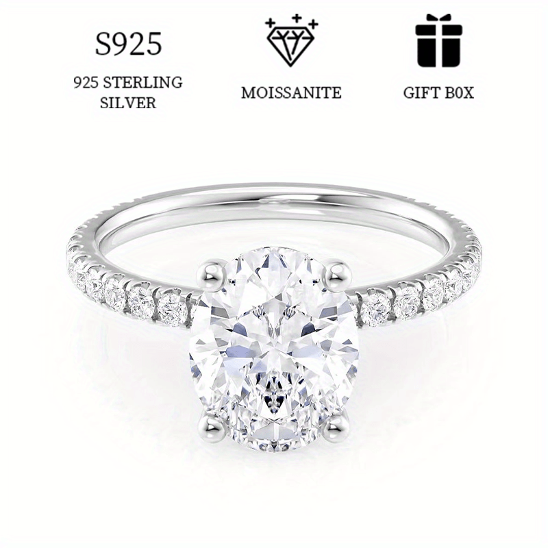 Серебряное обручальное кольцо с овальным моиссанитом, выполненное в элегантной 4-лапковой паве. Вечный модный аксессуар для женщин, идеальный для предложений, юбилеев, дней рождения и Дня матери. Поставляется в красивой подарочной коробке.