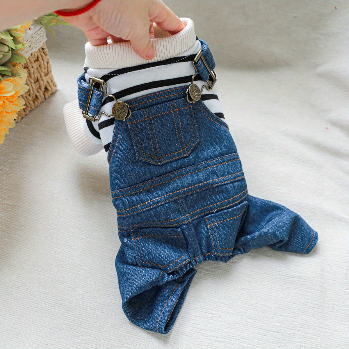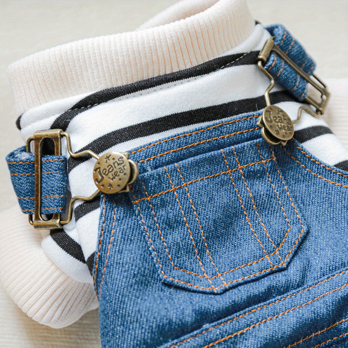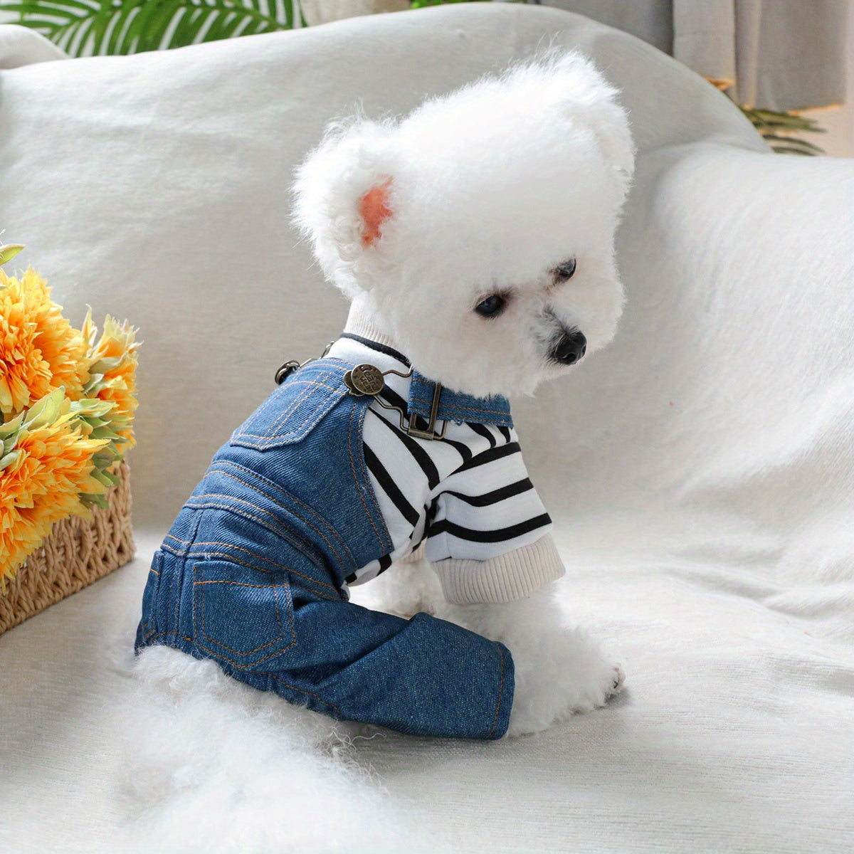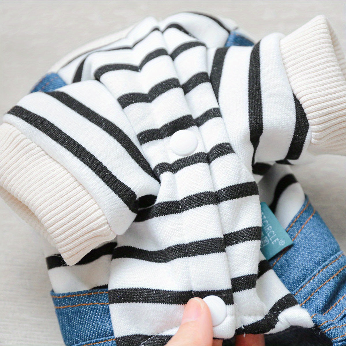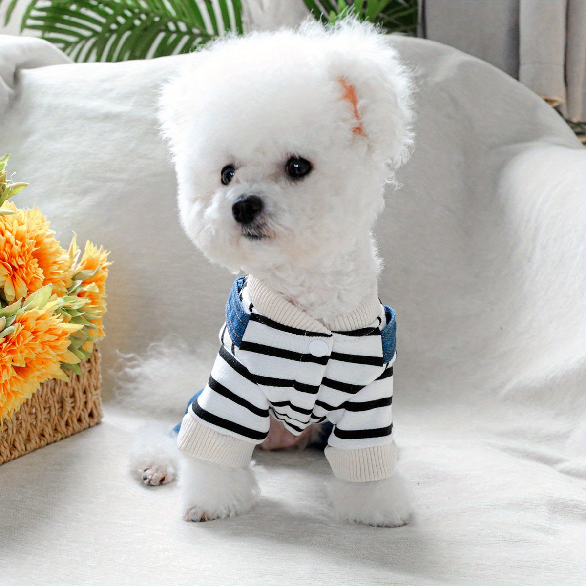 Рубашка в полоску из денима для мелких пород, таких как померанцы и йорки, с удобной кнопочной застежкой. Идеально подходит для всех сезонов.