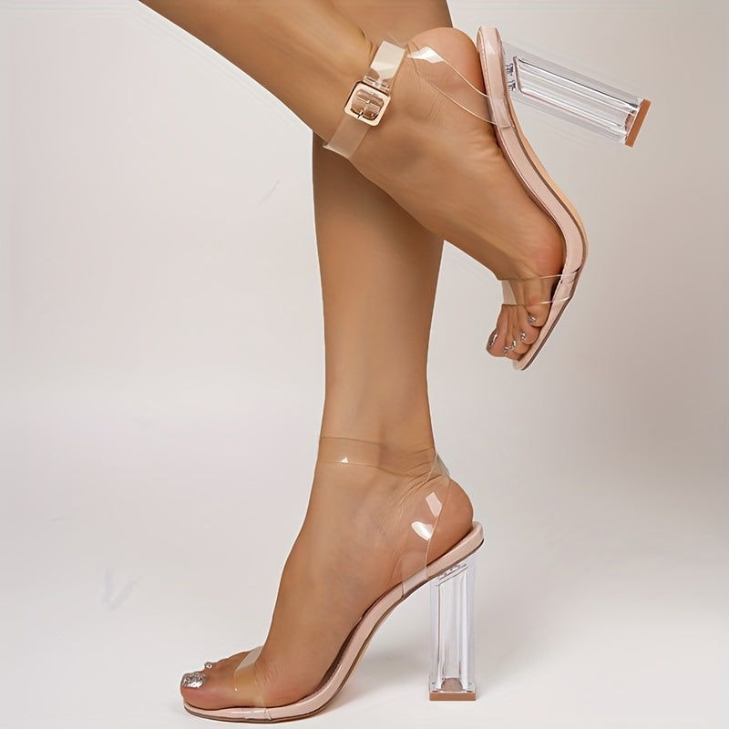 Стильные прозрачные блокированные каблуки с ремешком на щиколотке, открытым носком и резиновой подошвой.