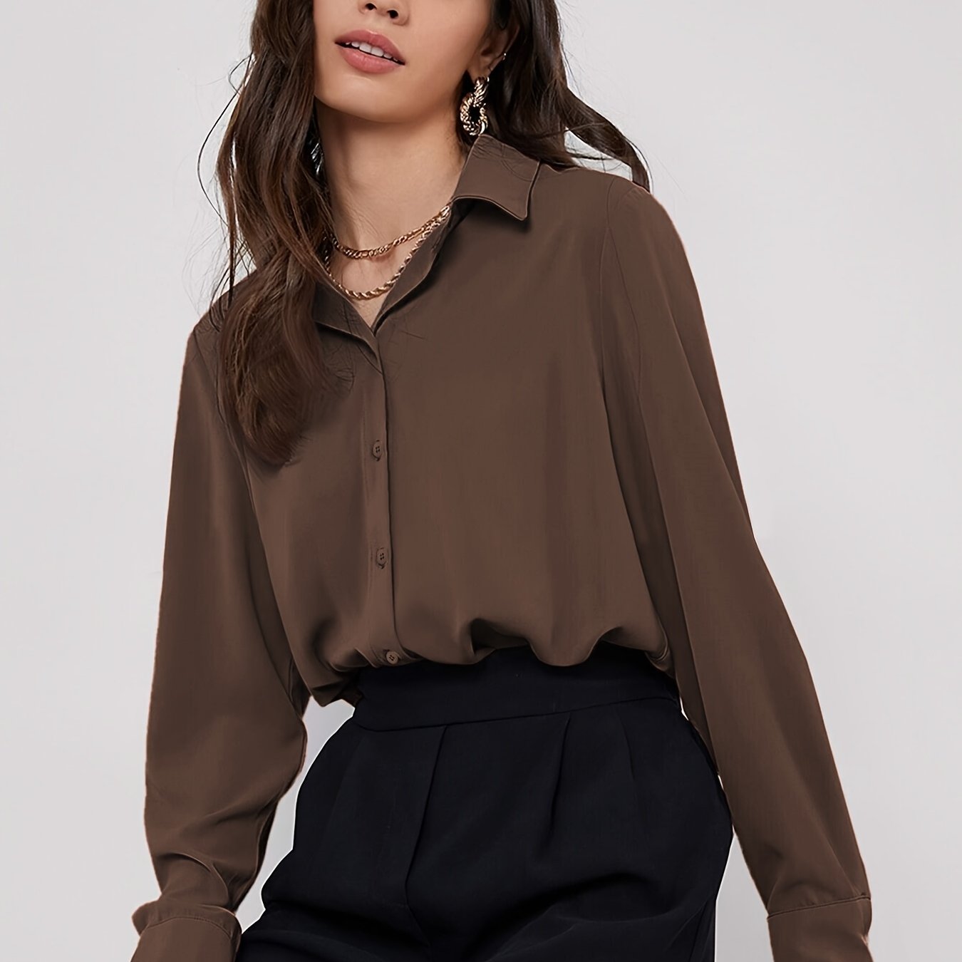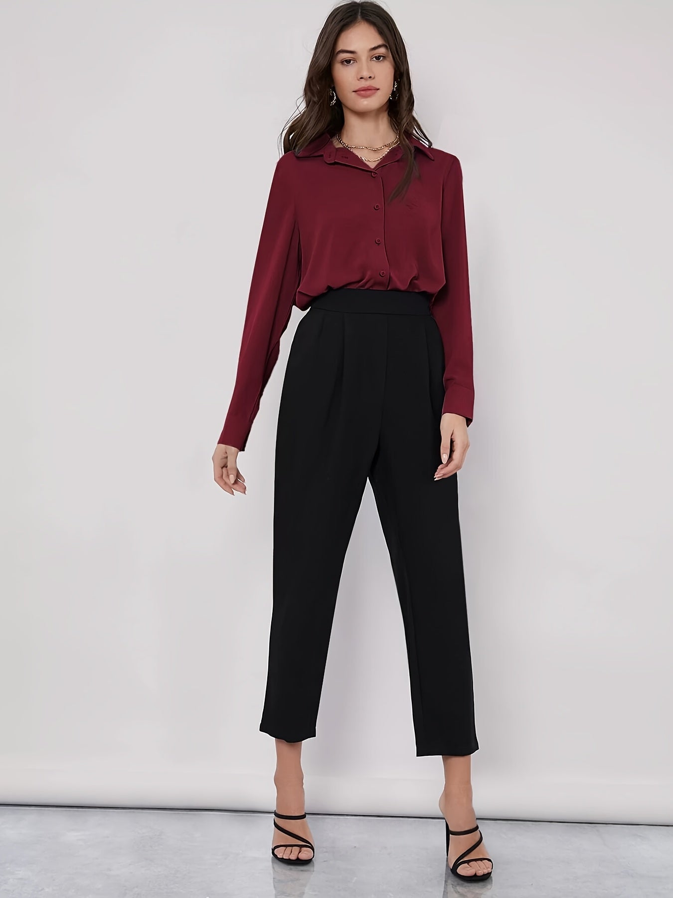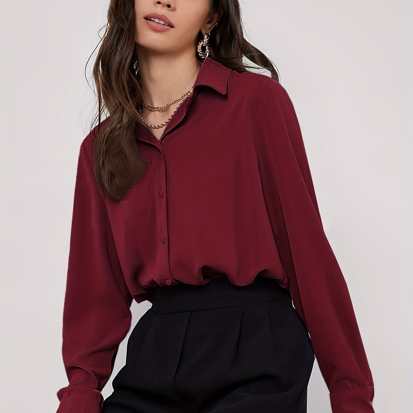 Стильная бордовая блузка с длинными рукавами и закругленным подолом, выполненная из полиэстерового смешанного материала, который можно стирать в машине. Идеально подходит для работы или повседневной носки.