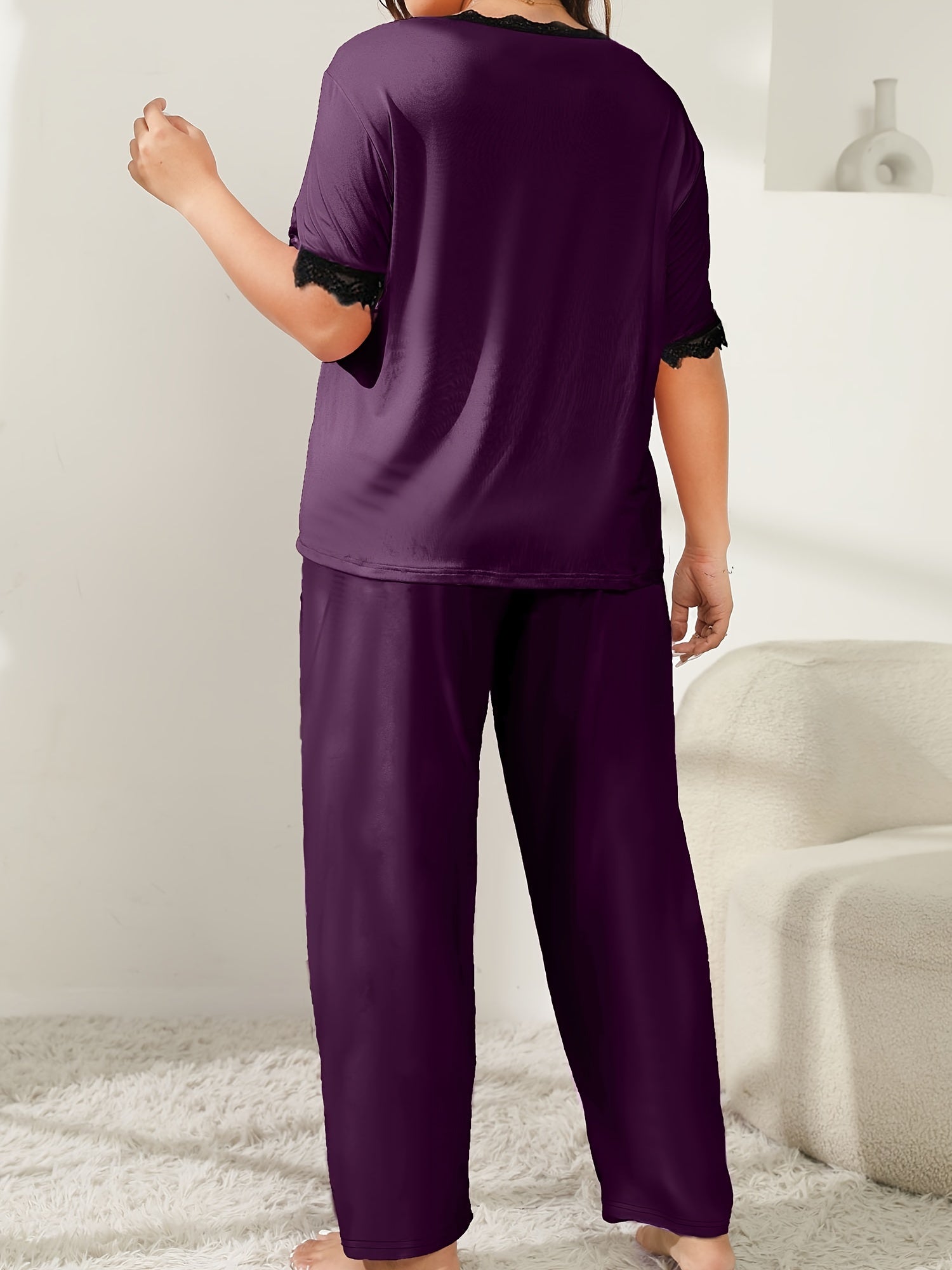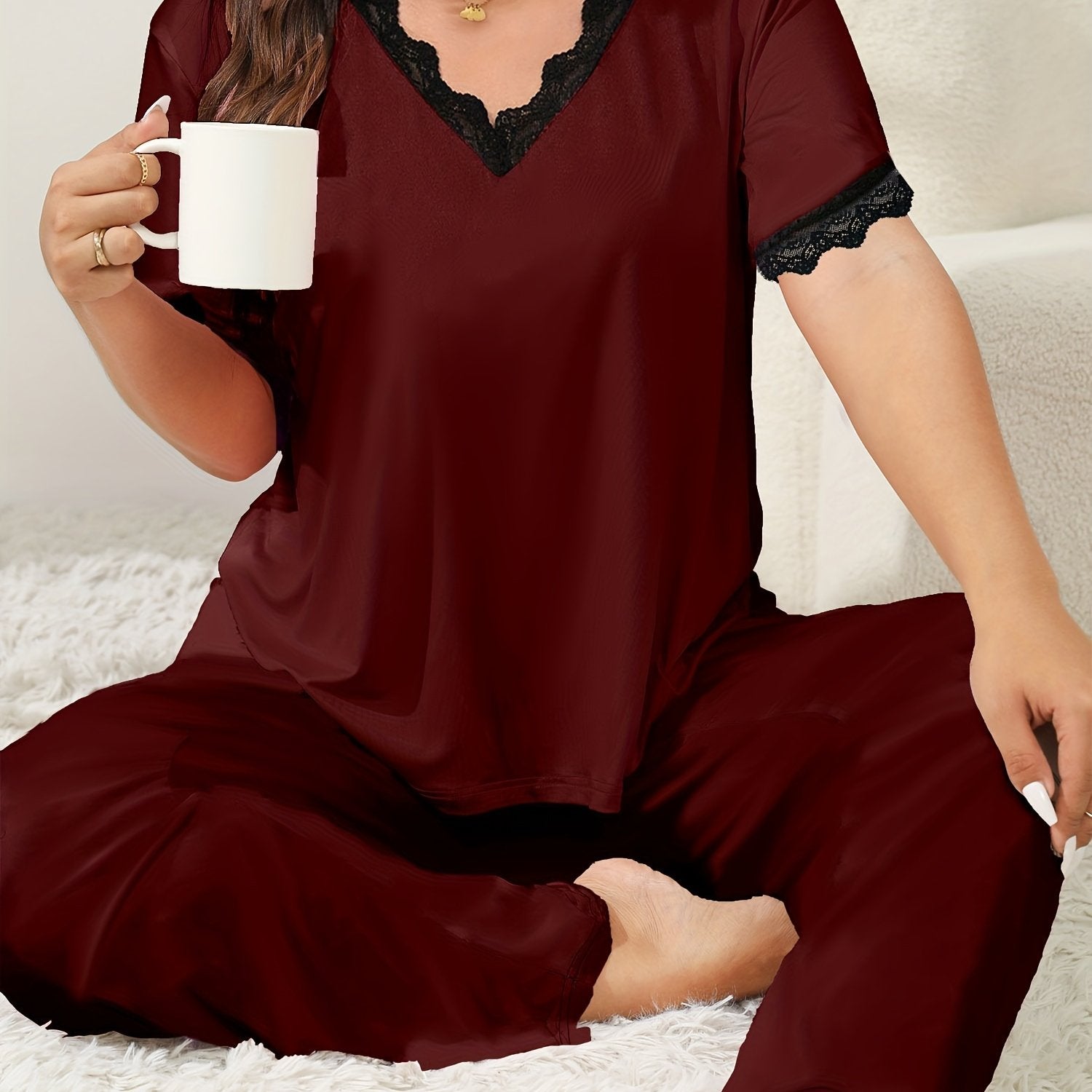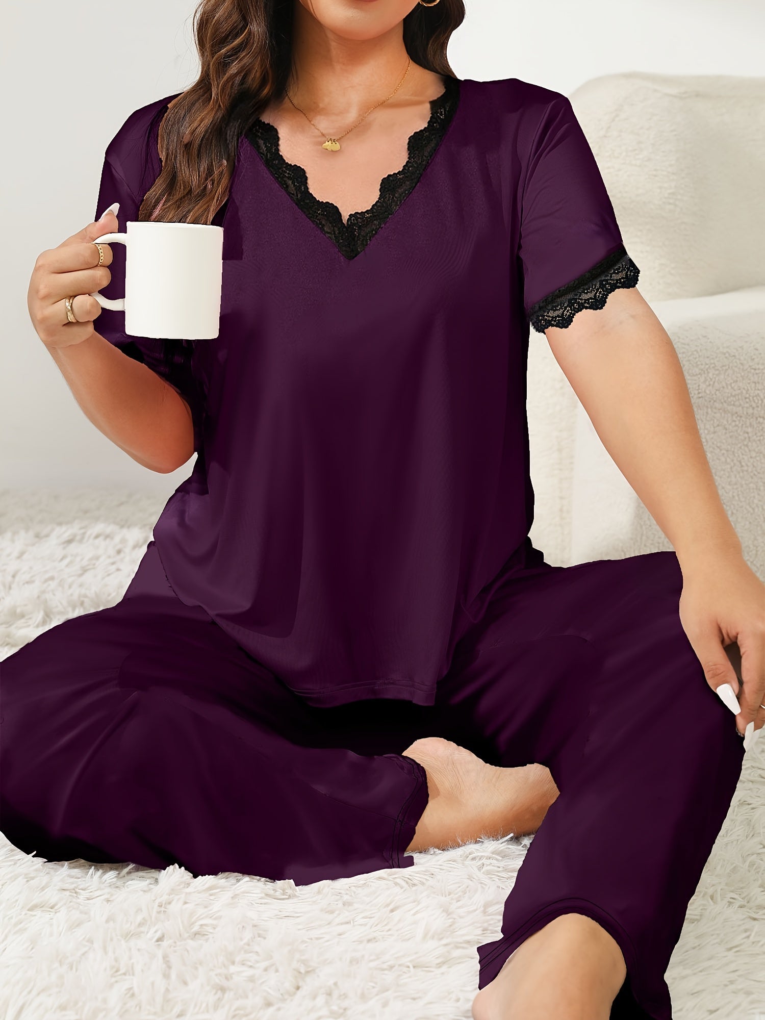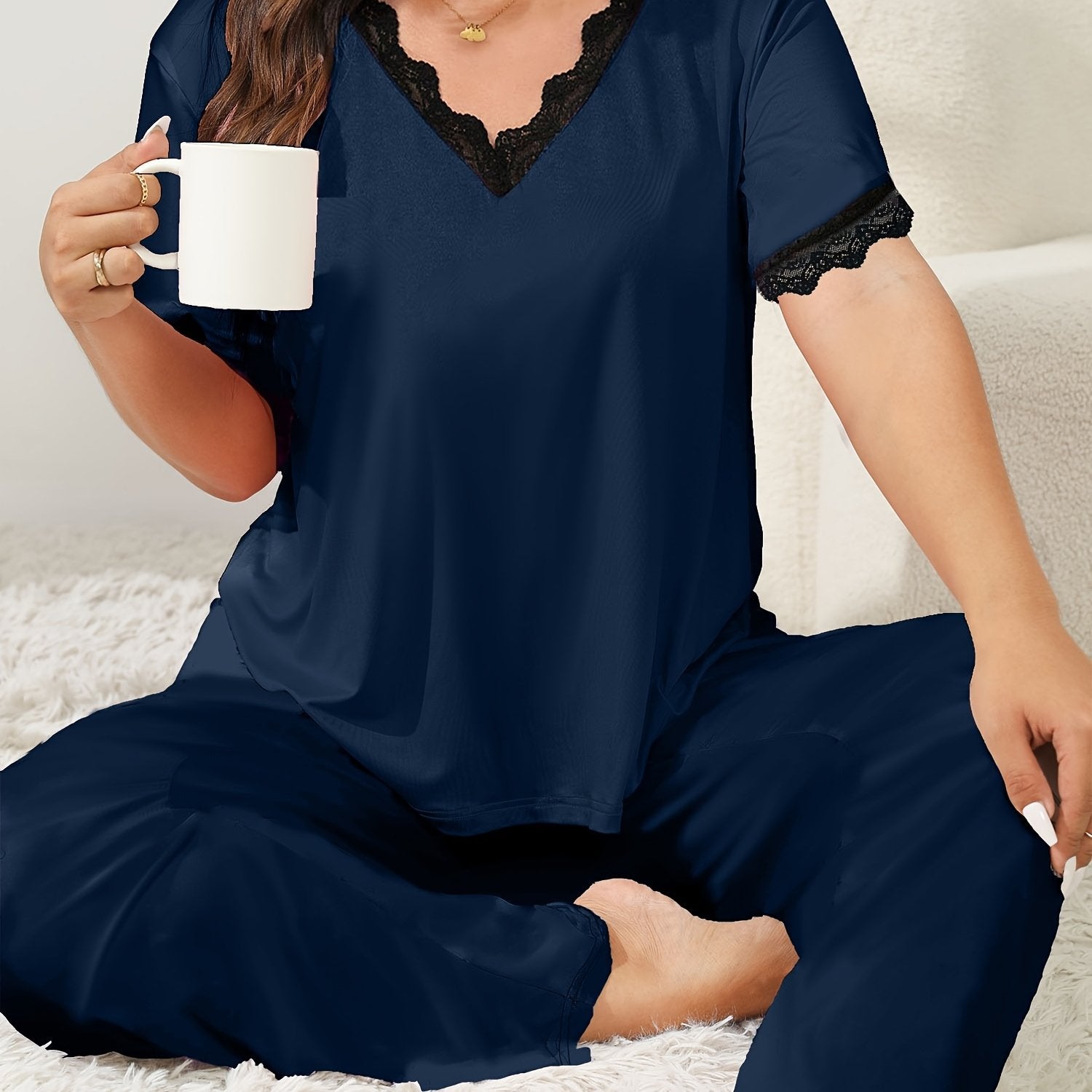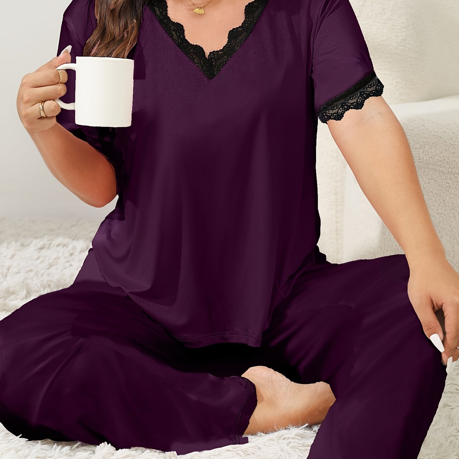 Пижама большого размера с V-образным вырезом и кружевной отделкой, полиэстеровое трикотажное изделие, всесезонная клетка и штаны