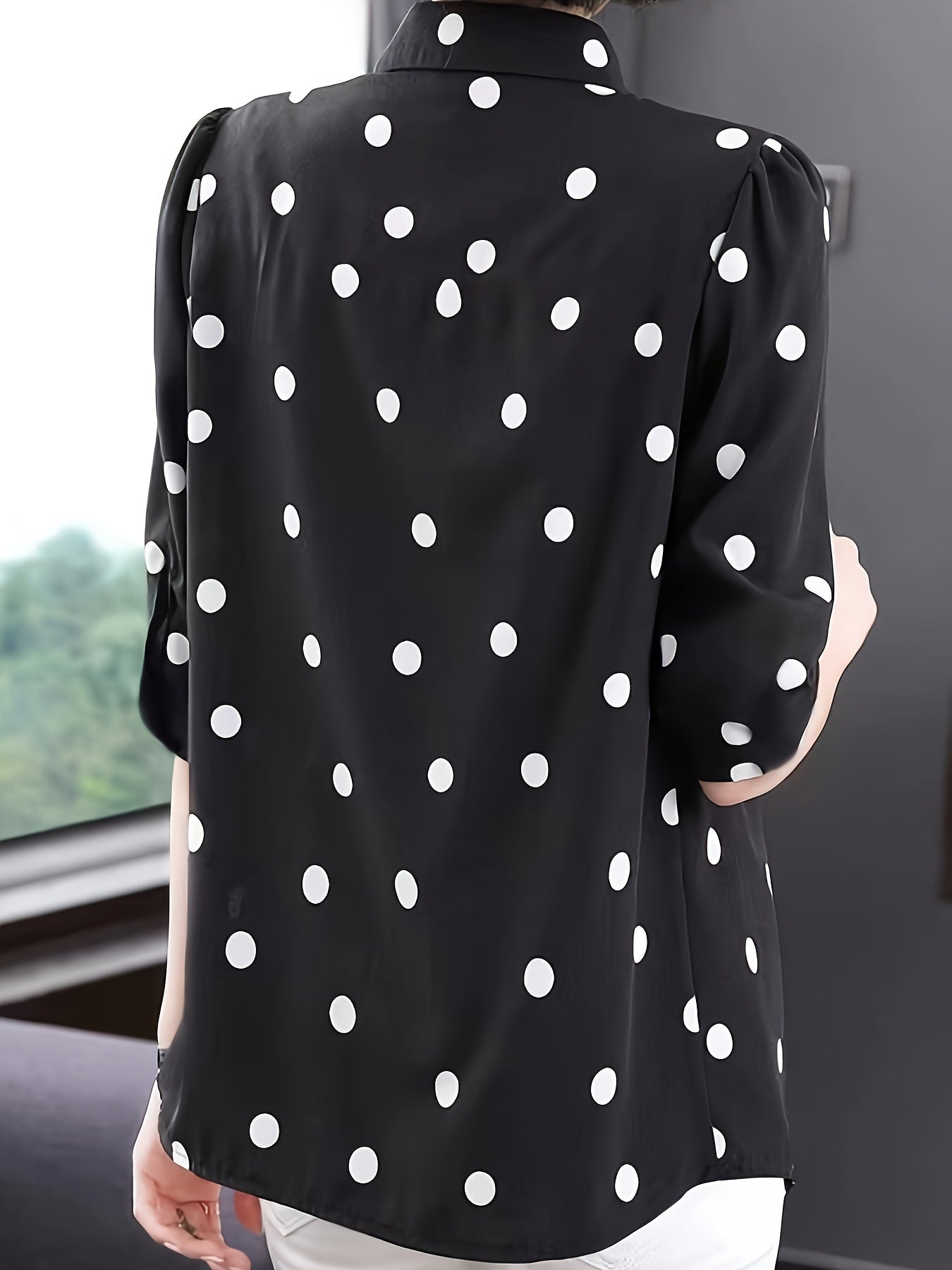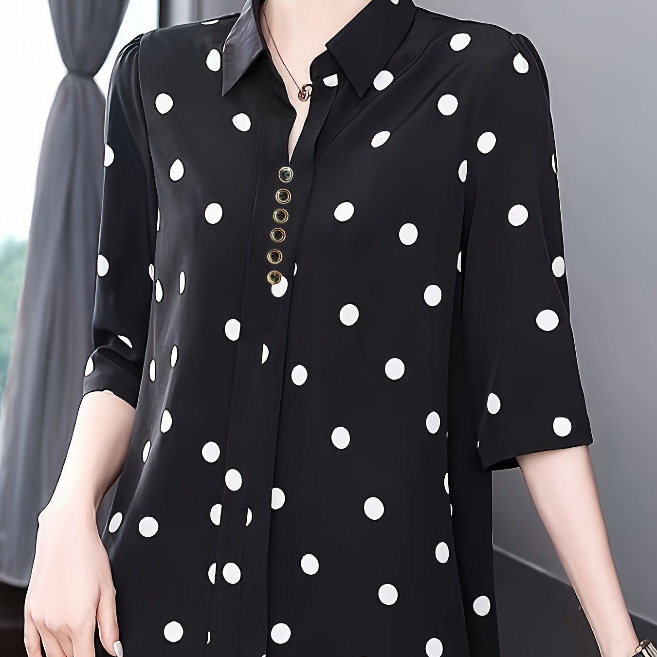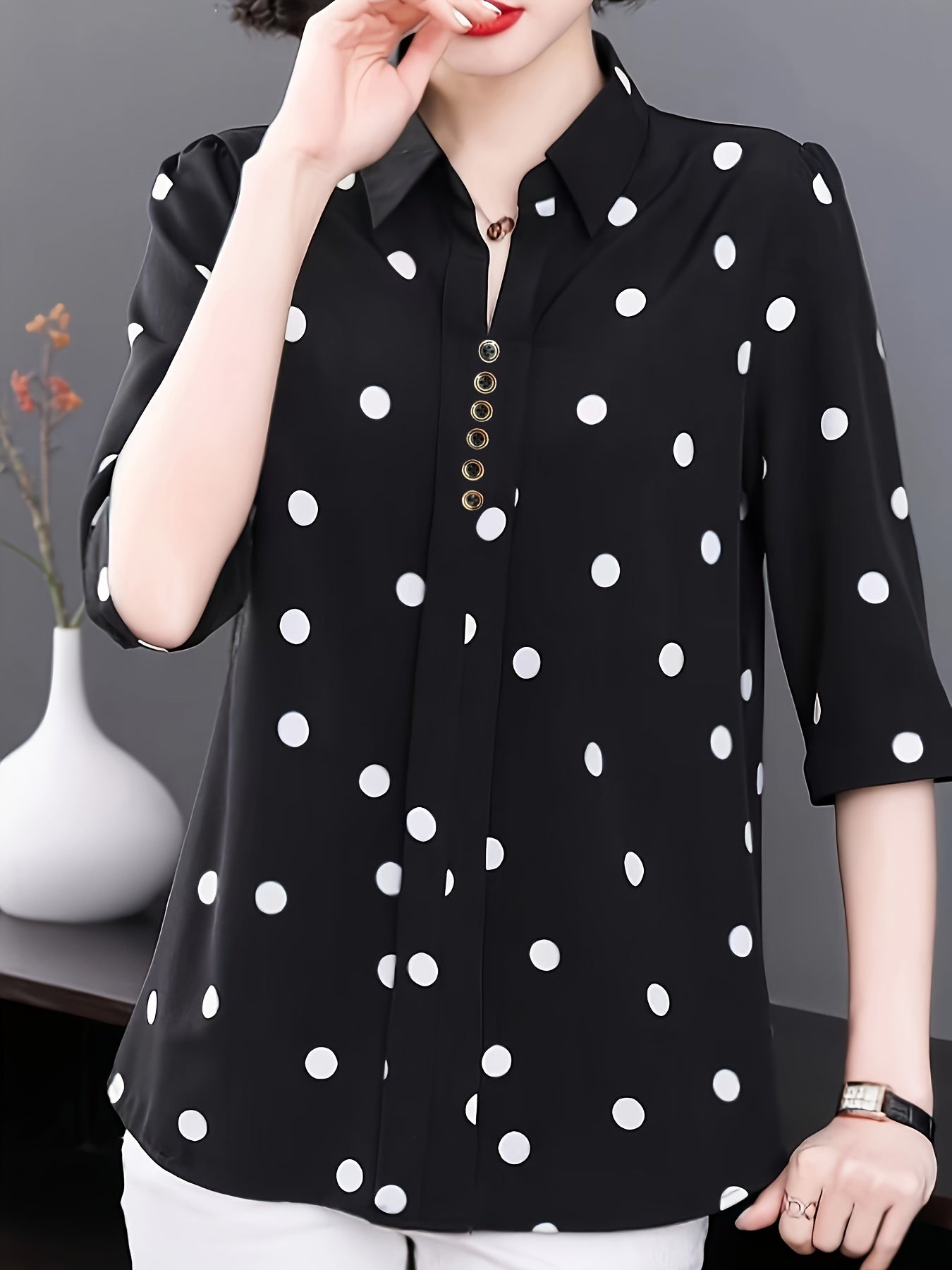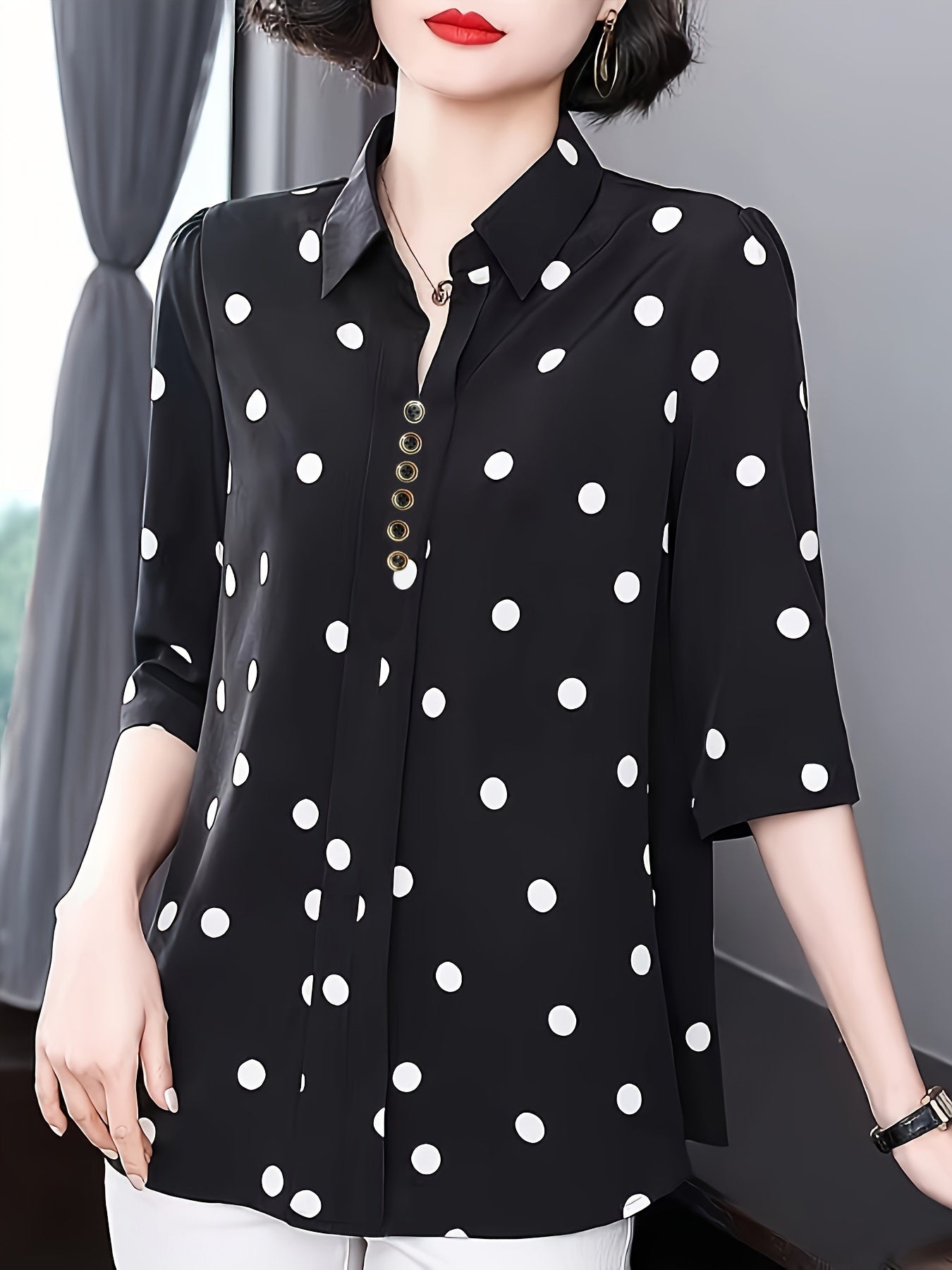 Стильная блузка в горошек для женщин - идеально подходит для летних отпусков. Изготовлена из полиэстера и машинной стирки с кнопочной деталью. Ткань без растяжки.