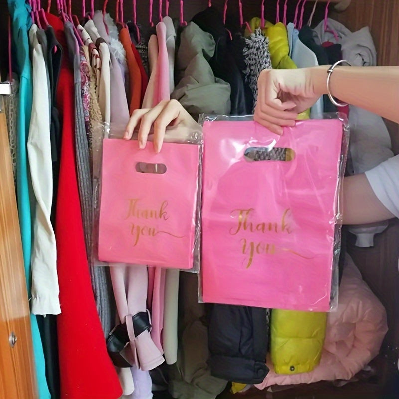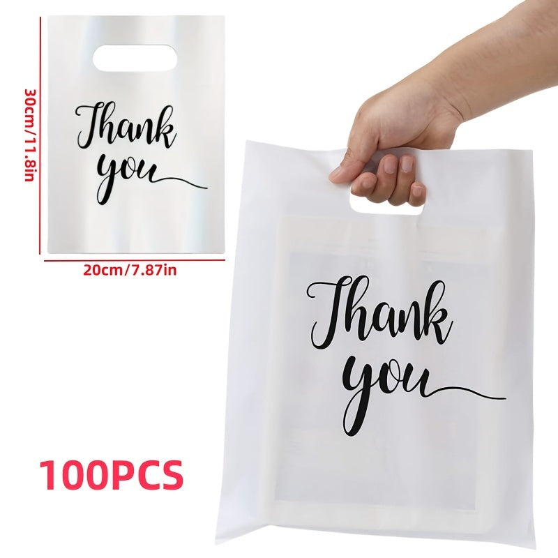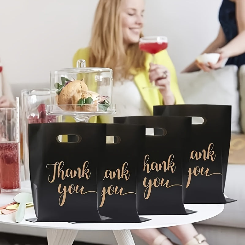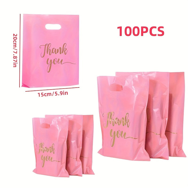 Стильные многоразовые пластиковые сумки-тоуты, идеальные для розничной торговли, бутиков, подарков, одежды и сувениров, с элегантным текстом "Спасибо" черного, белого и розового цветов с золотым курсивом.