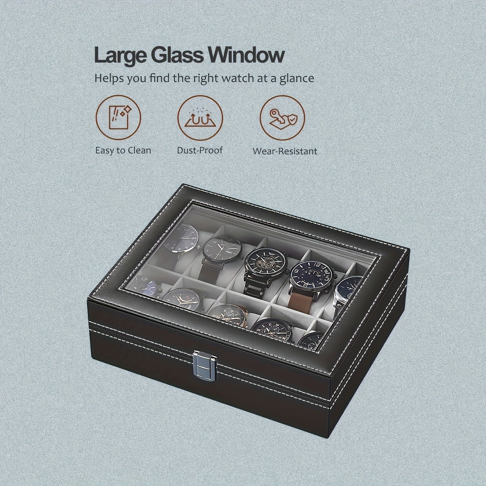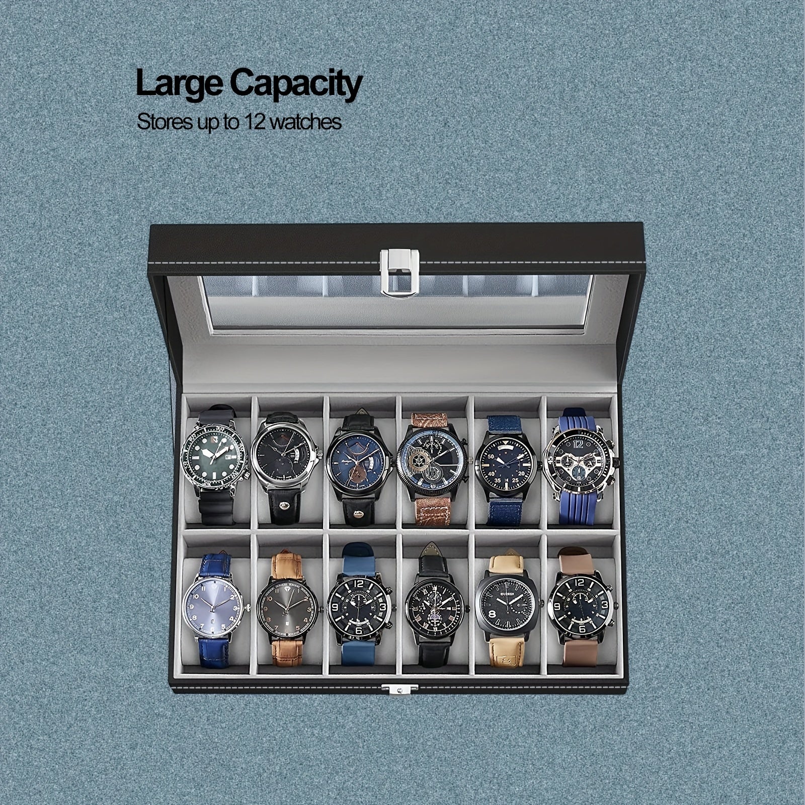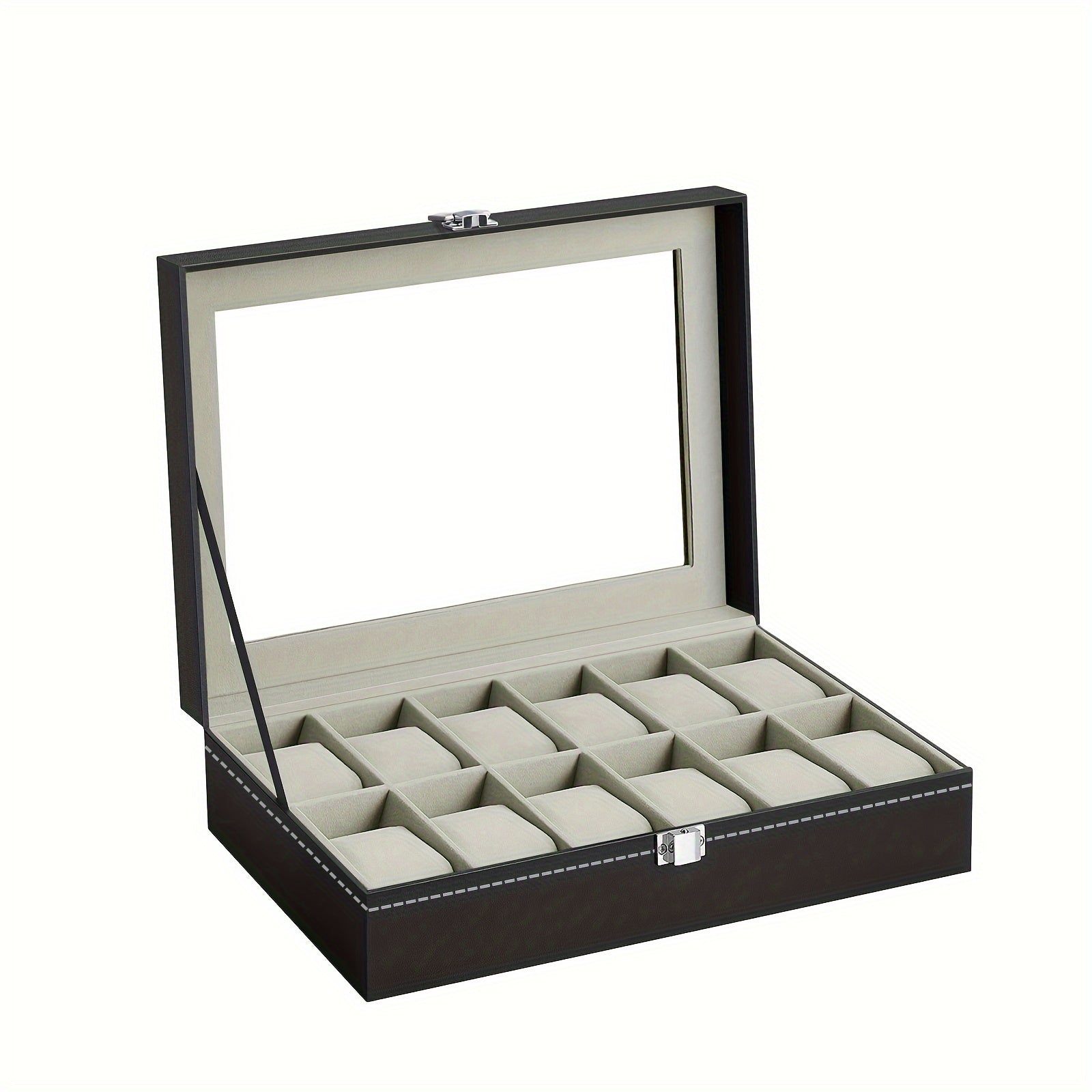 Эта коробка для хранения часов имеет 12 отсеков в стильном сером дизайне, с прозрачной крышкой и обивкой из PU-кожи. Это идеальный вариант подарка.
