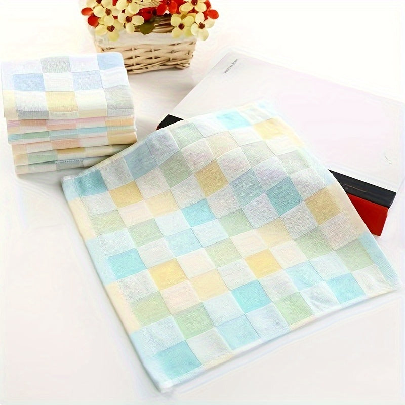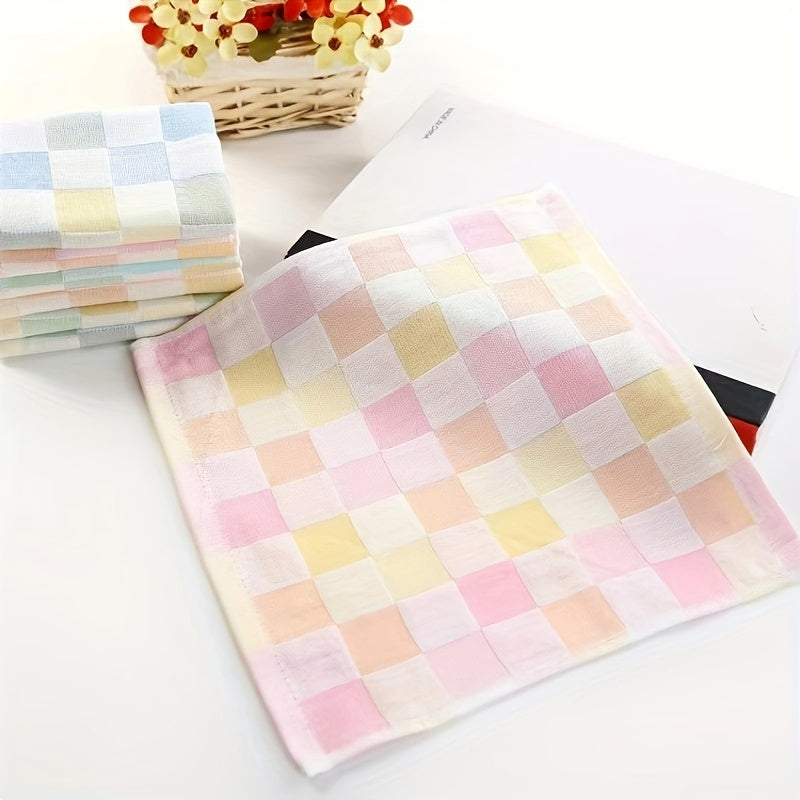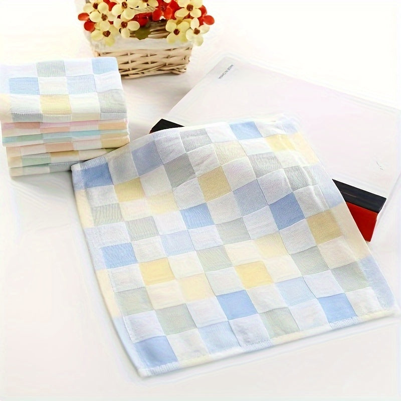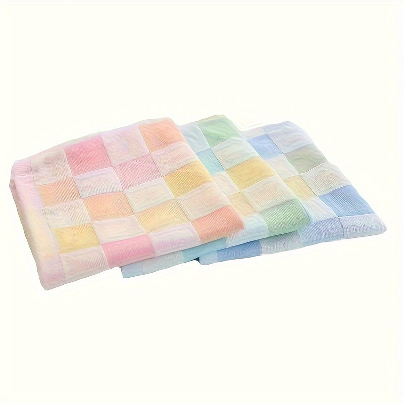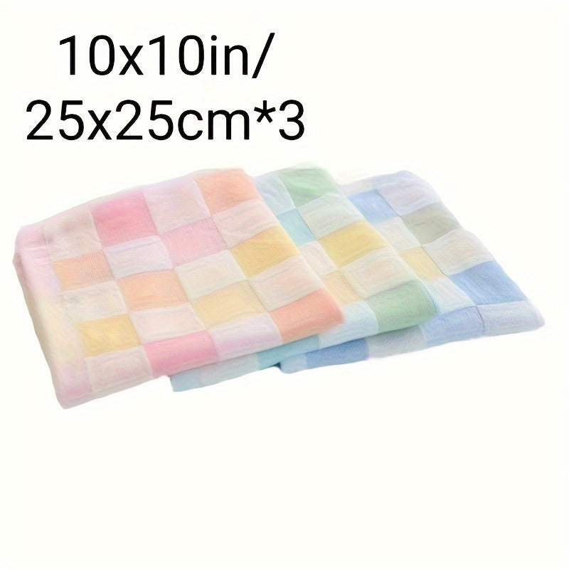 Три хлопковые марлевые полотенца в клетчатом дизайне, изготовленные из 100% легкой трикотажной ткани с современным мультяшным мотивом. Каждое полотенце имеет размер 25,4x25,4 см и плотность 30 г/м². Рекомендуется ручная стирка.
