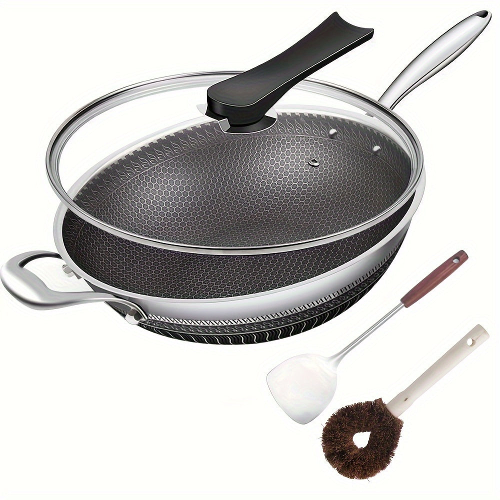 Сковорода из нержавеющей стали Tiroto с стеклянной крышкой, лопаткой и кисточкой - диаметр 34,04 см, утолщенное плоское дно для всех типов плит, включая индукционные, газовые и керамические.