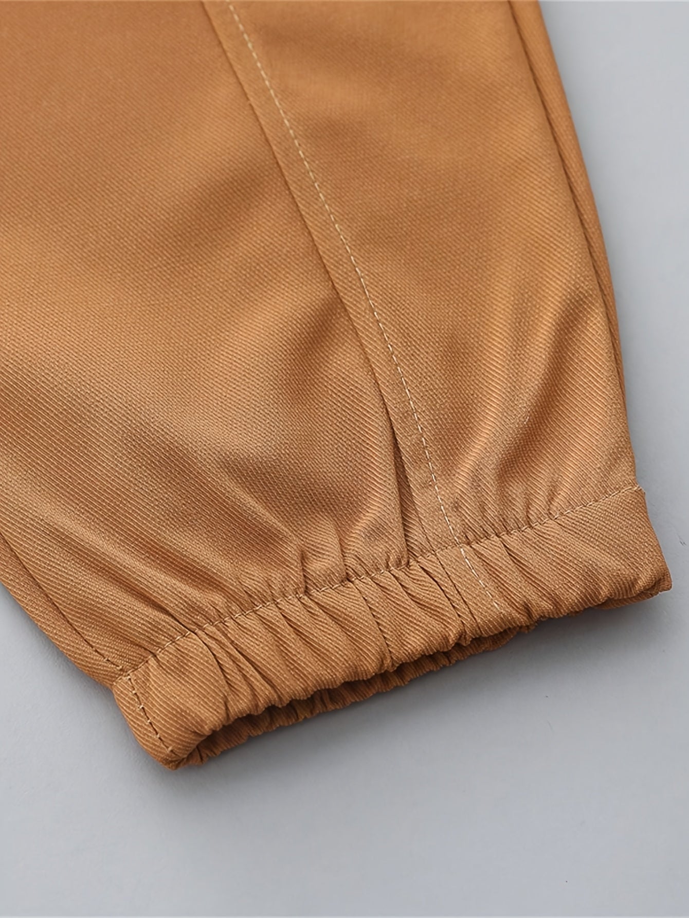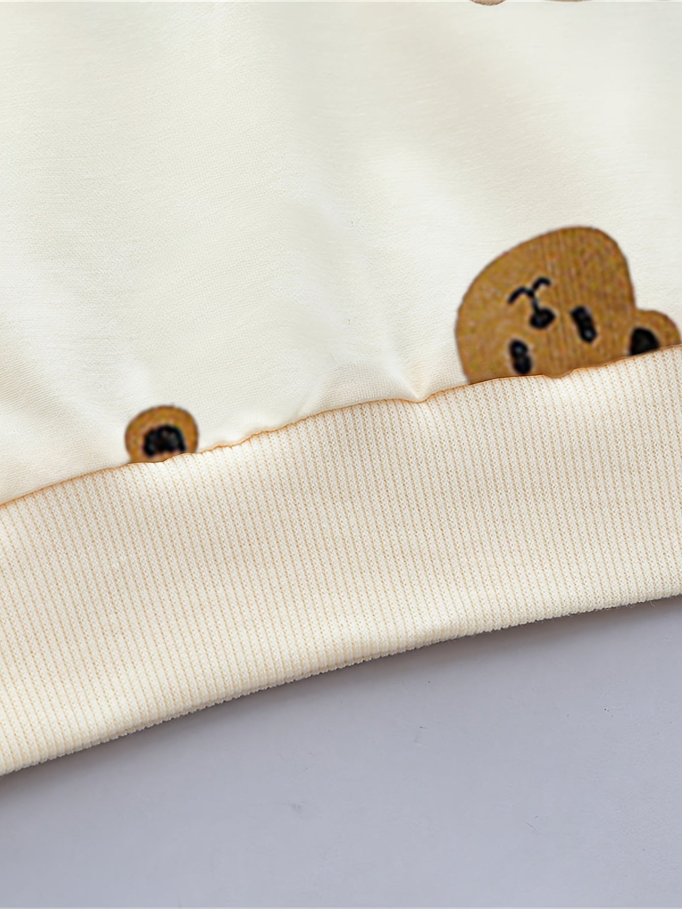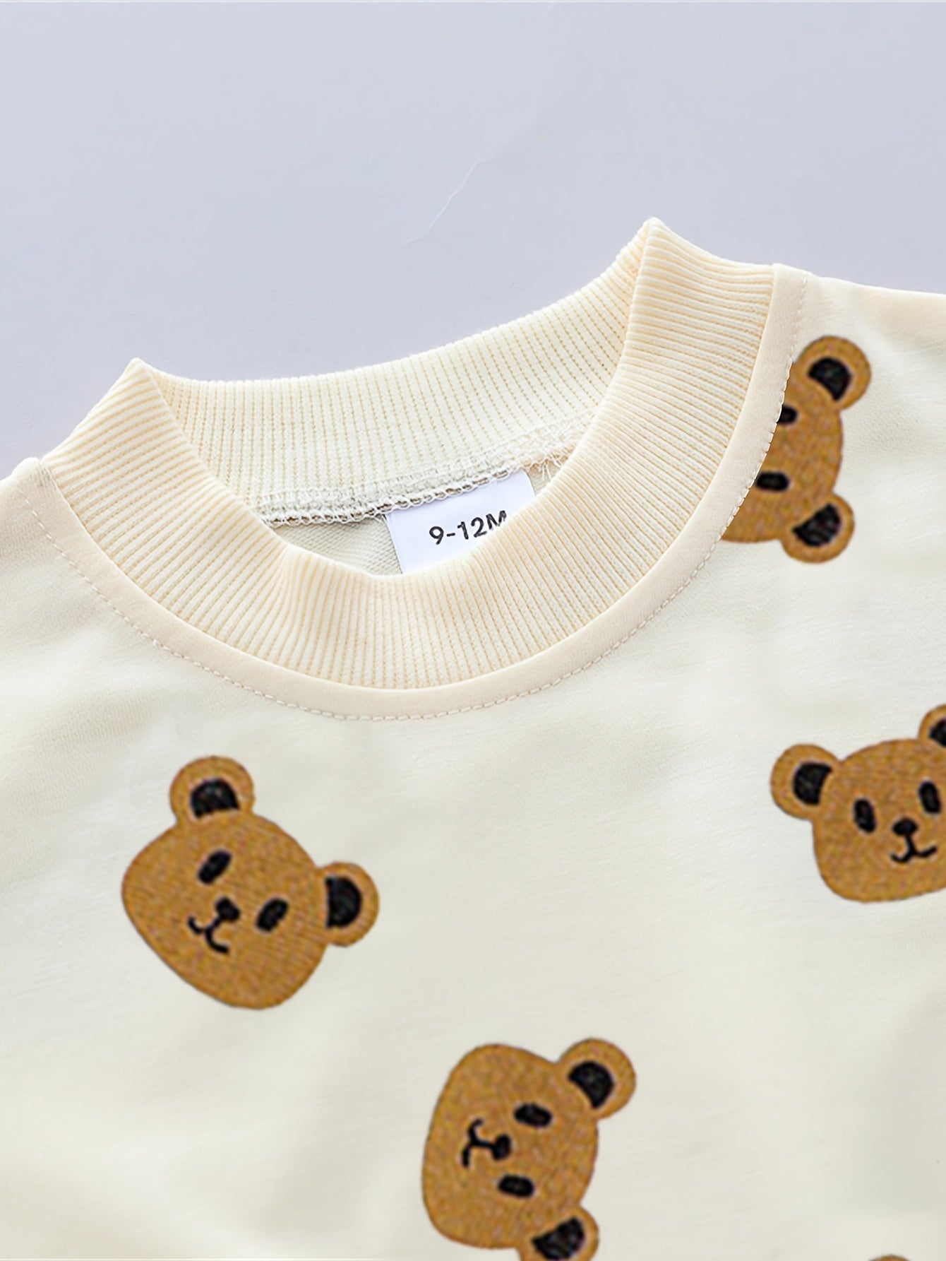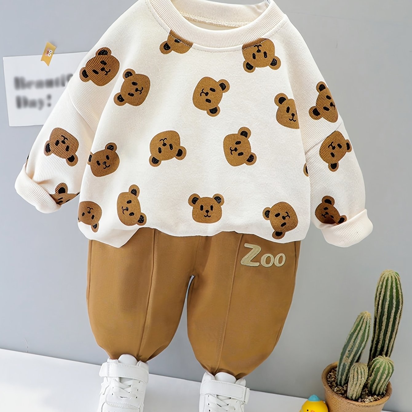 Милый комплект свитера и брюк с принтом медведя для мальчиков-младенцев с круглым вырезом. Изготовлен из полиэстерового трикотажа с обычной посадкой и легкой эластичностью. С животным узором, подходит для весны/осени.