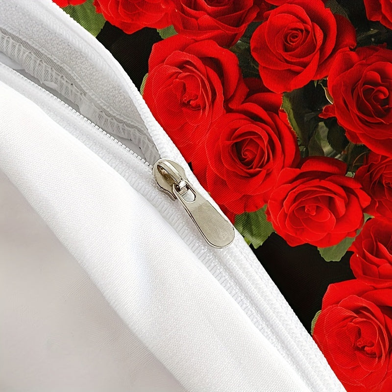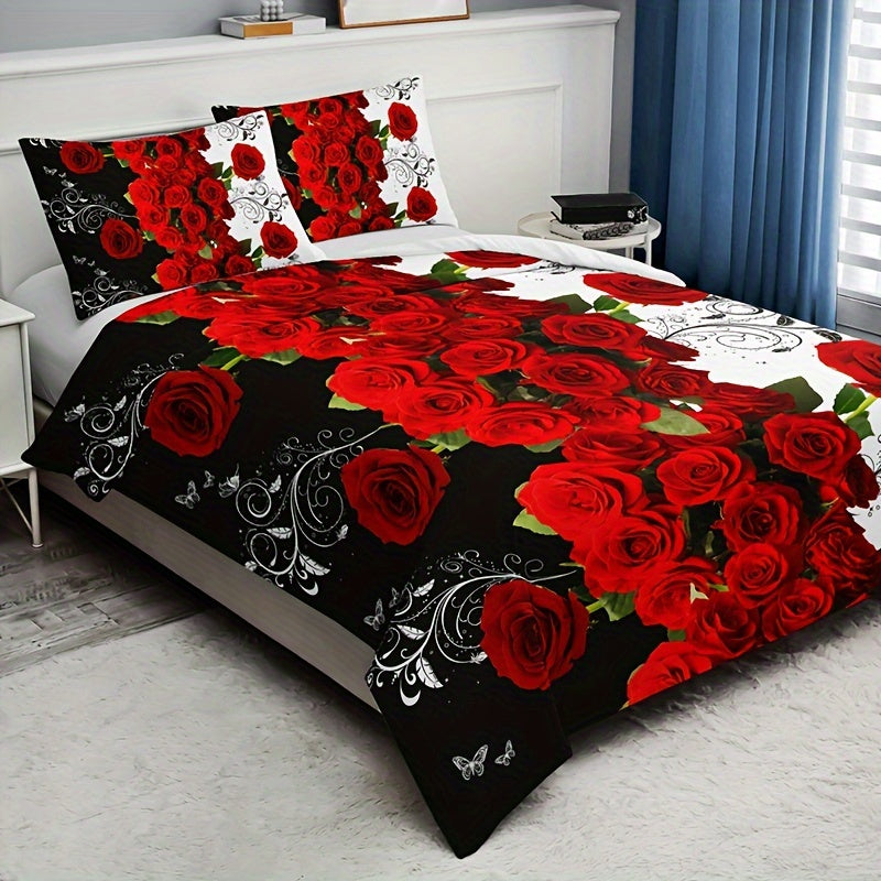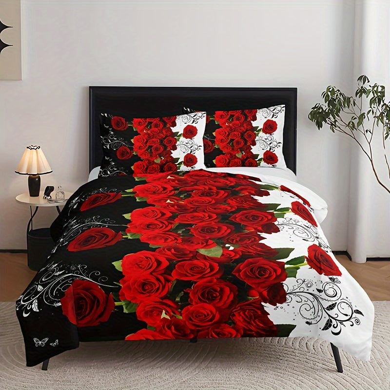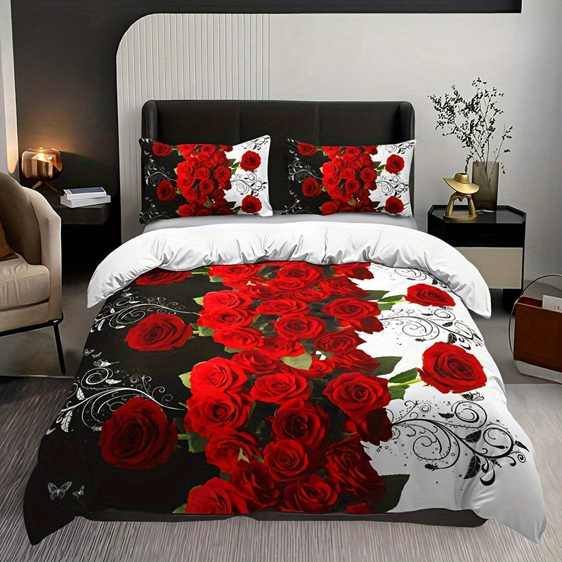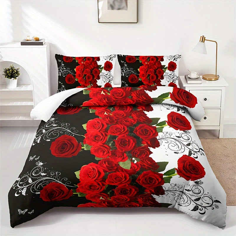 Комплект постельного белья с принтом красной розы, 3 предмета: наволочка и пододеяльник, мягкий и комфортный