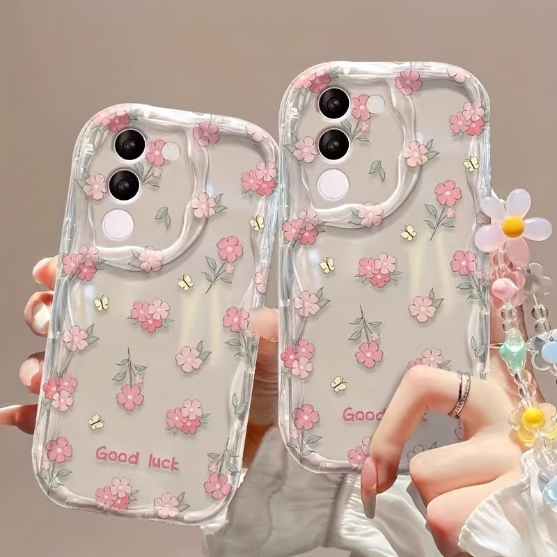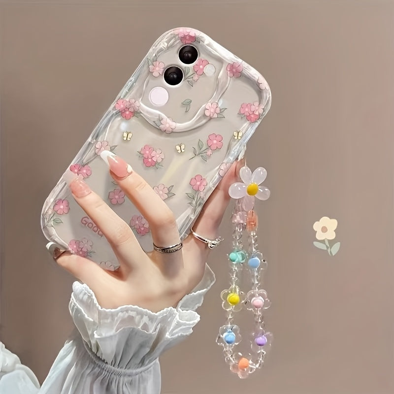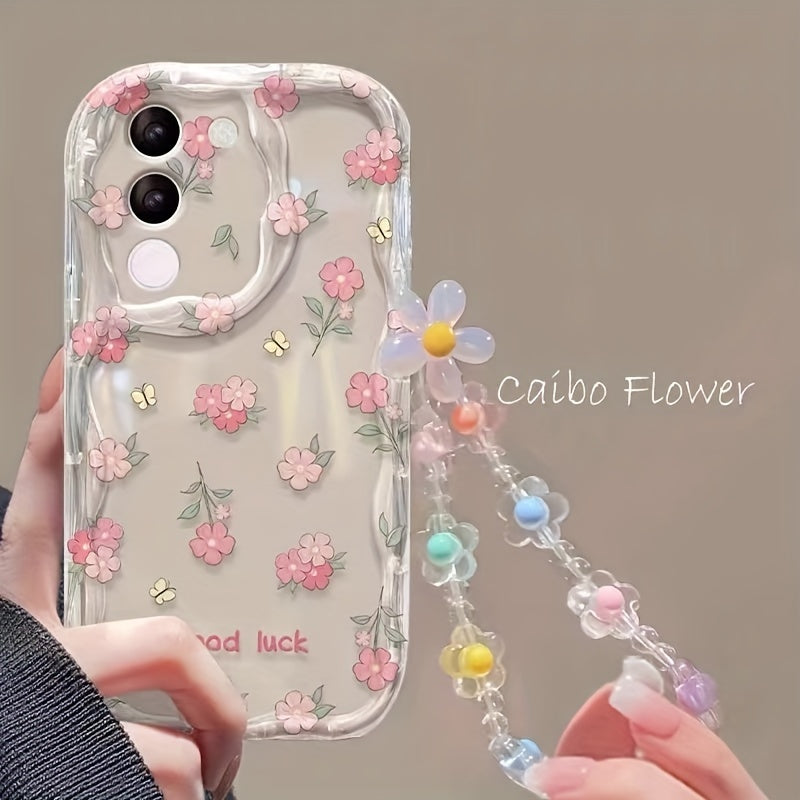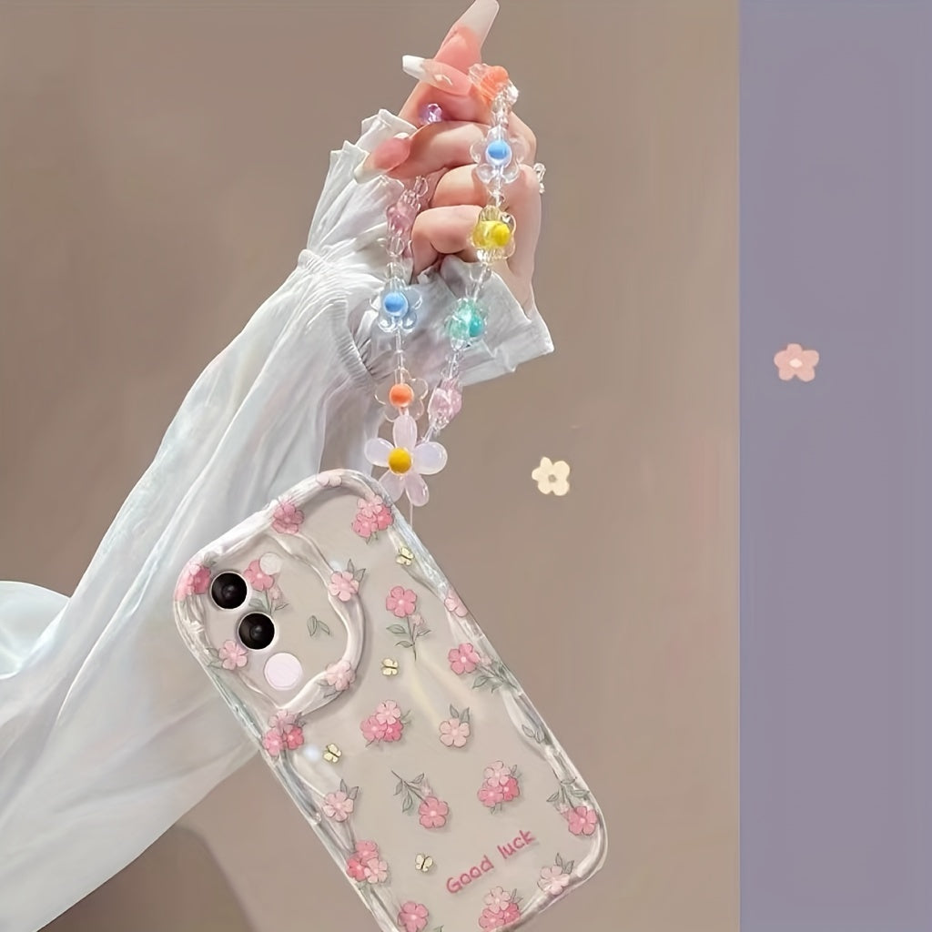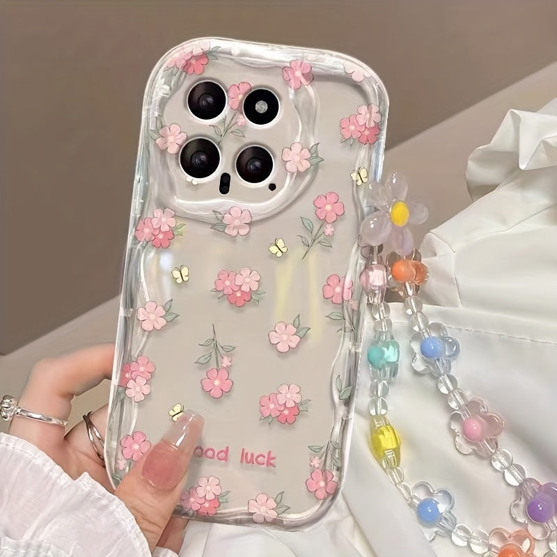 Прозрачный чехол для цветов из порошка для Galaxy S24 Ultra и S24 FE, подходит для защиты S25 Ultra и A15. Включает мягкий корпус с кремовым узором, ручную цепочку из цветочных бусин и