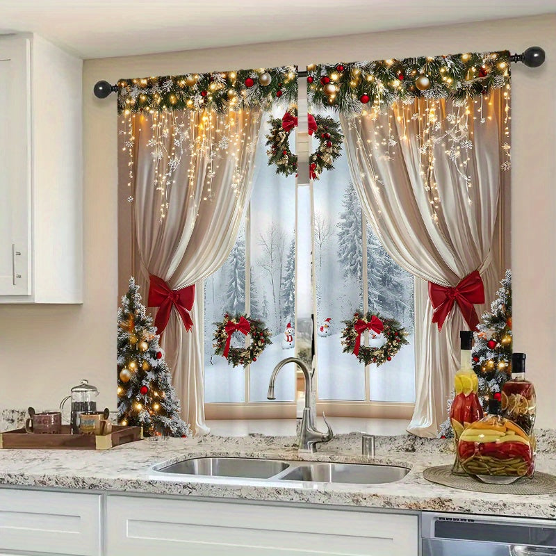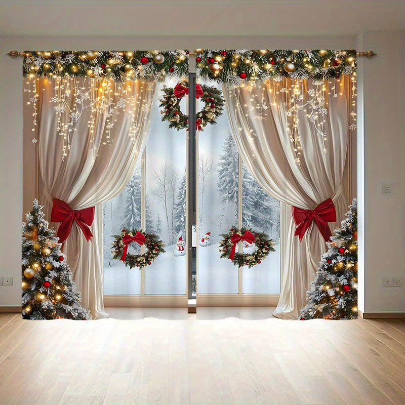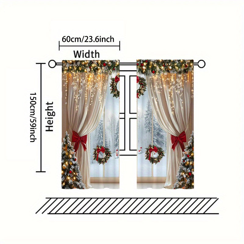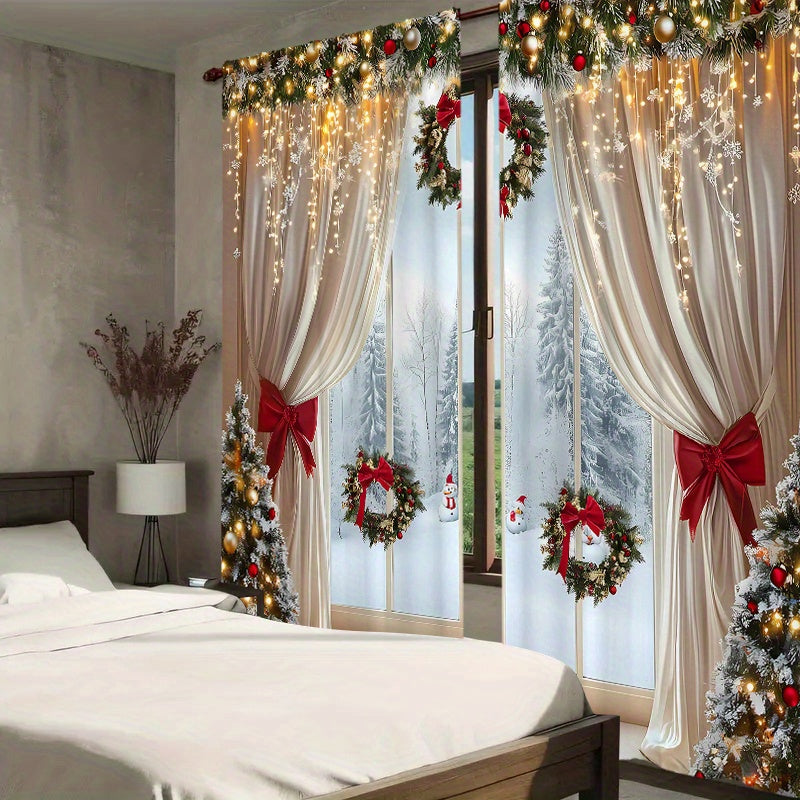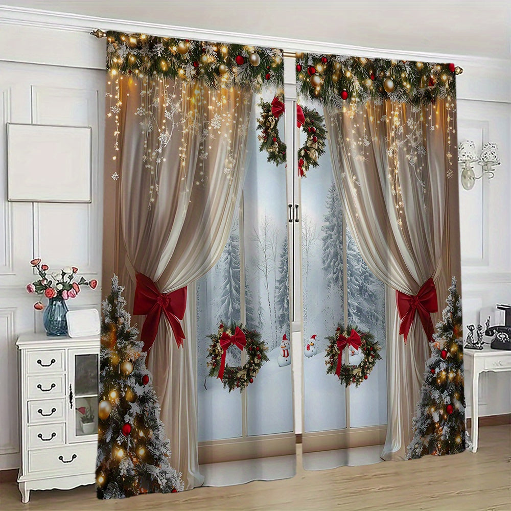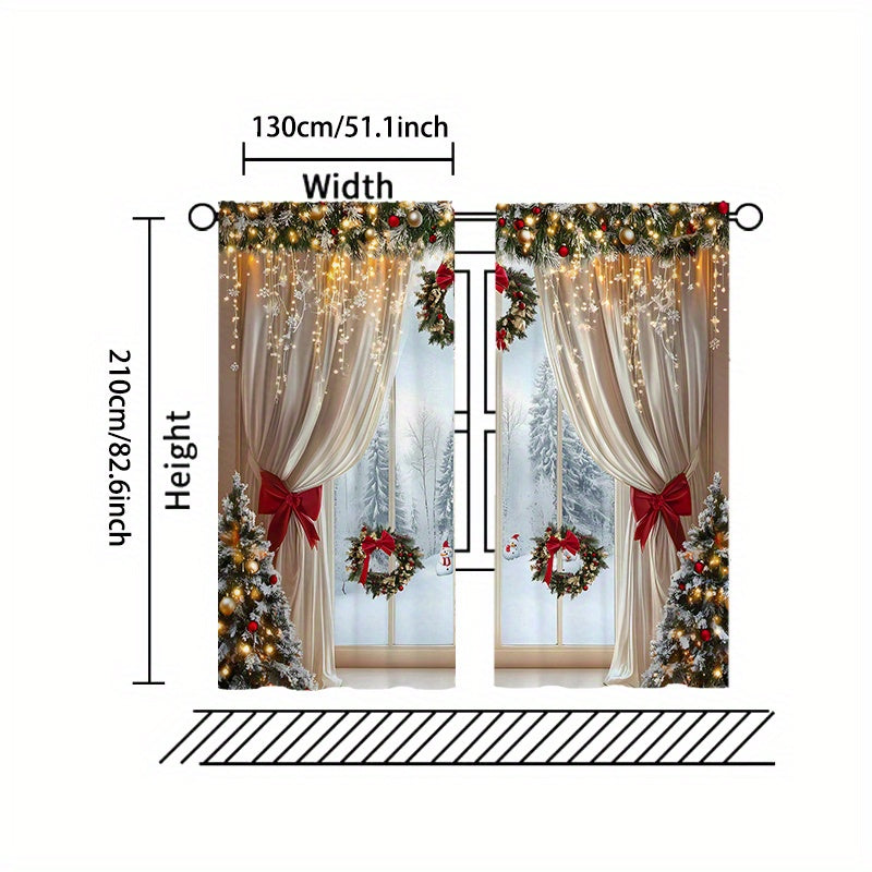 Два куска роскошных рождественских штор в европейском стиле с дизайном, украшенным золотыми элементами. Эти шторы полупрозрачные, имеют удобное отверстие для штанги и подходят для украшения гостиных, спален и офисов в течение