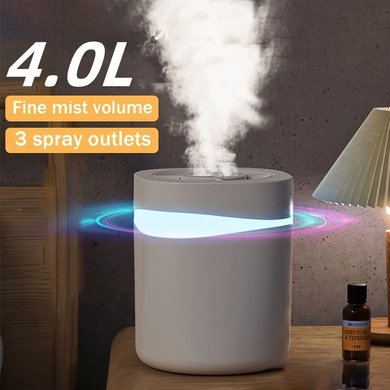 Увлажнитель воздуха с большой емкостью 4,0 л, работающий от USB, с холодным туманом. Тихая работа, выполняет функции аромадиффузора и увлажнителя с тремя выходами для тумана. Не перезаряжаемый, предлагает различные настройки тумана.