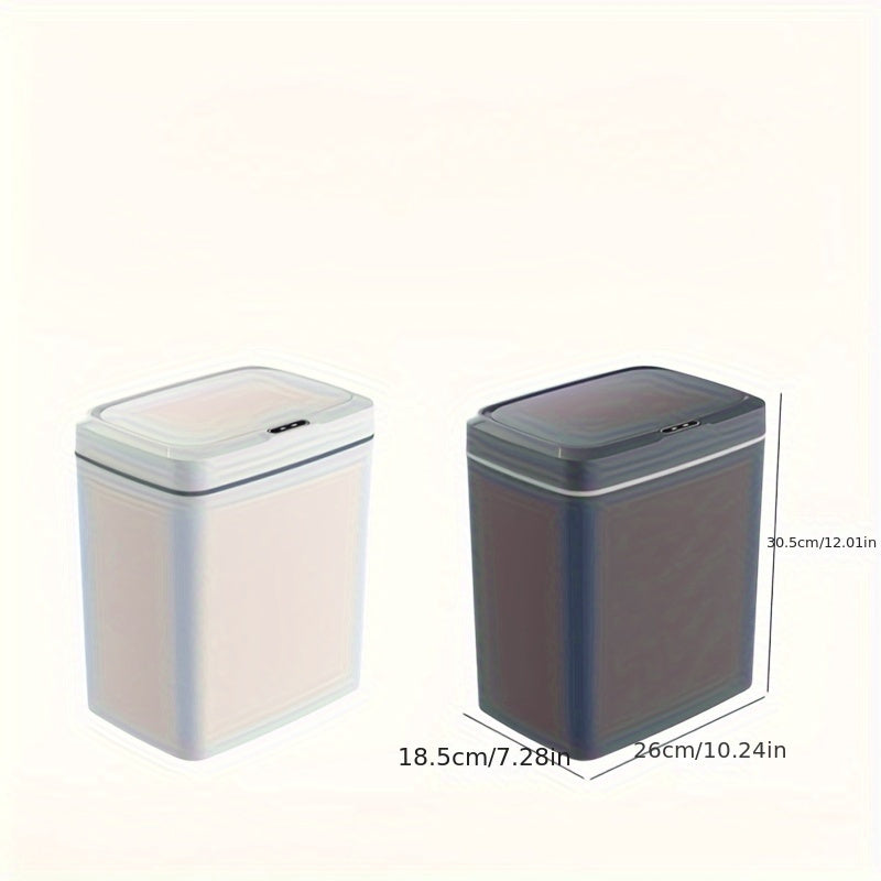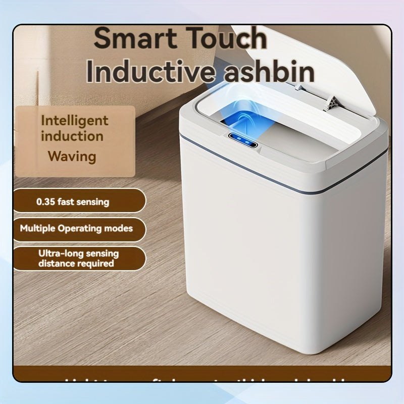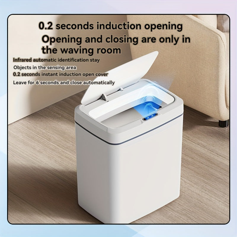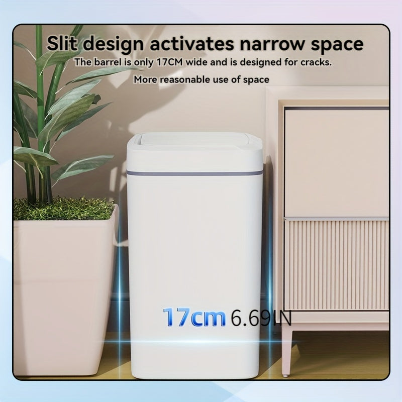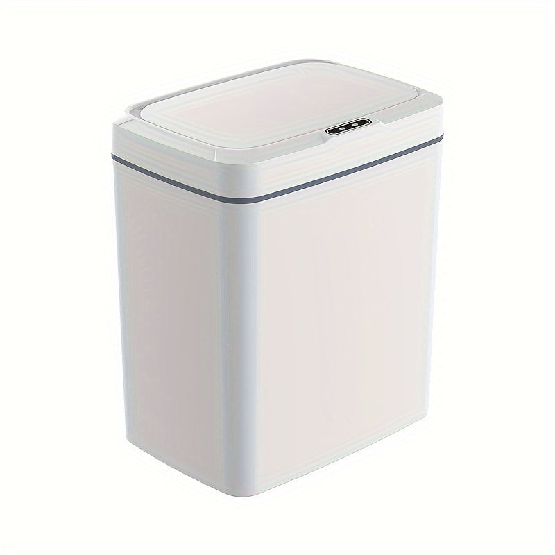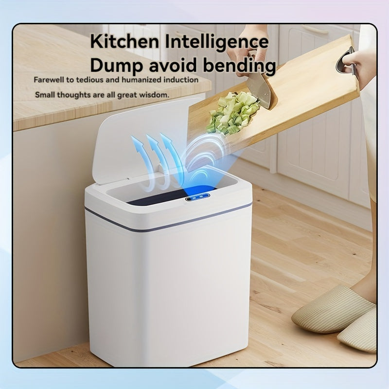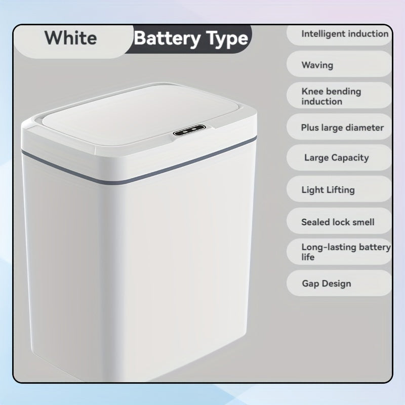Белая умная мусорная корзина с автоматическим открыванием, инфракрасным сенсором и кнопочным управлением для домашнего и офисного использования.