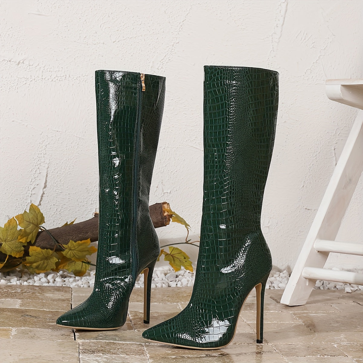 Женские сапоги с узором из крокодиловой кожи по колено, всесезонные, на молнии, на шпильке