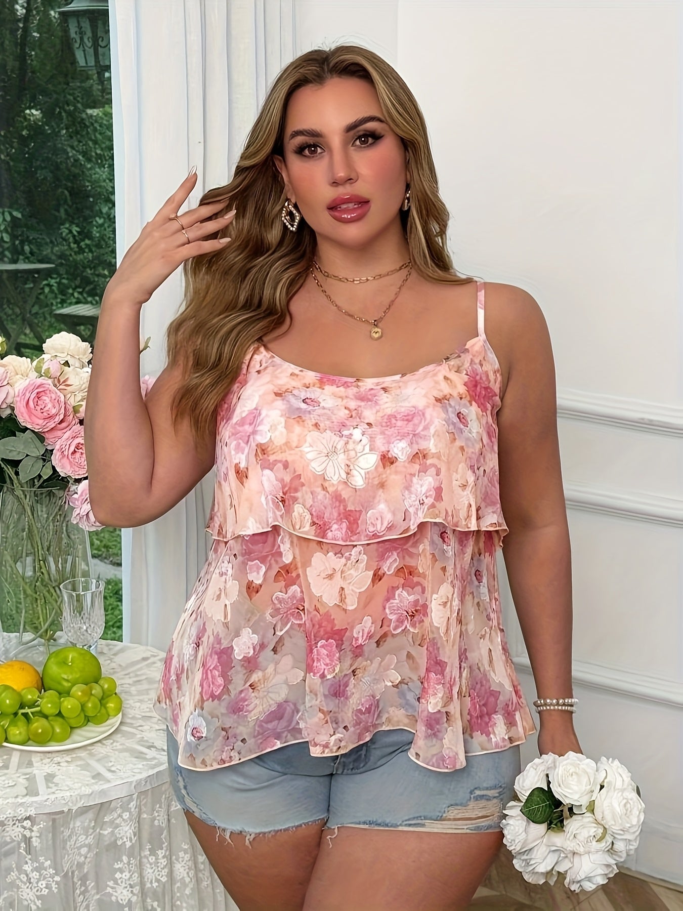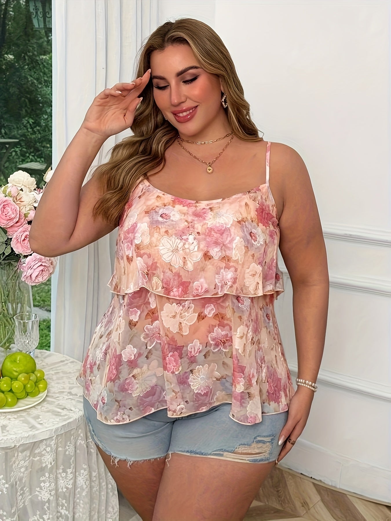 Женская топ-камис из жаккардового цветочного принта в стиле А-силуэт, розовая, летний отпуск, плюс сайз