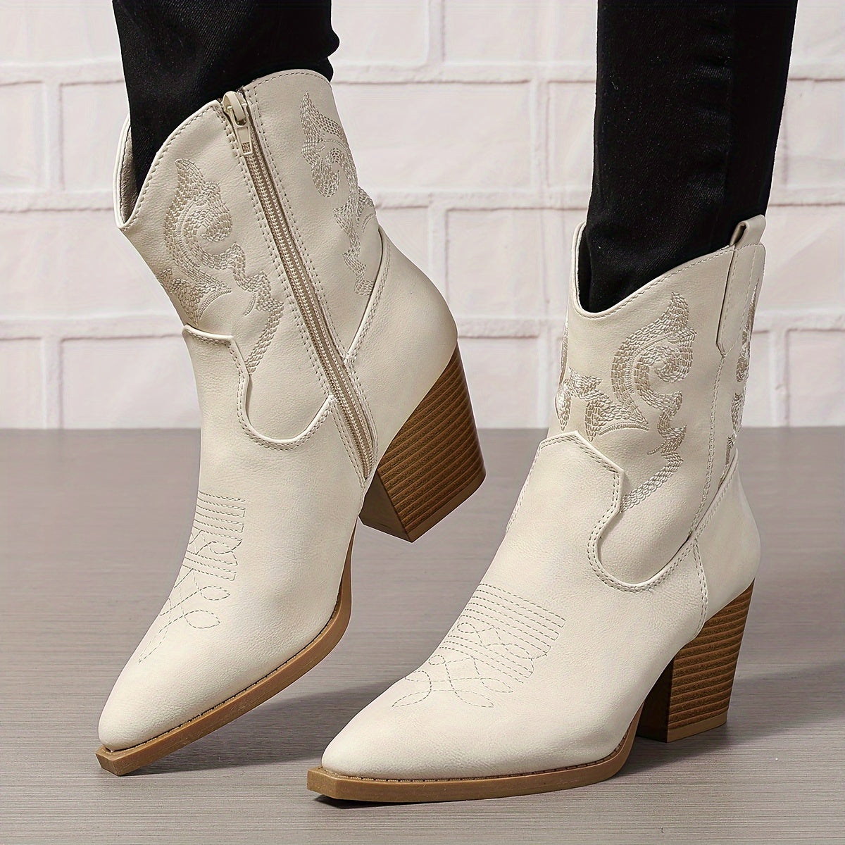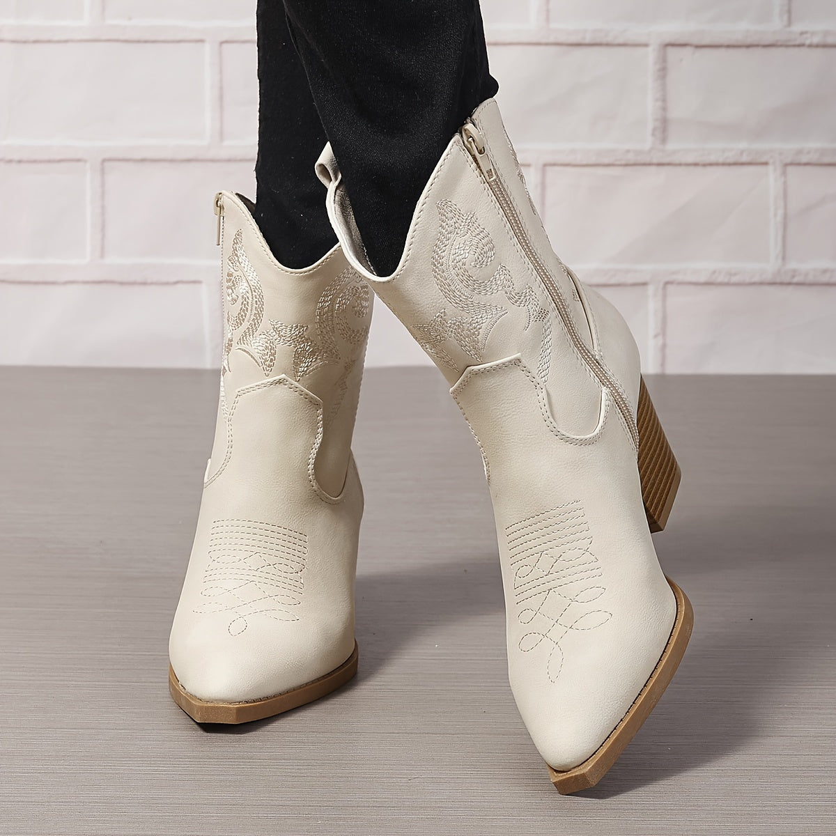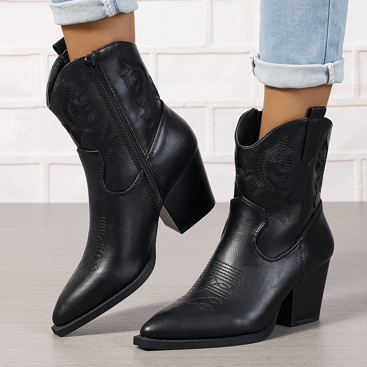 Женские ботинки на каблуке из искусственной кожи с цветочной вышивкой и молнией, черные