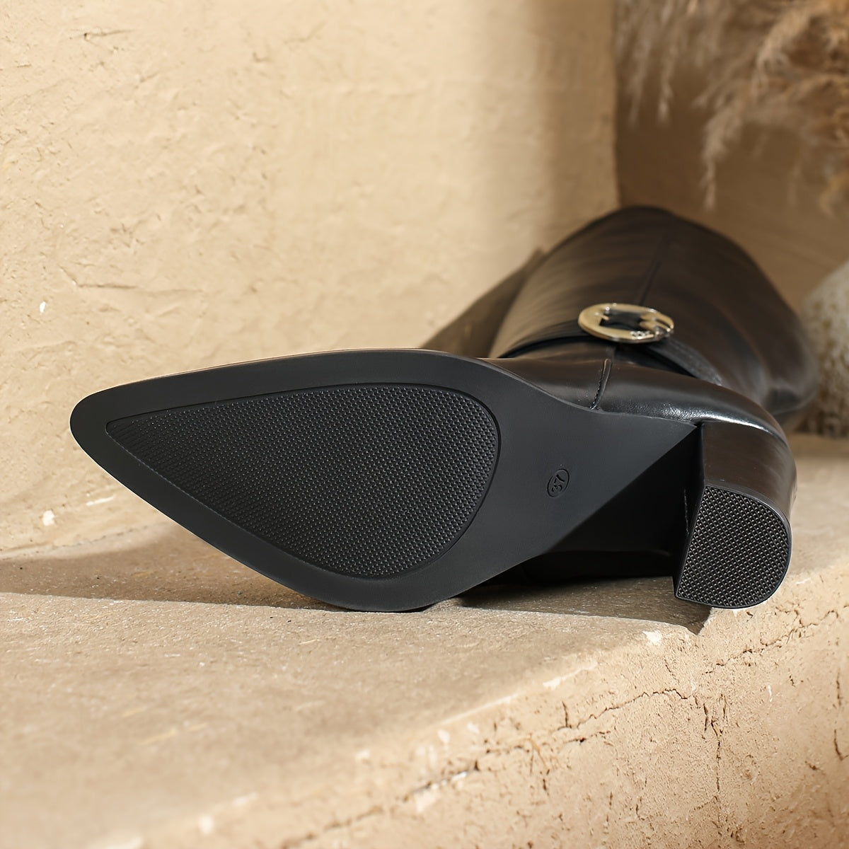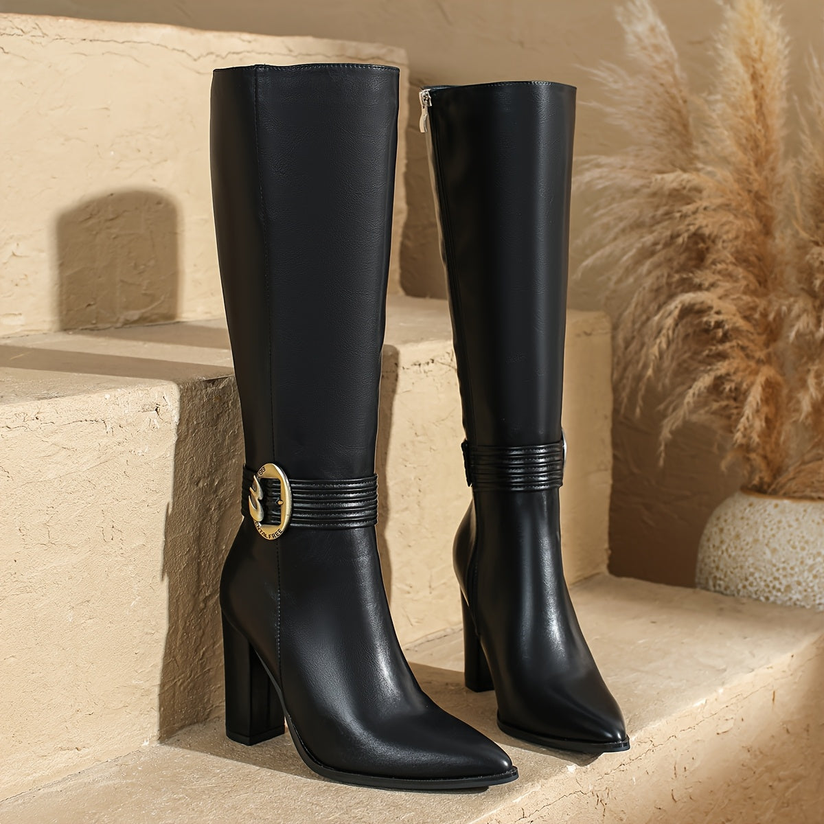 Женские ботинки из искусственной кожи с массивным каблуком и заостренным носком, до колена, черные, всесезонная стильная обувь