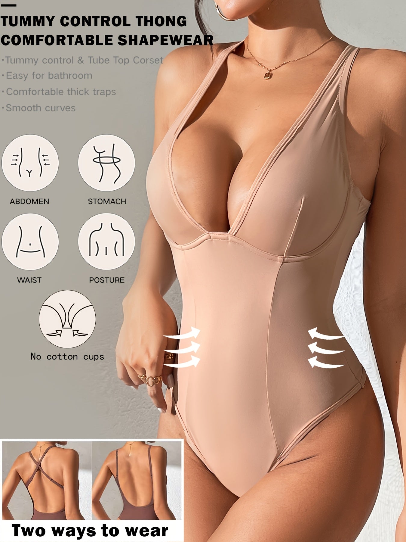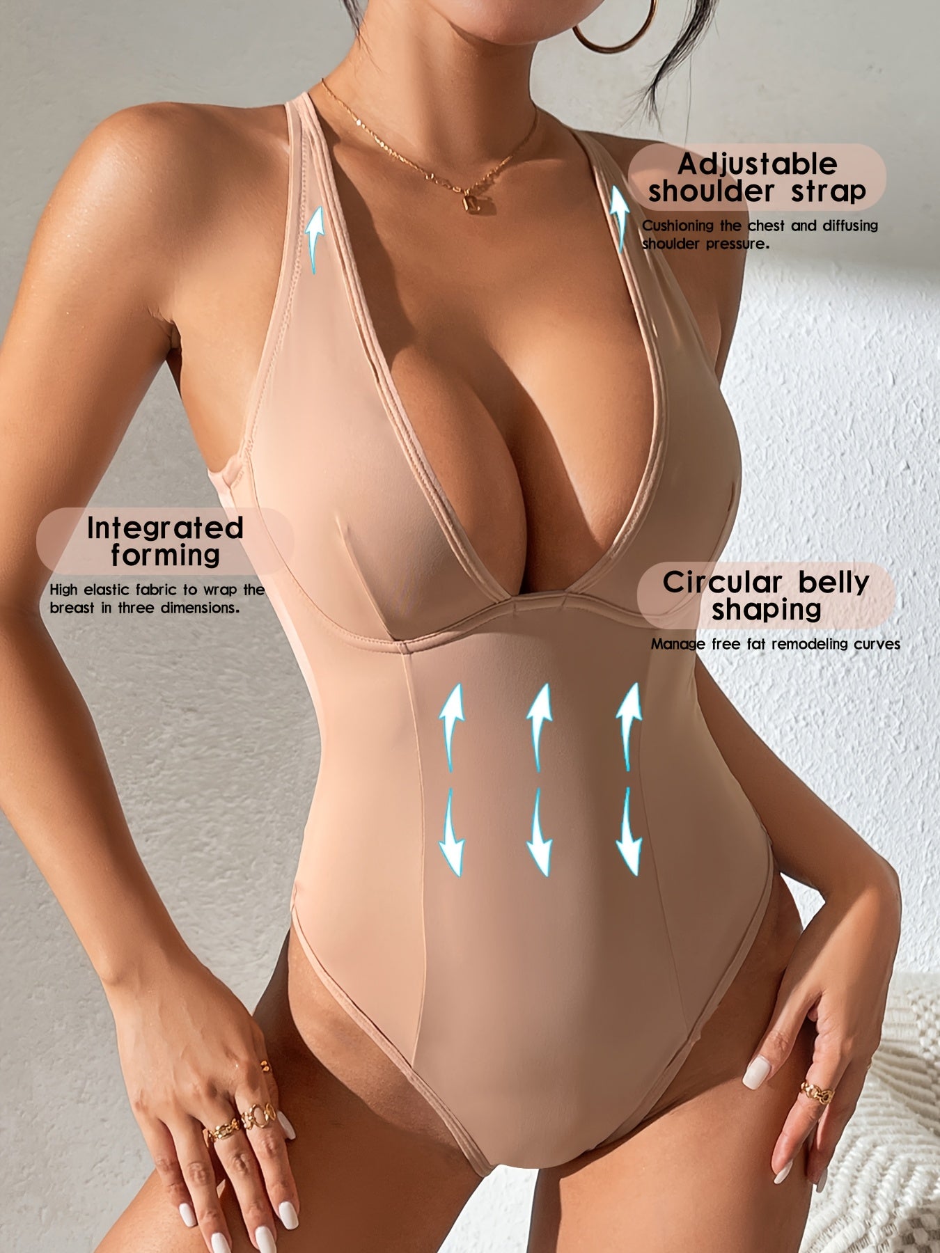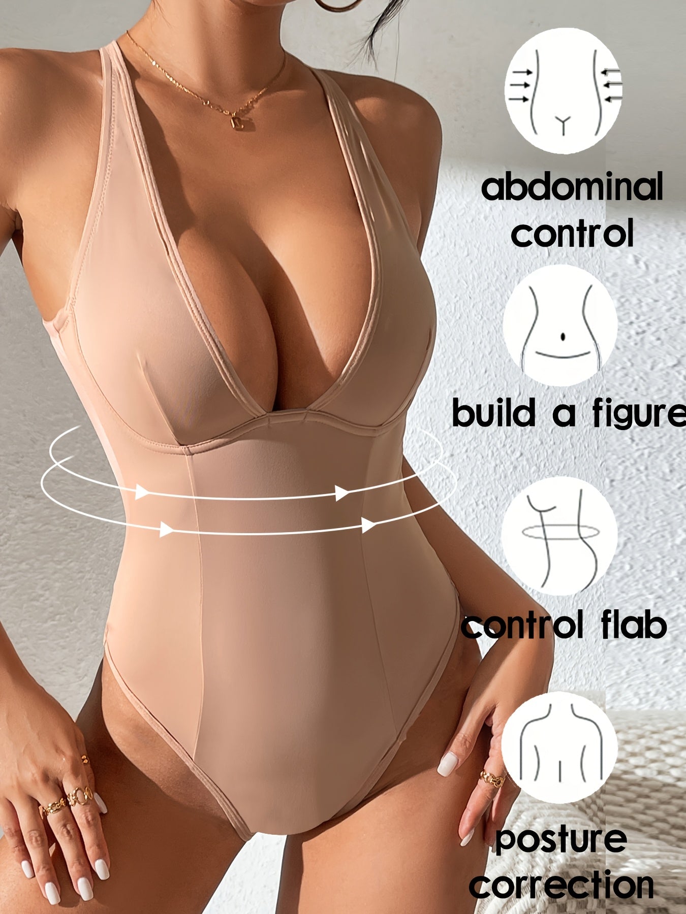 Бодис с высокой поддержкой для женщин, изготовленный из трикотажной ткани, состоящей на 82% из полиамида и на 18% из эластана. Имеет однотонный цвет с перекрестными бретелями и без подкладки, разработан для создания эффекта стройности.