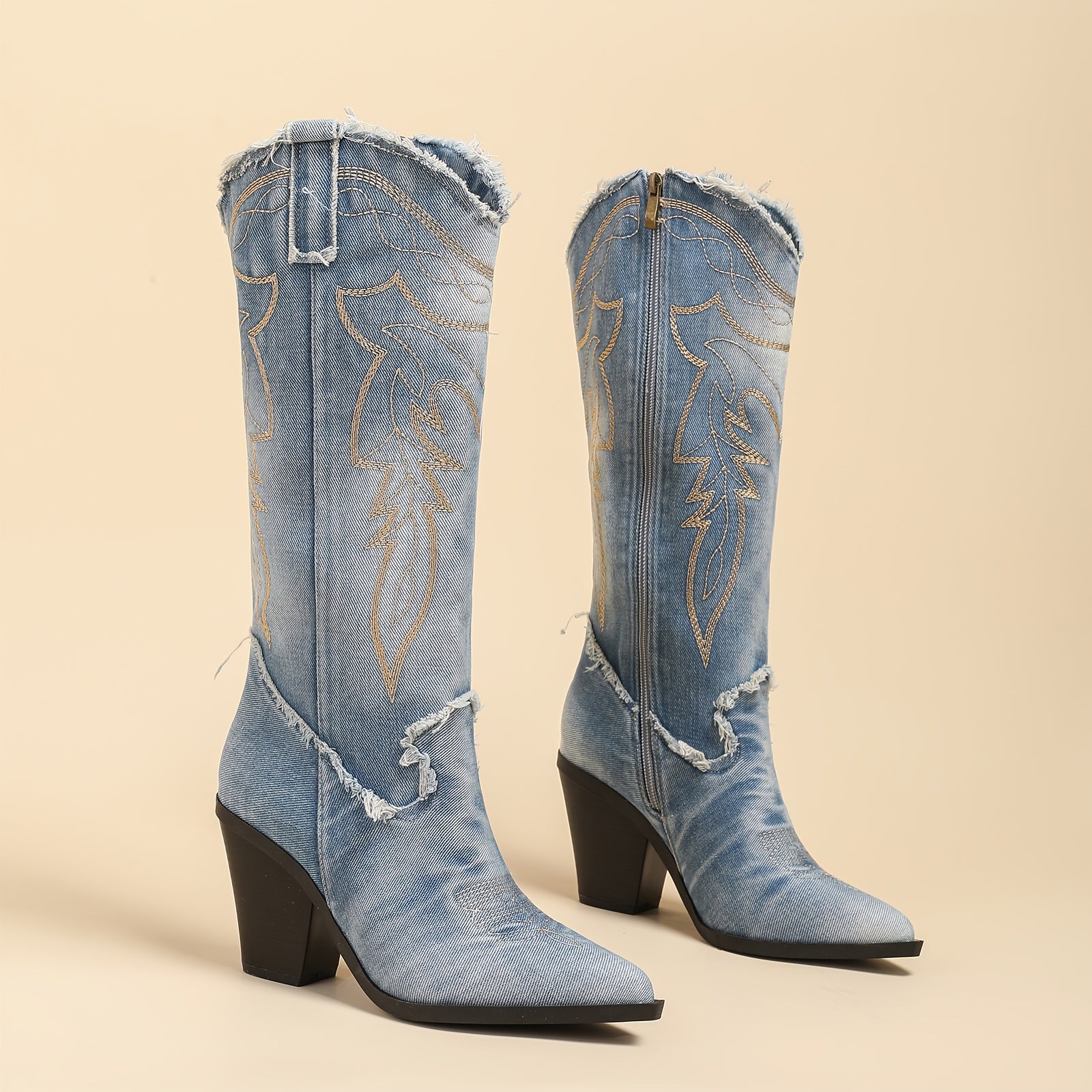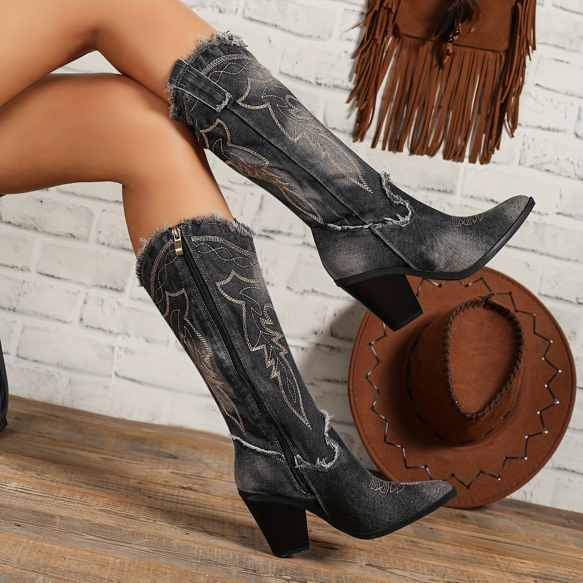 Женские кожаные сапоги до колена с вышивкой в стиле вестерн и рыцарским дизайном