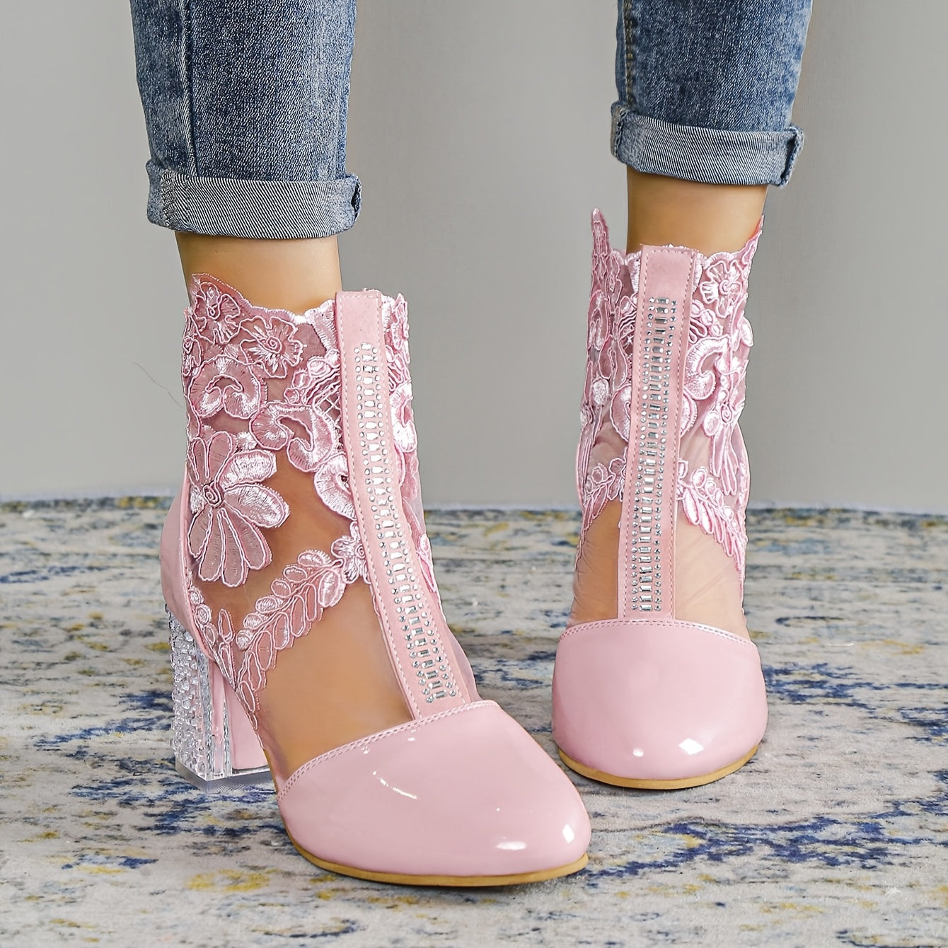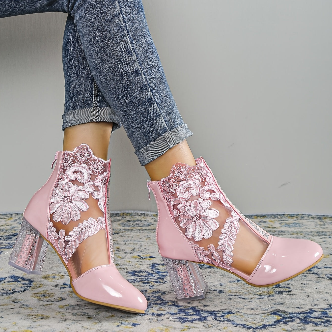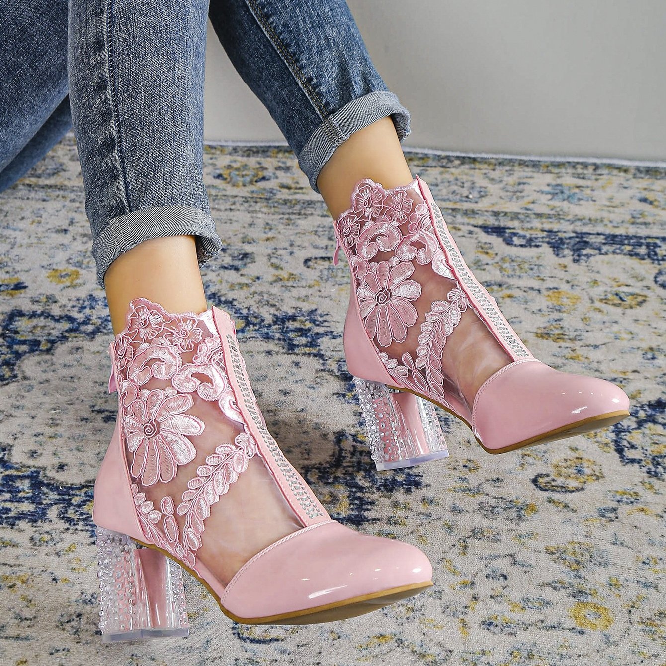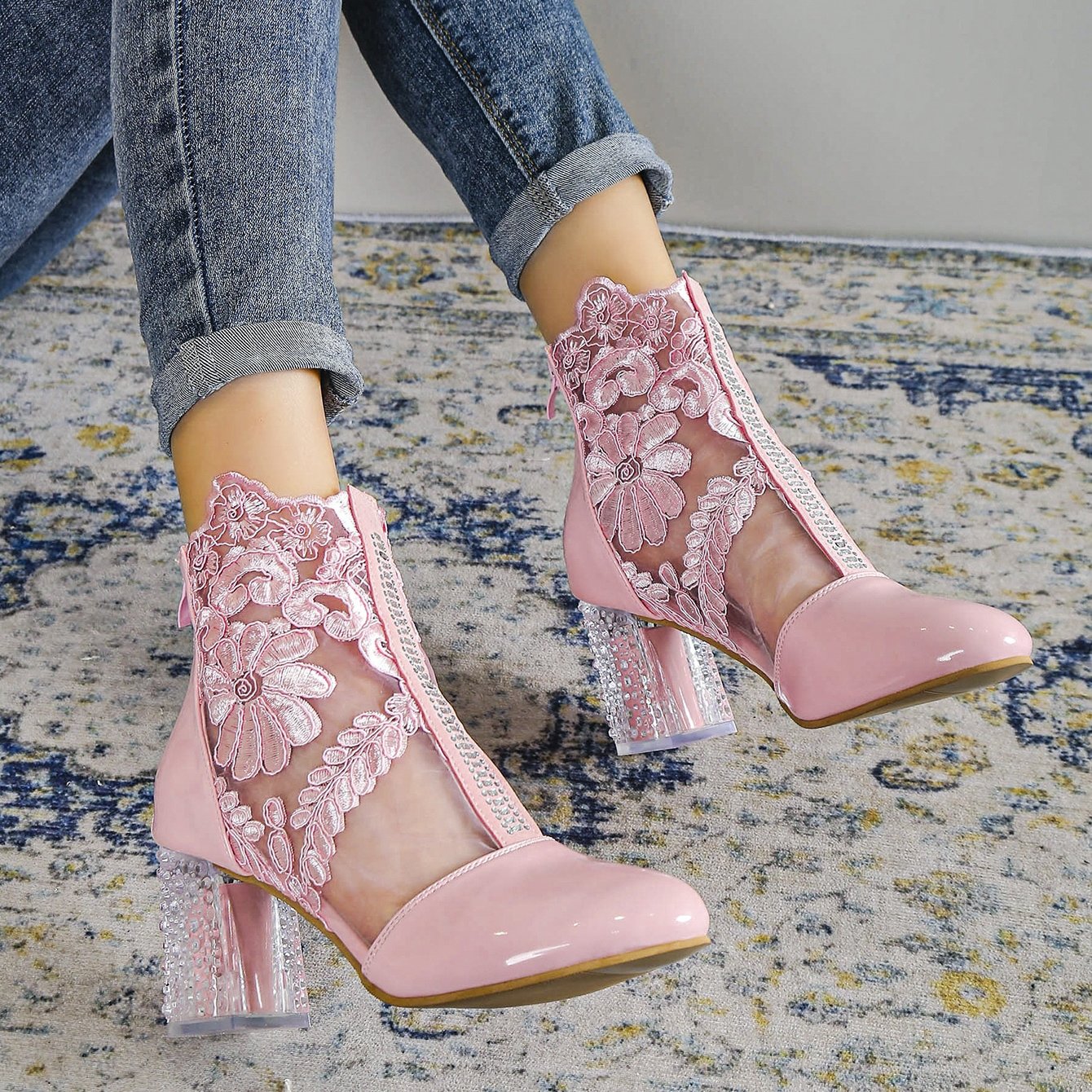 Женские кожаные ботинки на шнуровке с кружевом, розовые, прозрачные каблуки, короткие ботинки на молнии