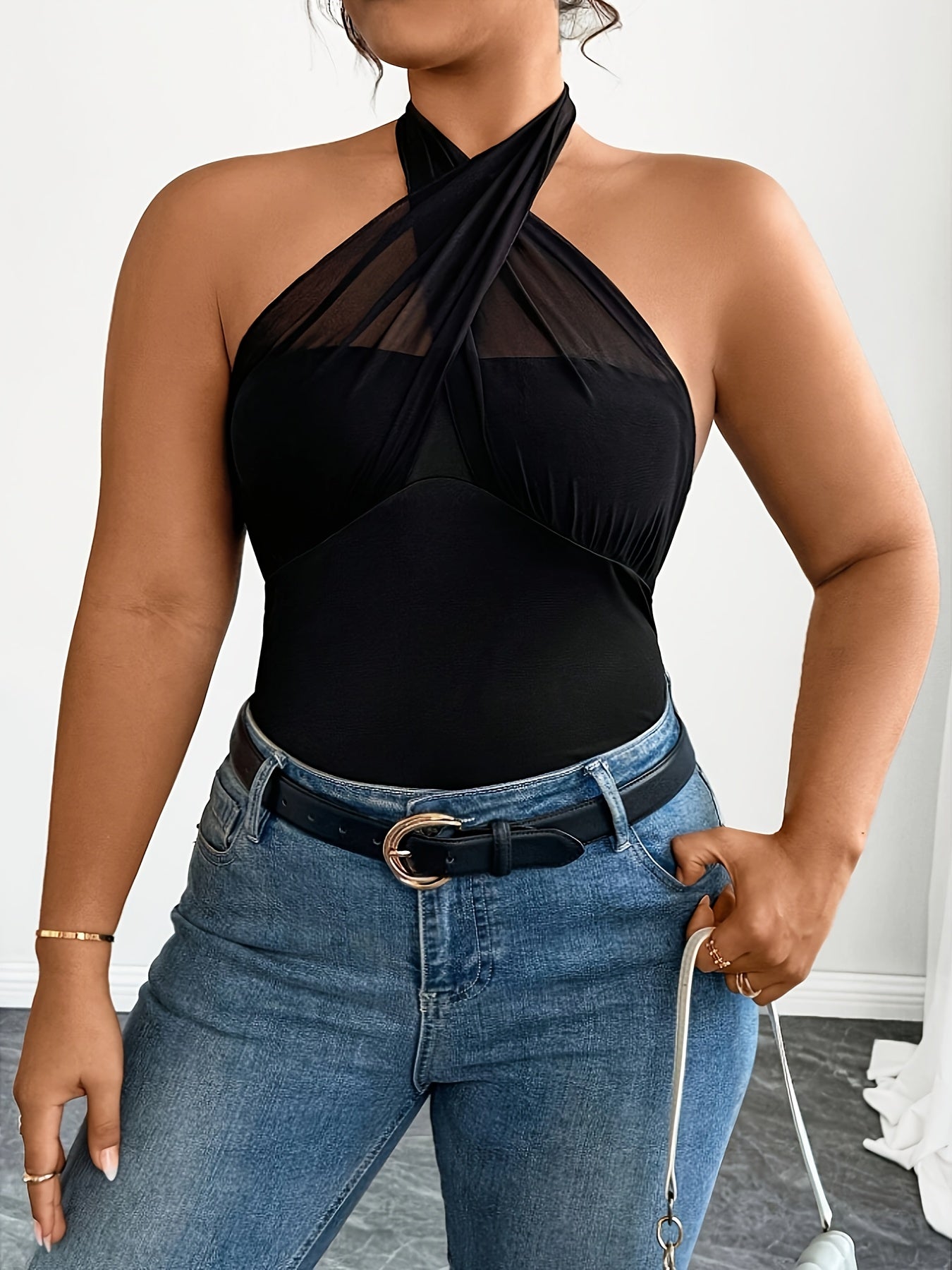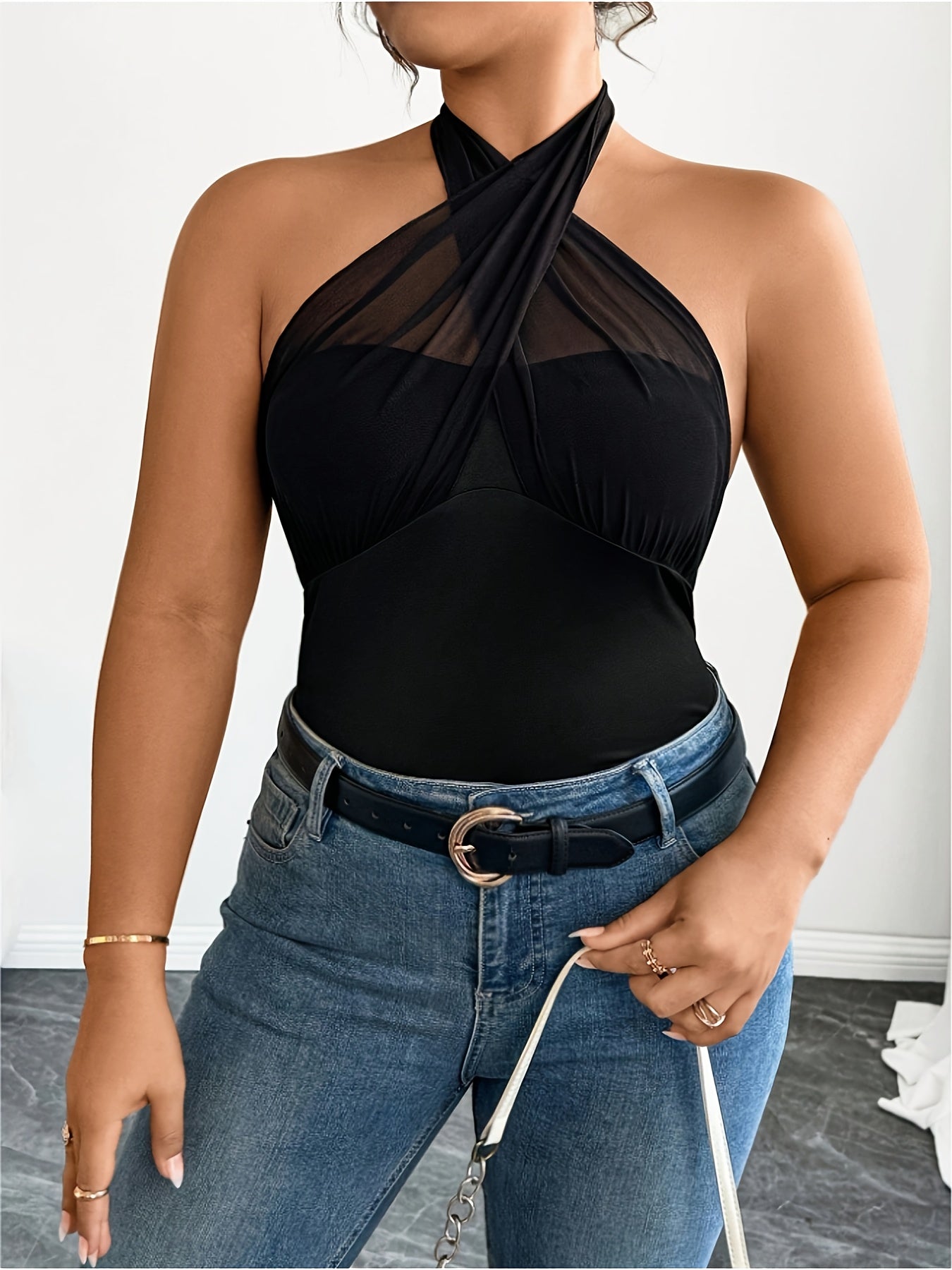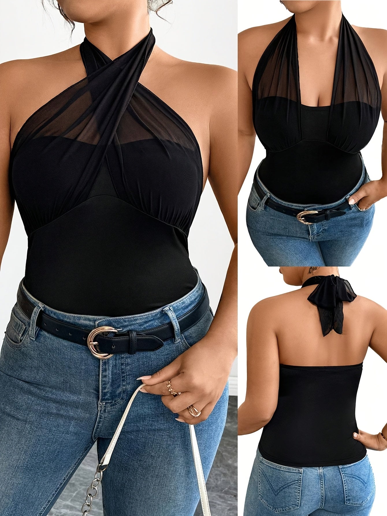 Женская блузка большого размера из сетки с халтером, черная, с переплетающимся узлом спереди, стильная вечерняя