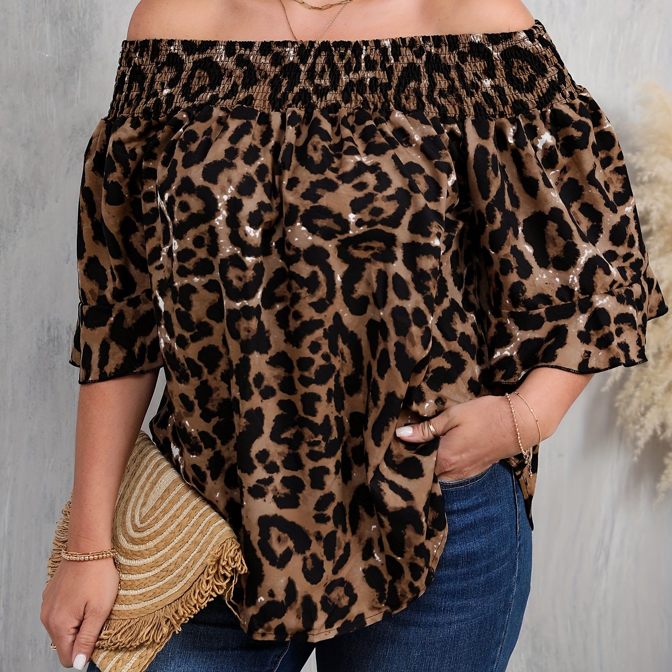 Женская блузка больших размеров с открытыми плечами с леопардовым принтом, рукава-колокольчики, летняя топ