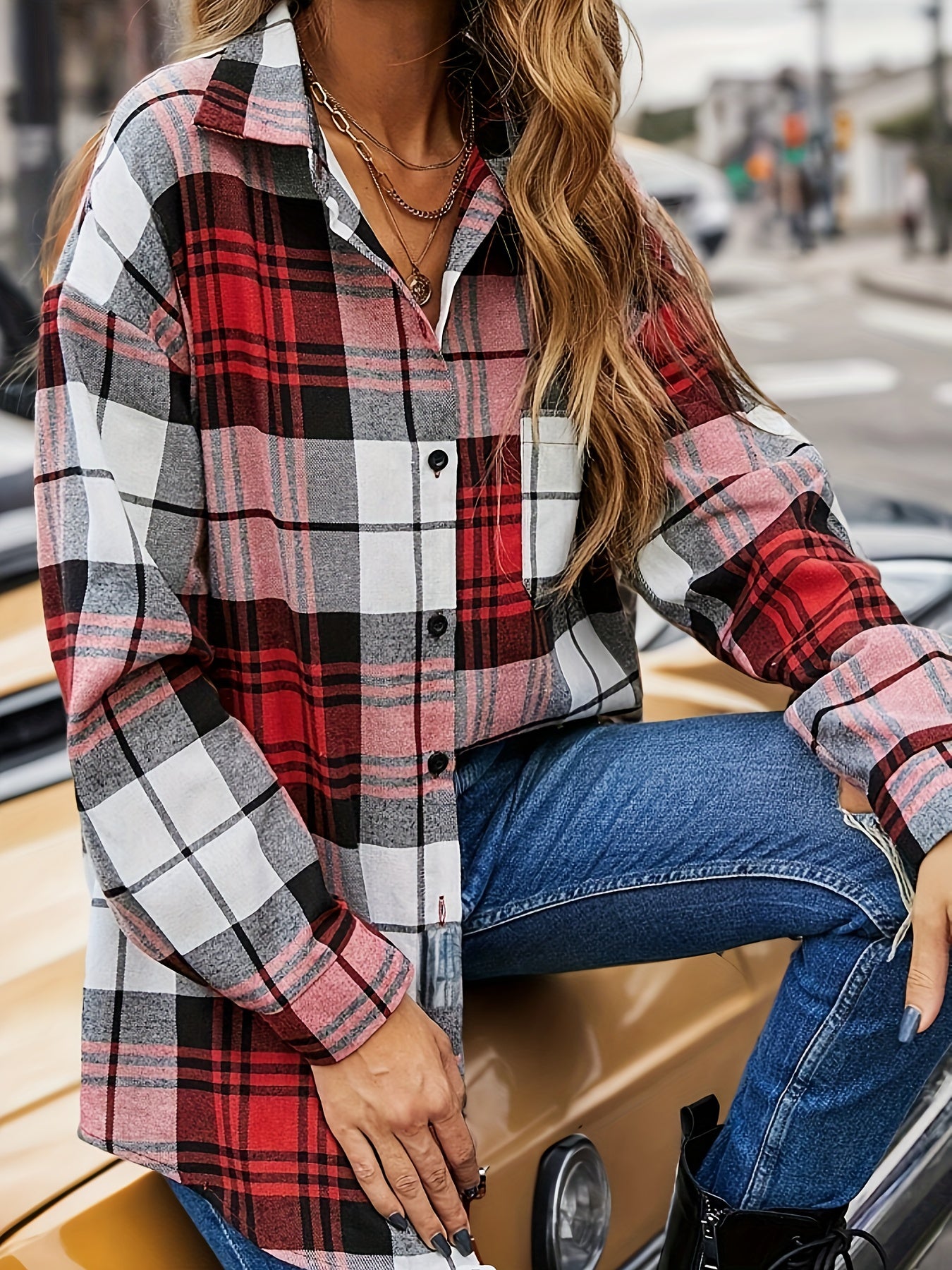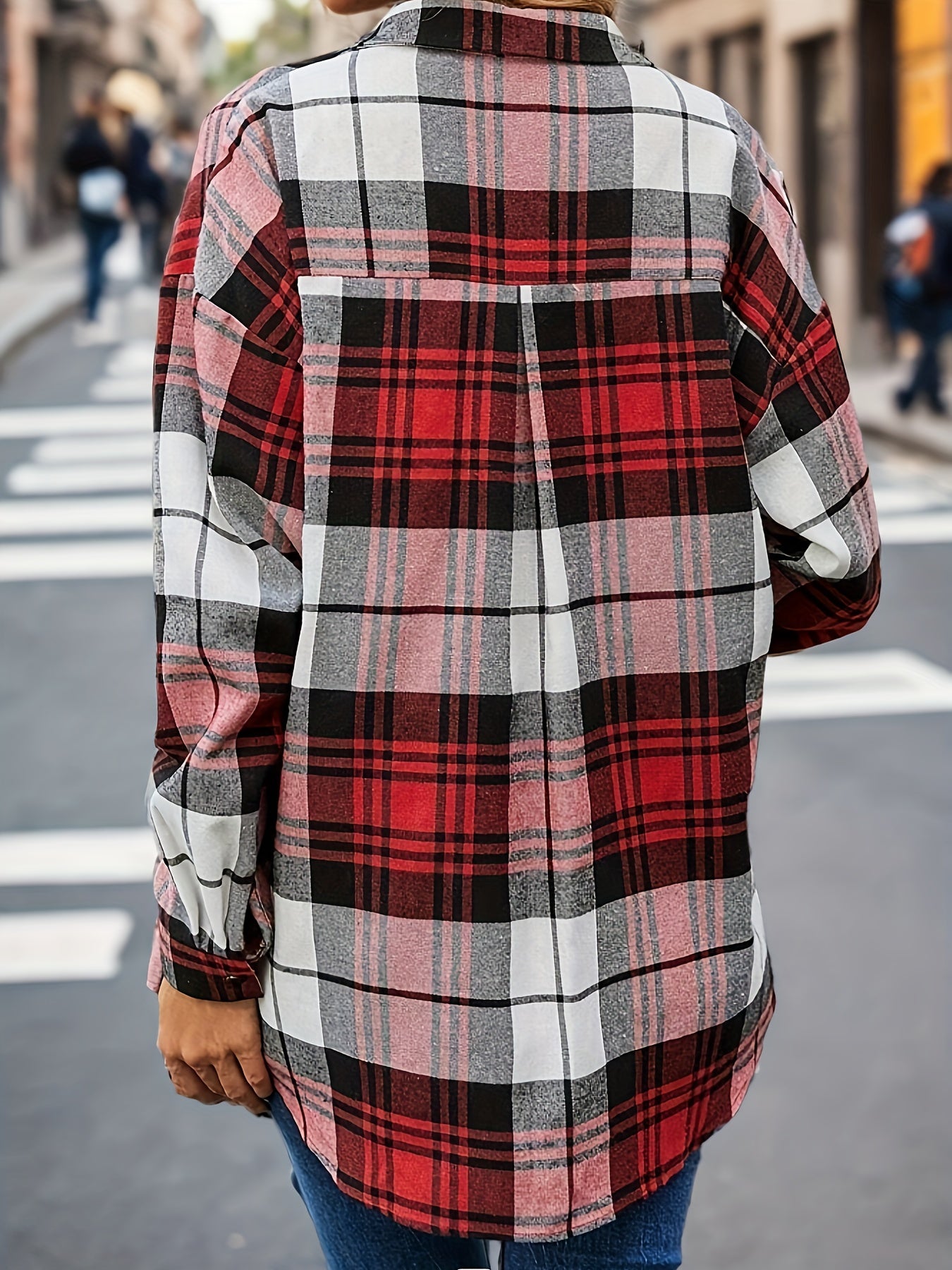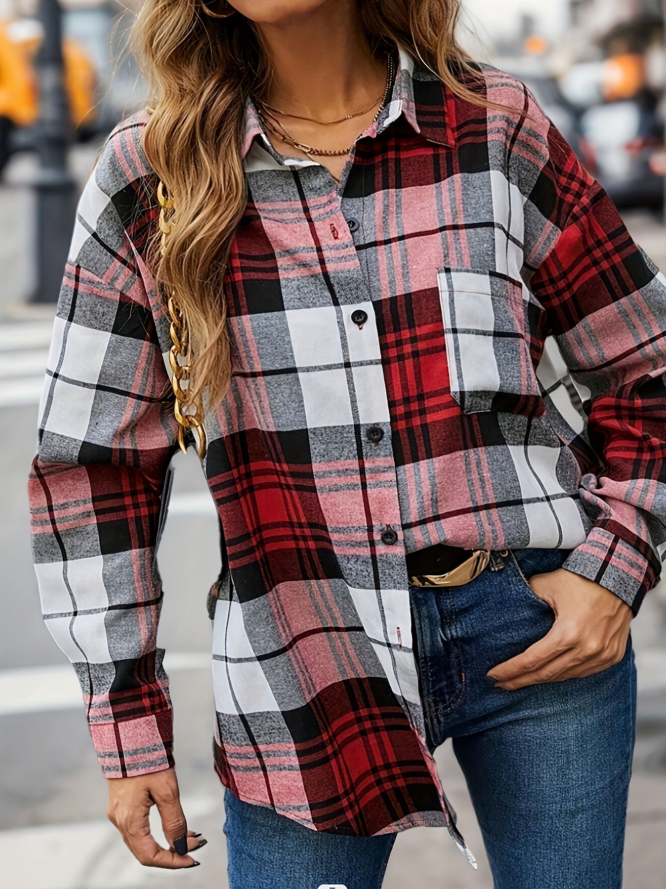 Женская блузка оверсайз с длинным рукавом и клетчатым принтом, на пуговицах