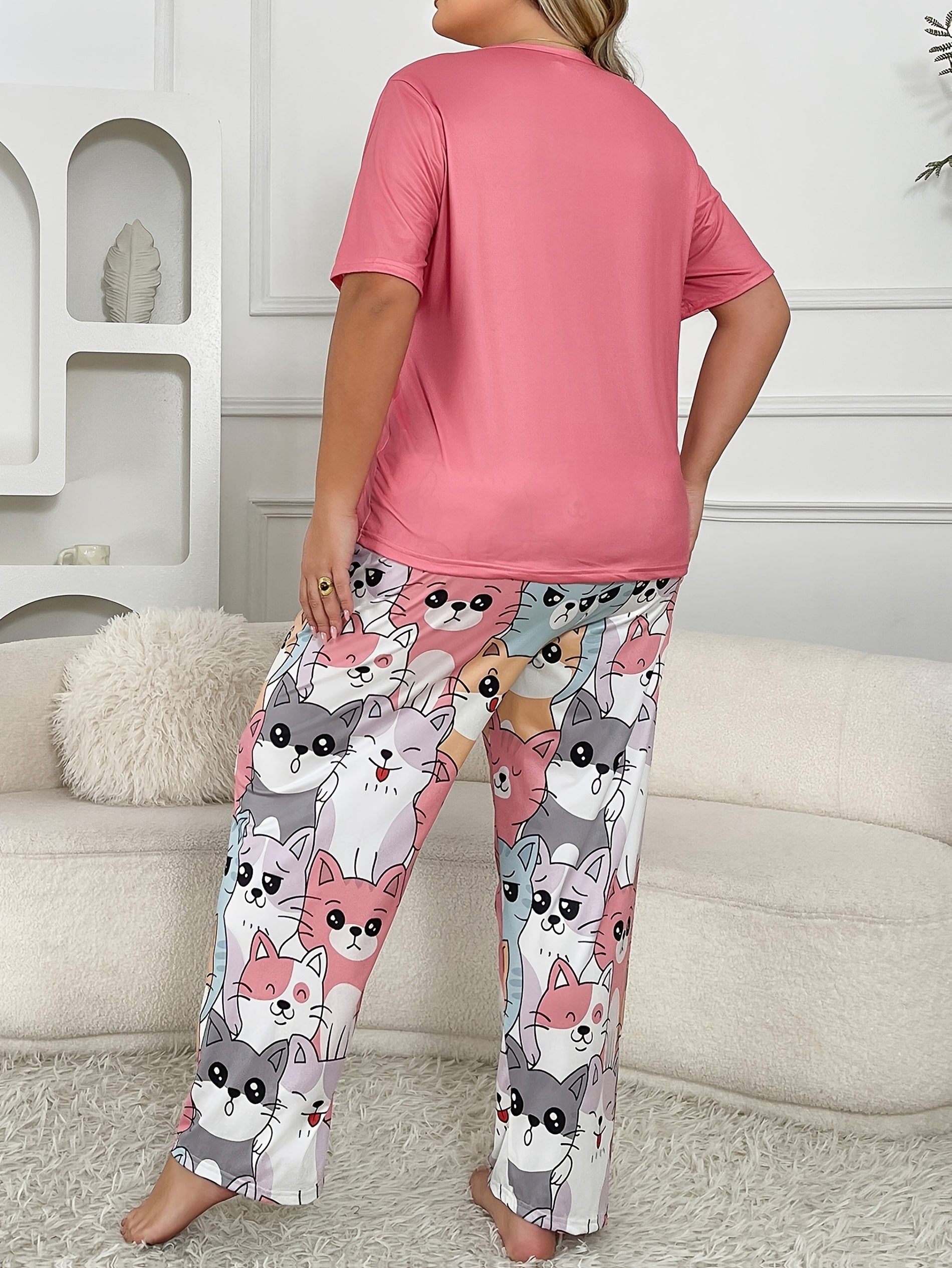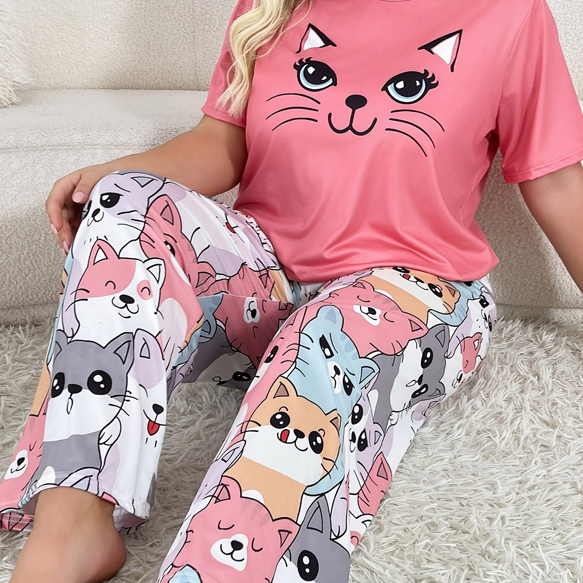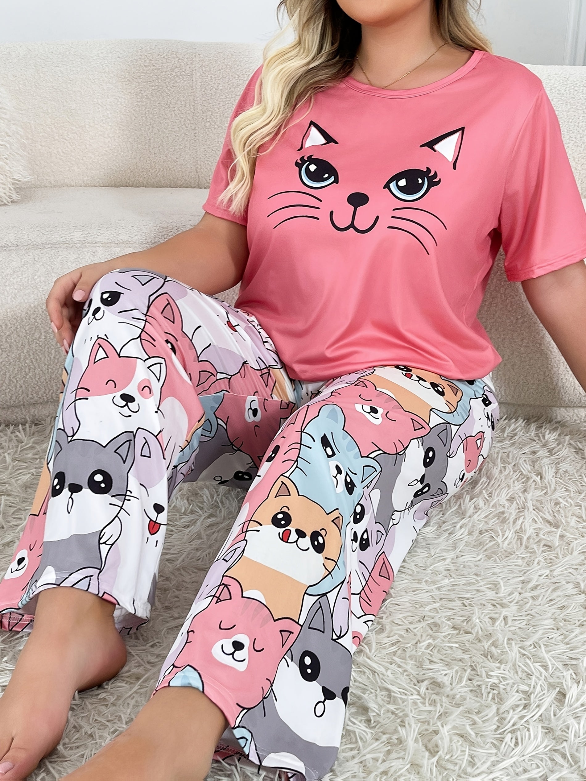 Женский комплект ночной одежды больших размеров с мультяшным принтом животных, короткий рукав, брюки