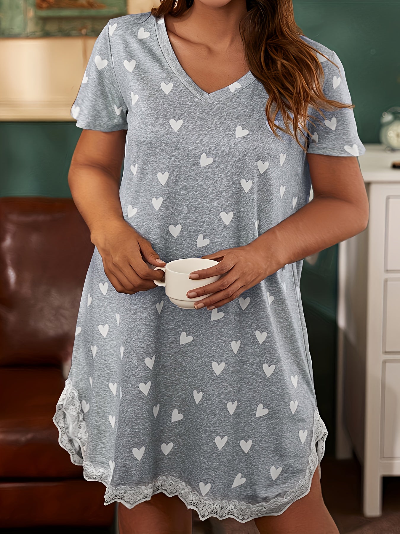 Женская ночная рубашка с красным сердечным принтом и кружевной отделкой, короткий рукав, пижама