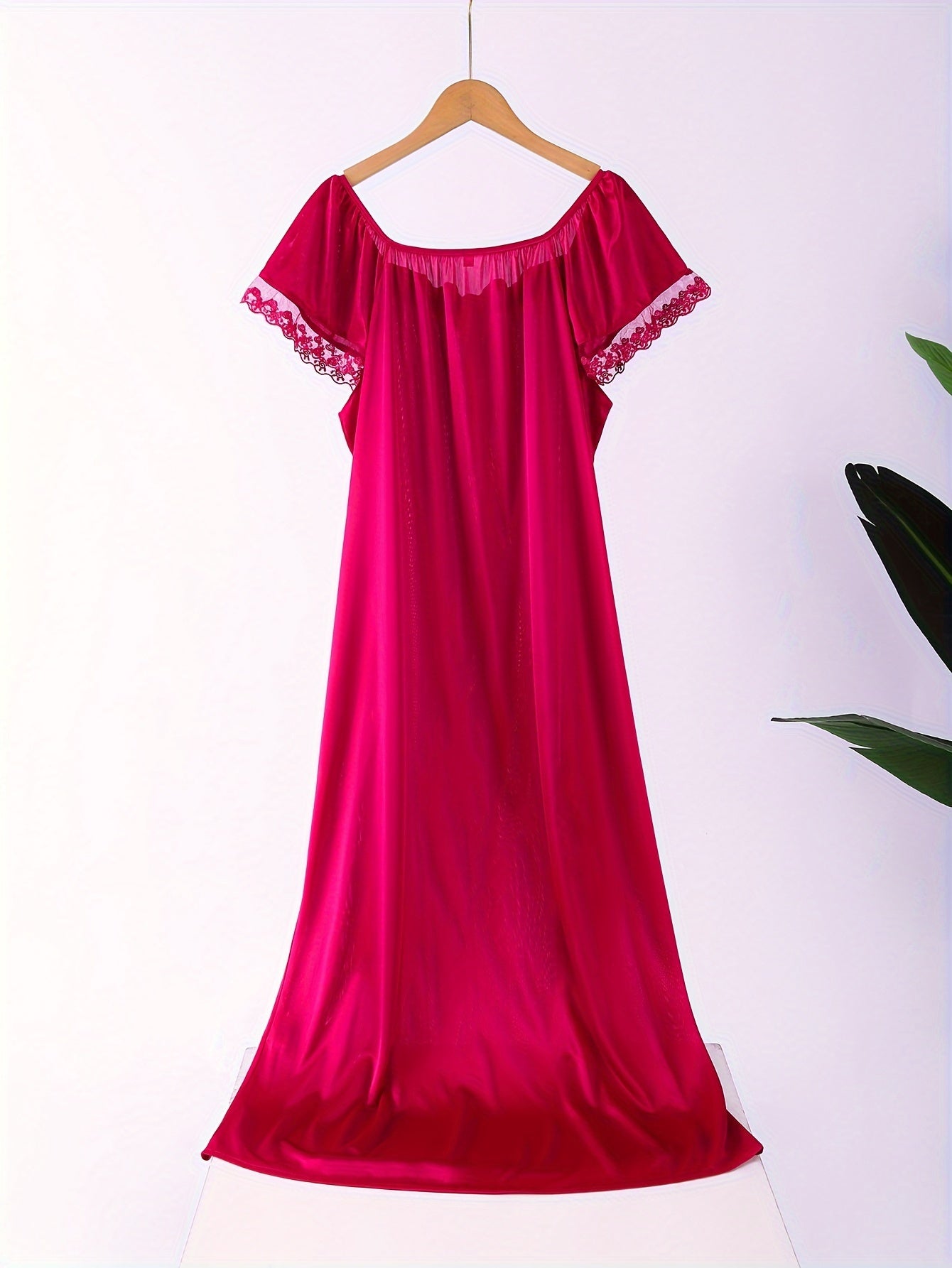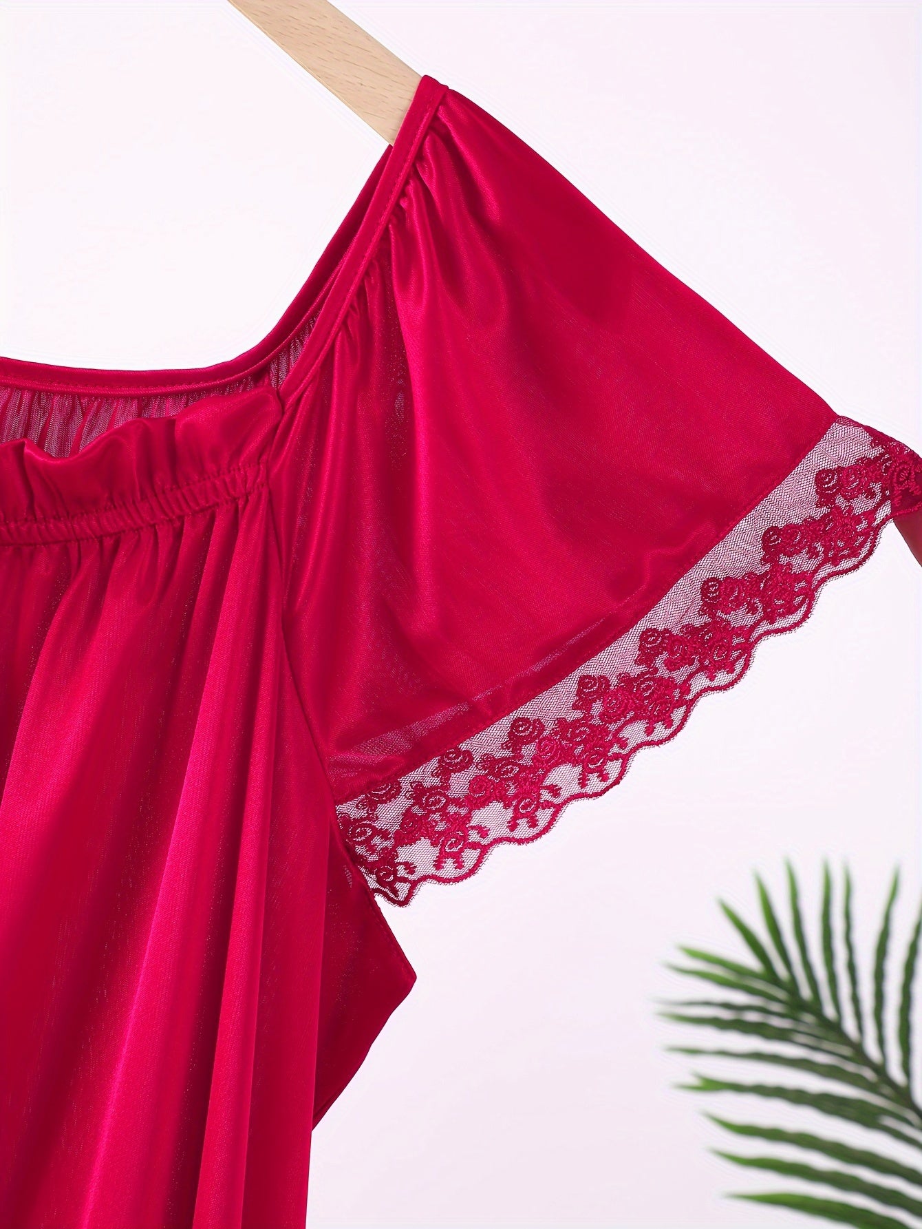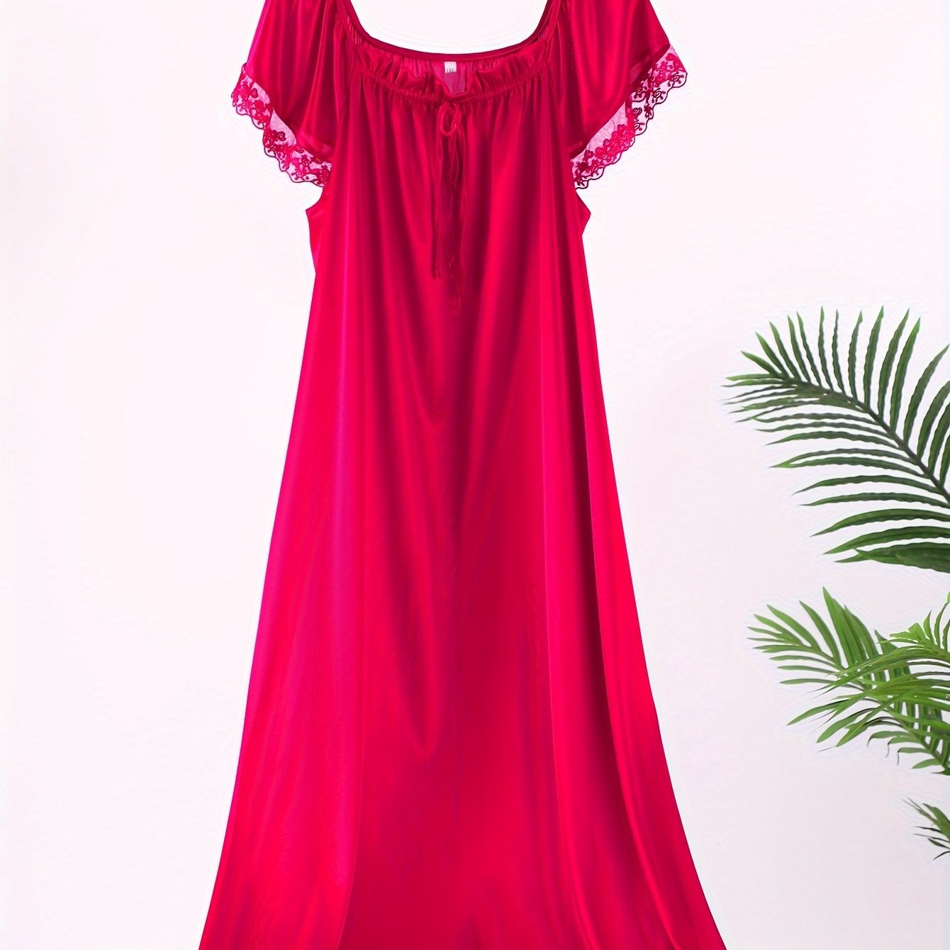Женская красная полупрозрачная длинная ночная рубашка с кружевной отделкой и бантиками