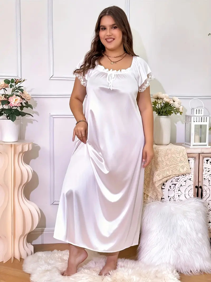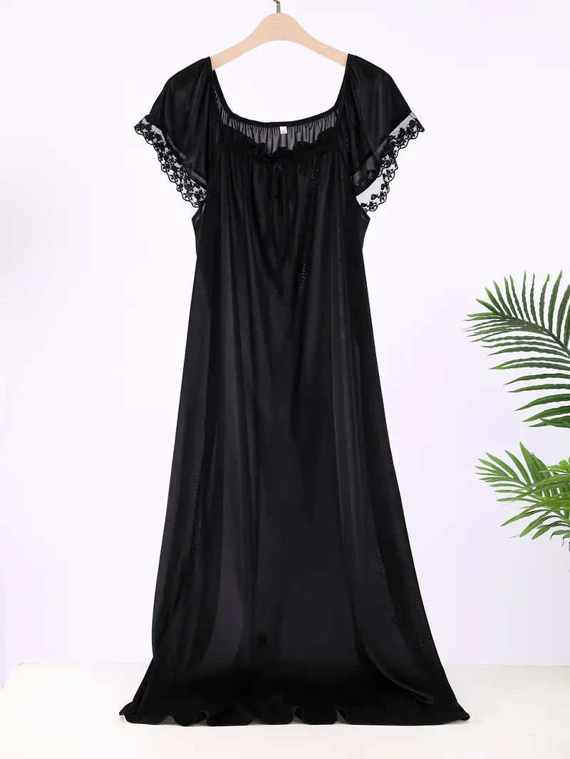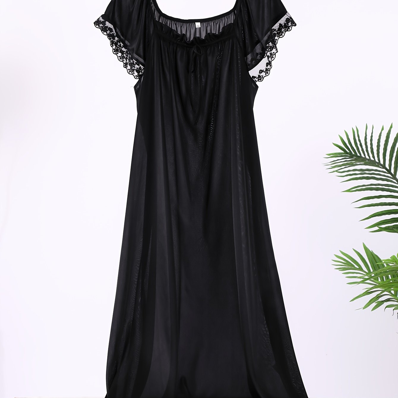 Женская красная полупрозрачная длинная ночная рубашка с кружевной отделкой и бантиками