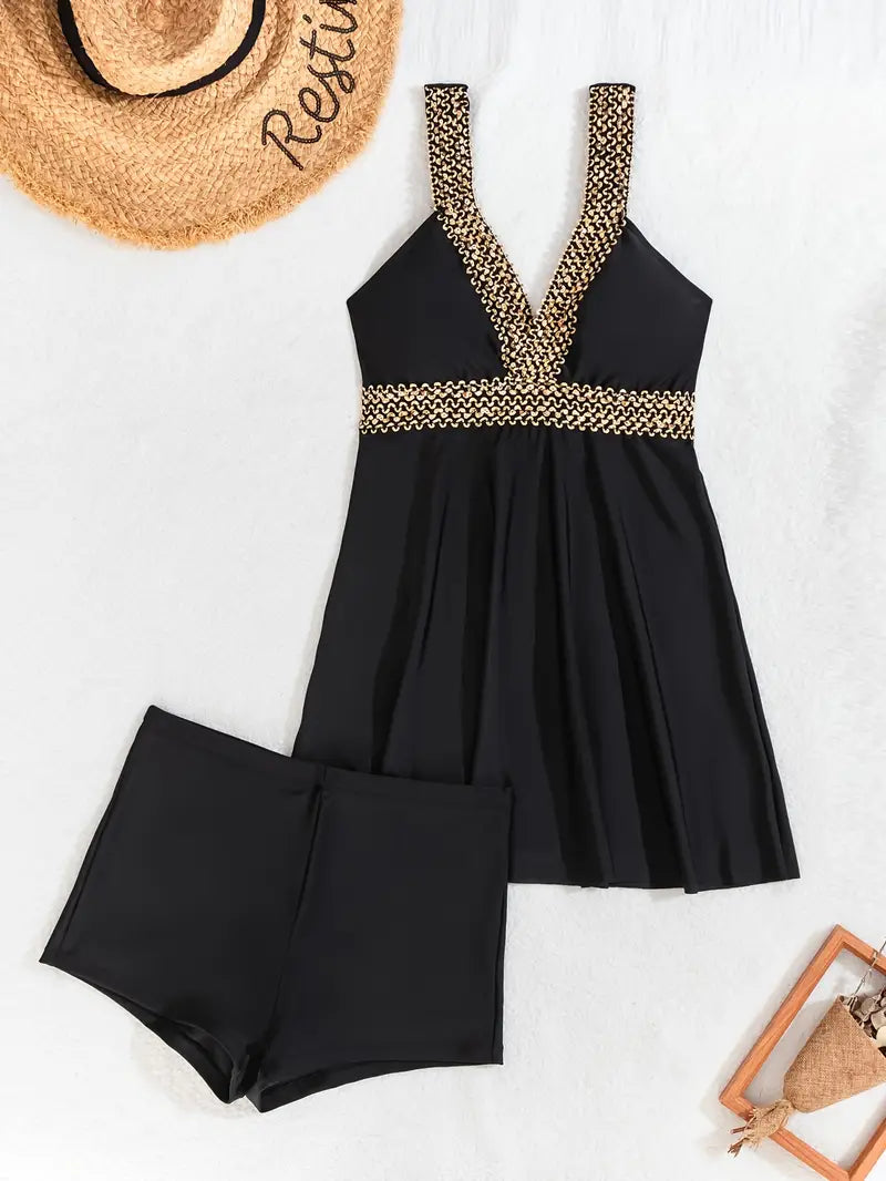 Женский танкини комплект со slimming юбкой и золотыми цепочками.
