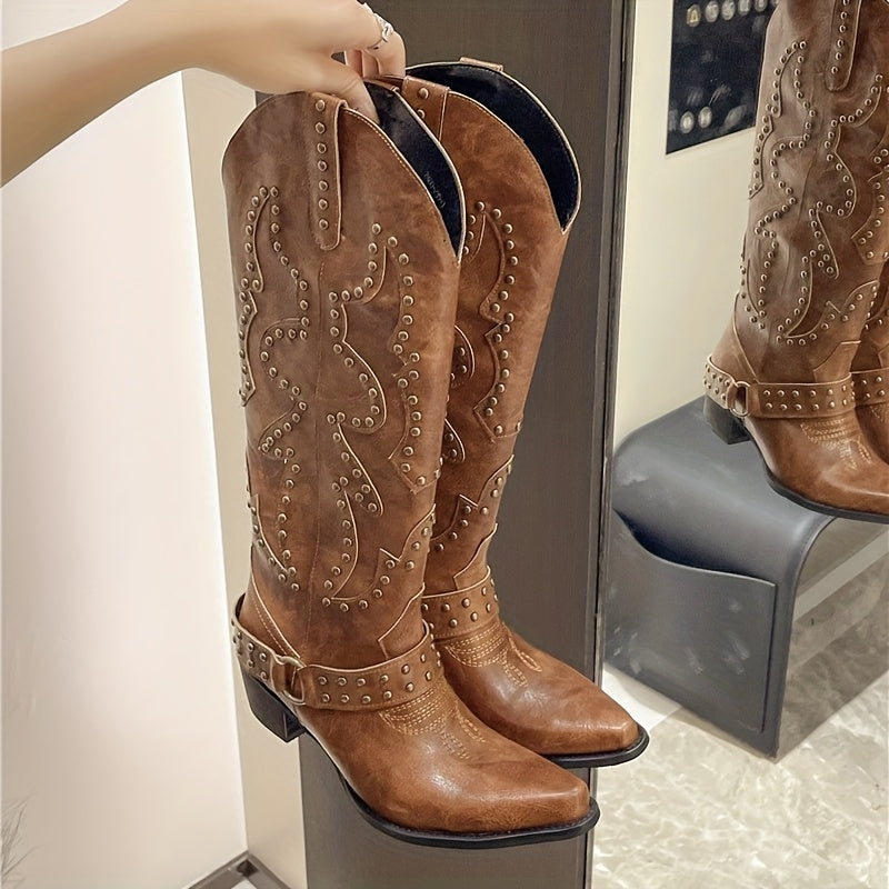 Женские западные ковбойские сапоги с заостренным носком, средней каблук, искусственная кожа, резиновая подошва
