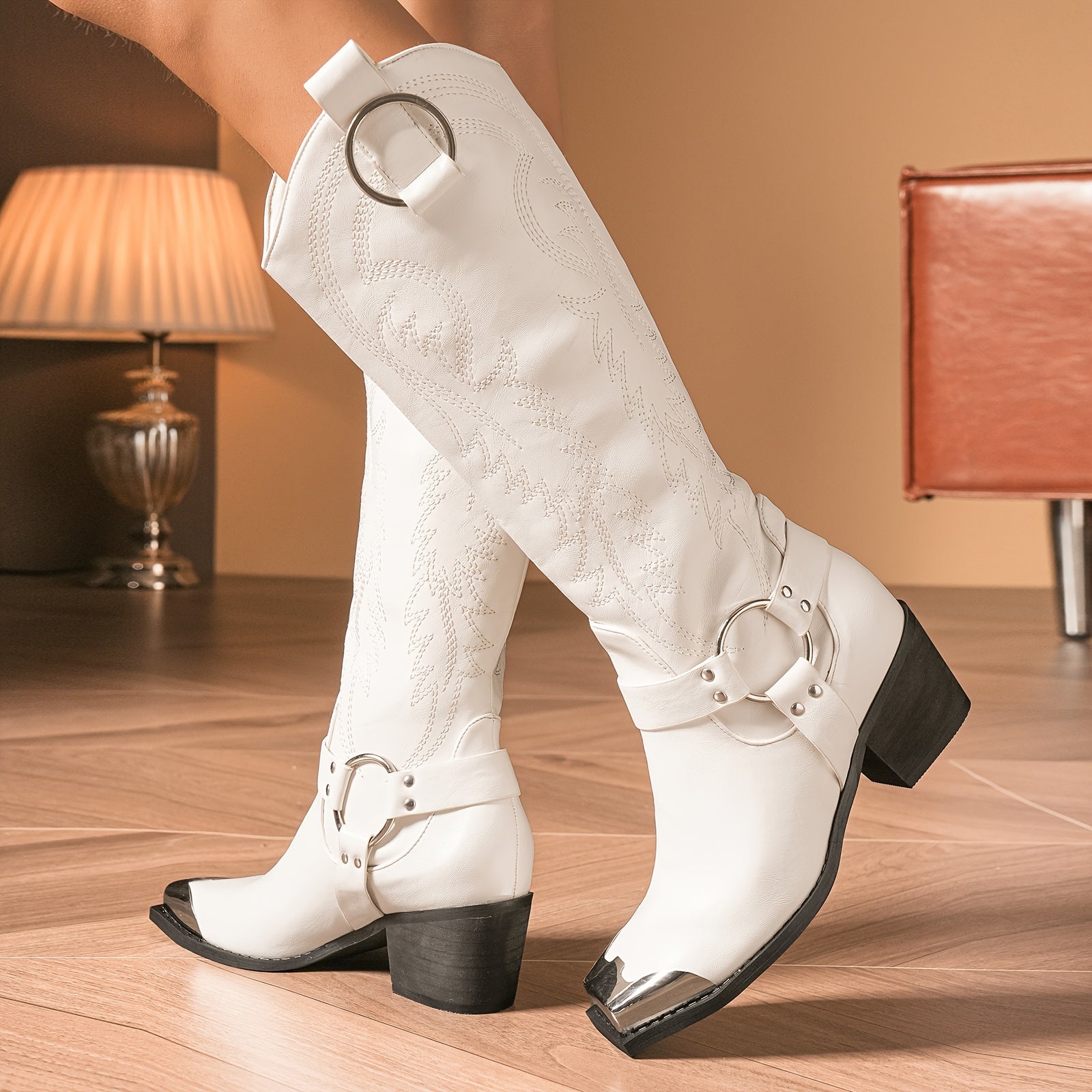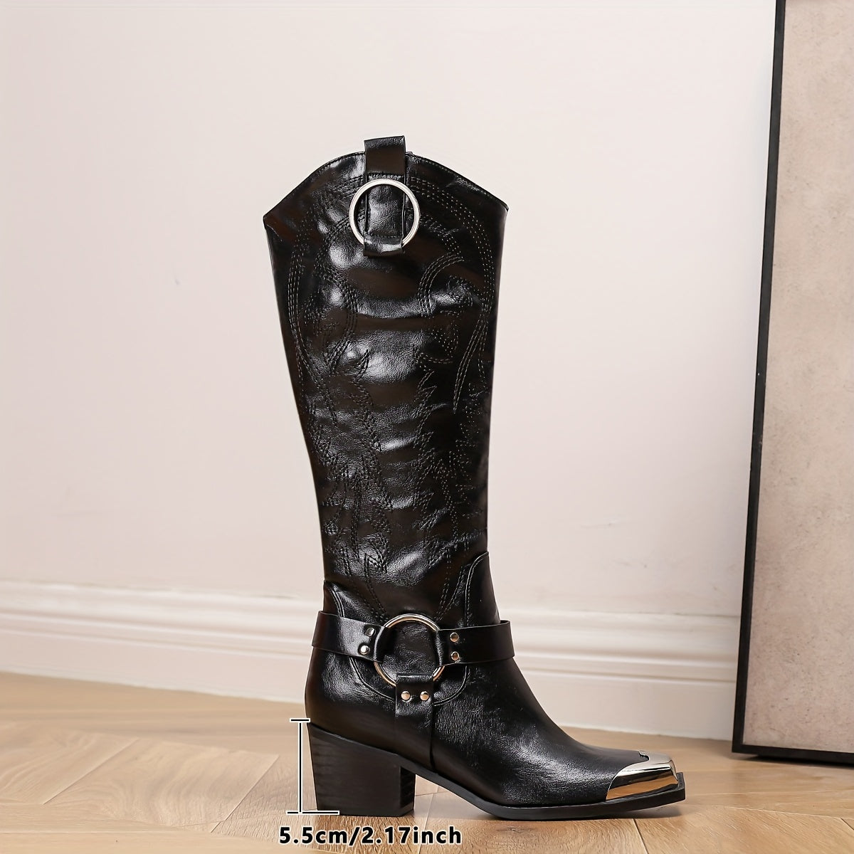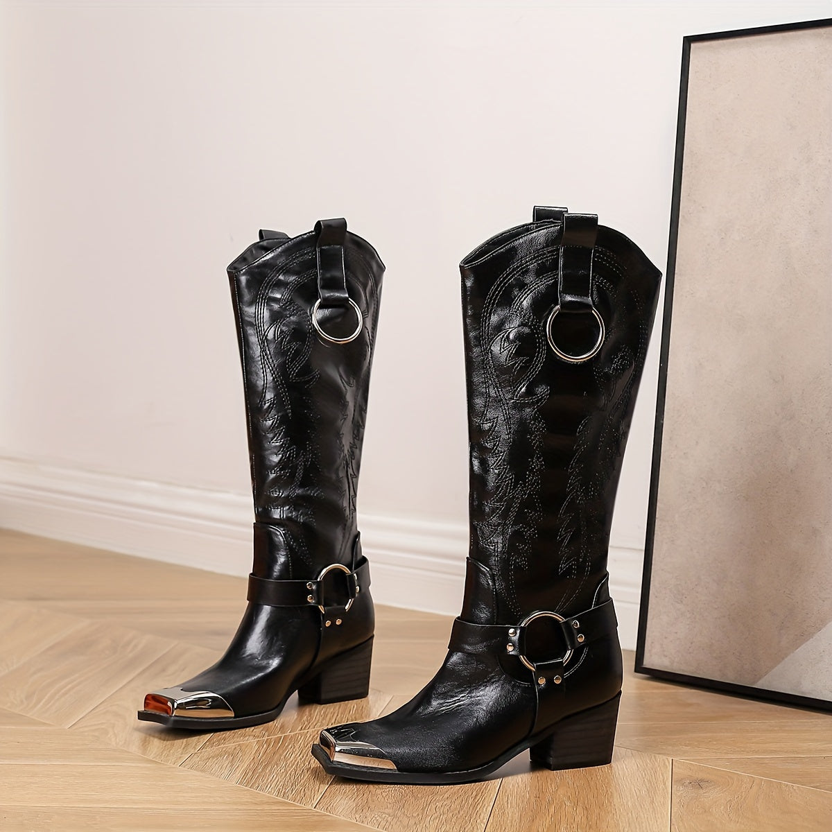 Женские кожаные сапоги в стиле вестерн с вышивкой, до середины икры, с квадратным носком