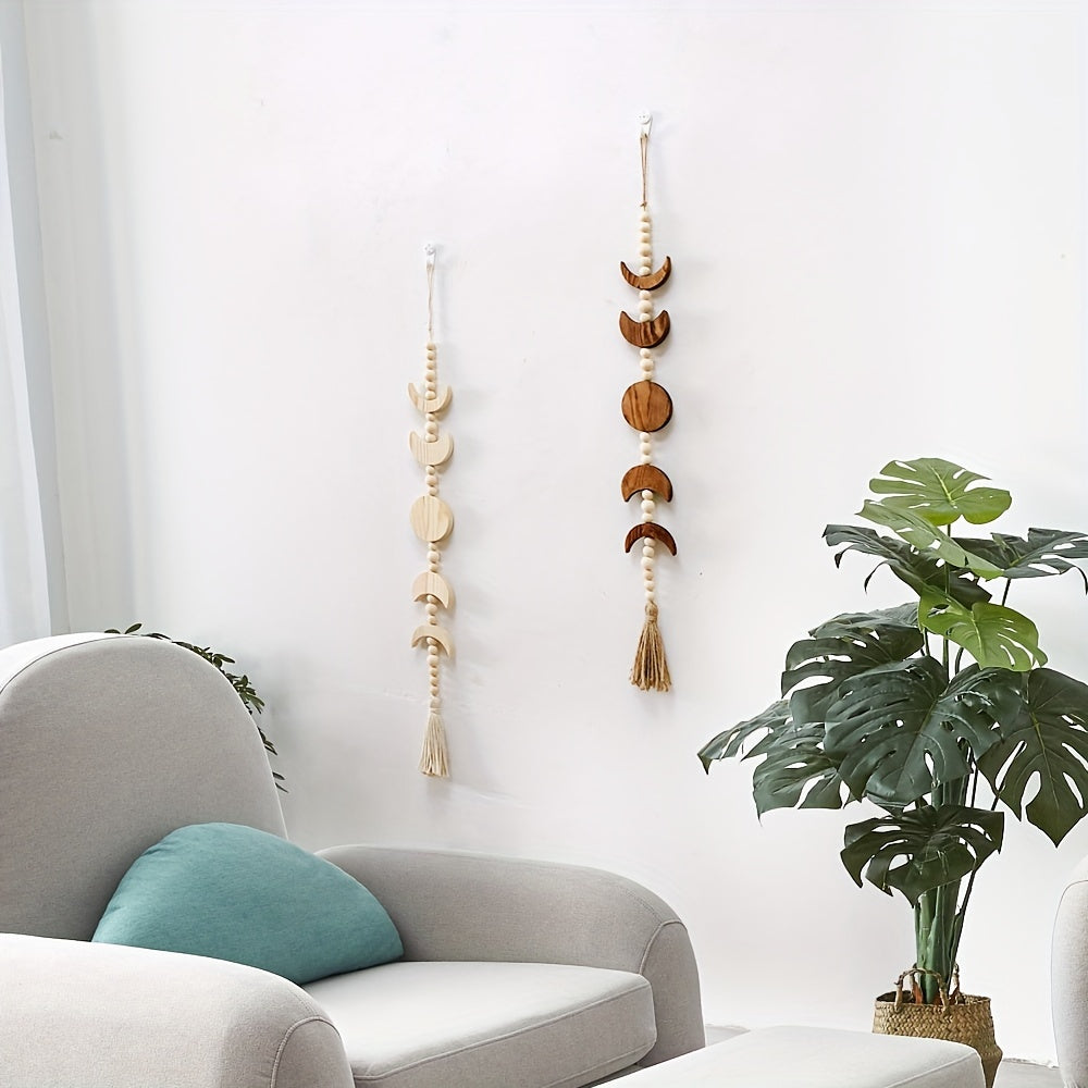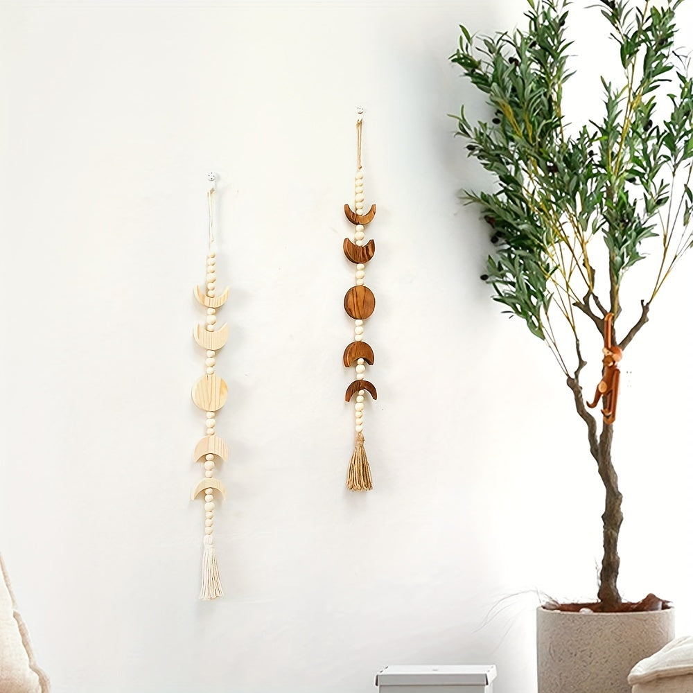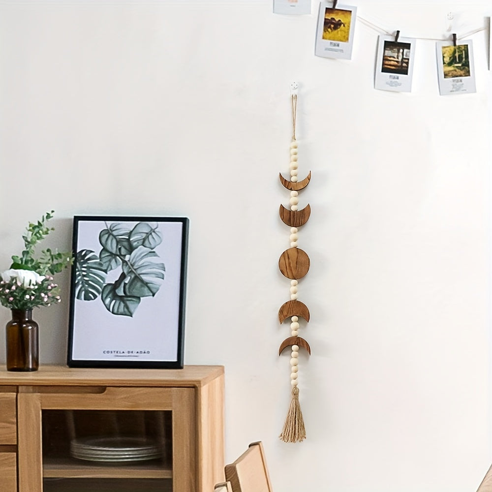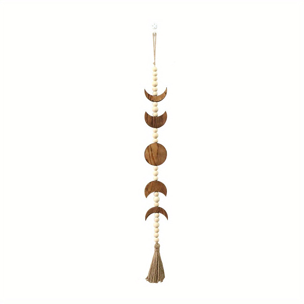 Деревянная настенная подвеска с фазами луны и декором из венка с бусинами.