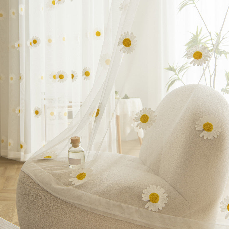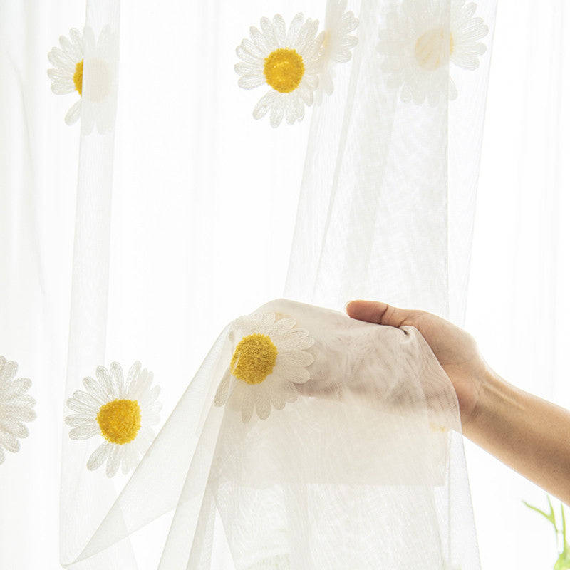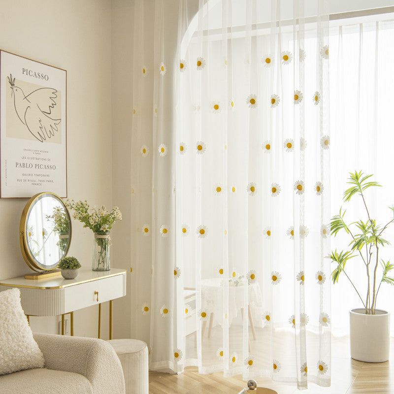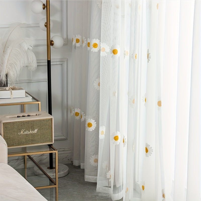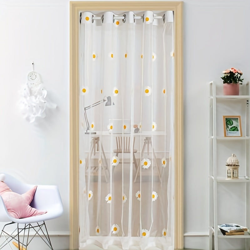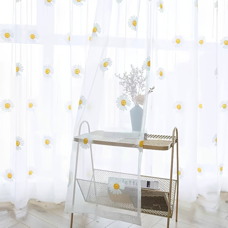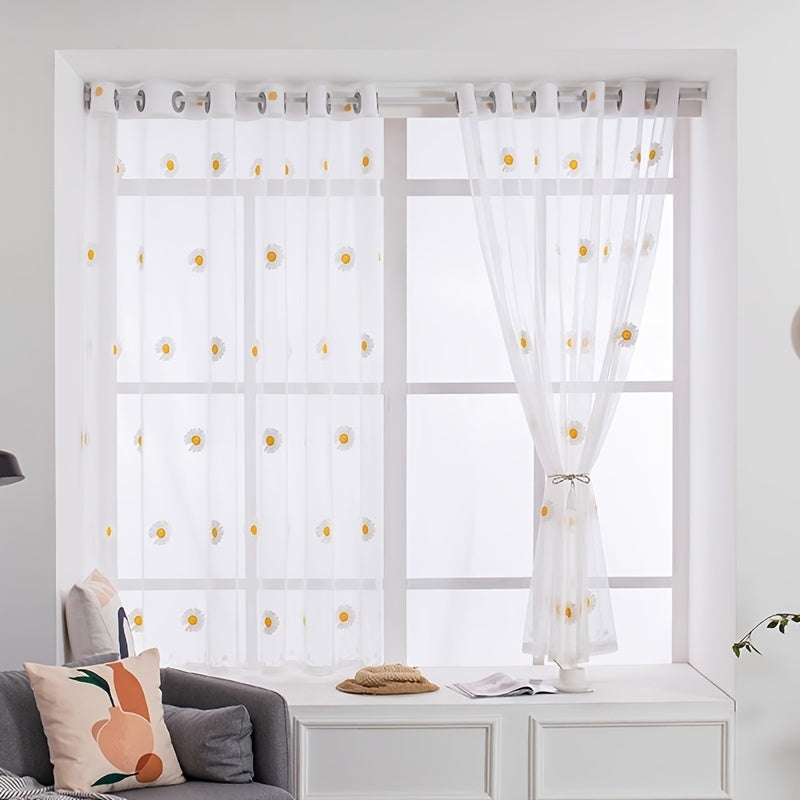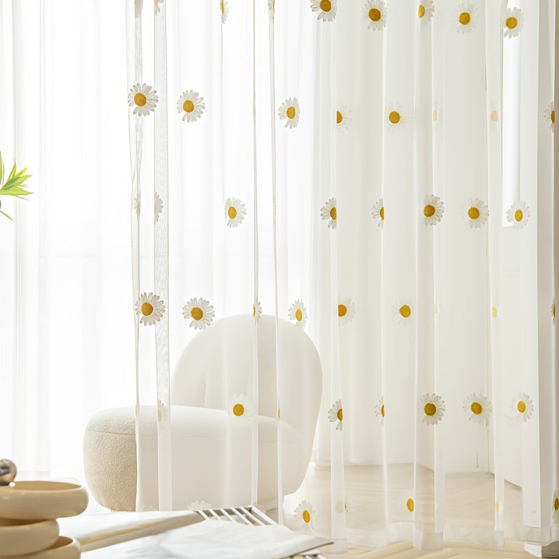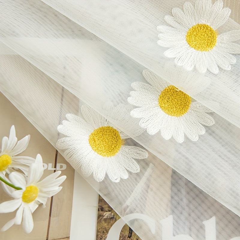"Тюлевая занавеска с узором желтой ромашки, полупрозрачная панель с вышитыми цветами в деревенском стиле, занавеска с люверсами для кухни, ресторана или домашнего декора"
