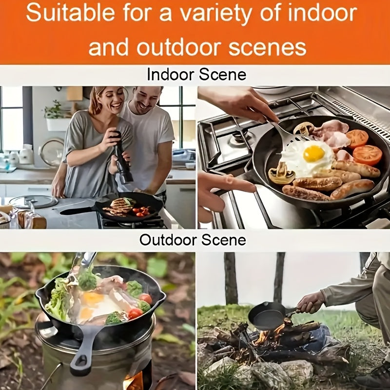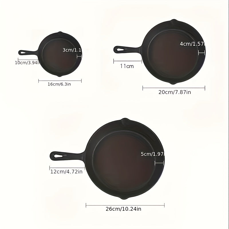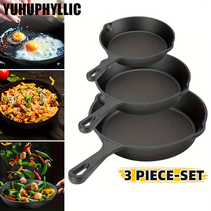 Набор сковородок YUHUPHYLLIC с предварительной приправой включает 3 размера (16 см, 20 см, 25 см) с лопаткой и рукавом для ручки для различных методов приготовления.