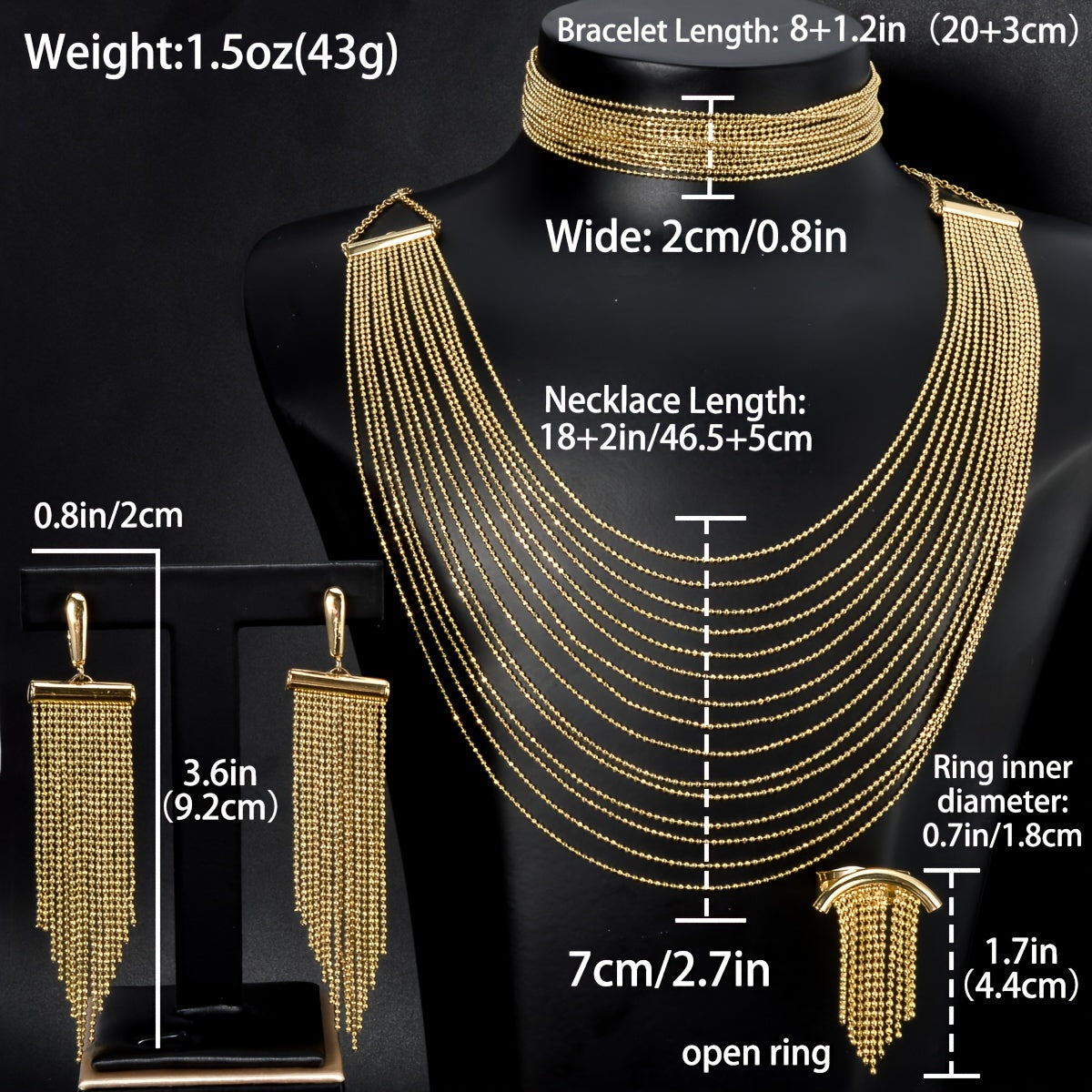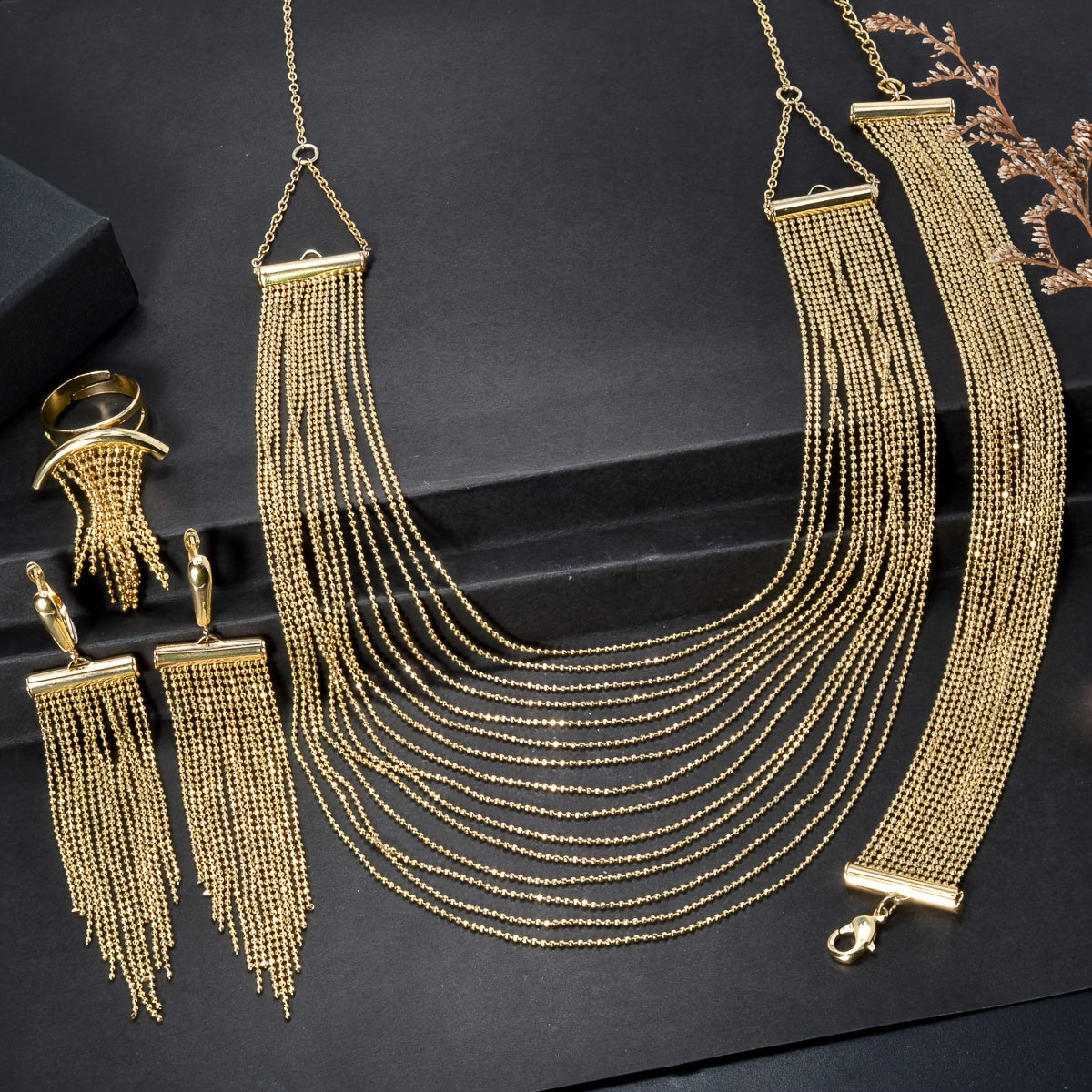 Комплект ювелирных изделий ZEADEAR из меди включает в себя пару висячих серег, кольцо и ожерелье, все с дизайном кисточек. Идеально подходит для женщин, чтобы носить на свадебных вечеринках или в качестве стильного декора.