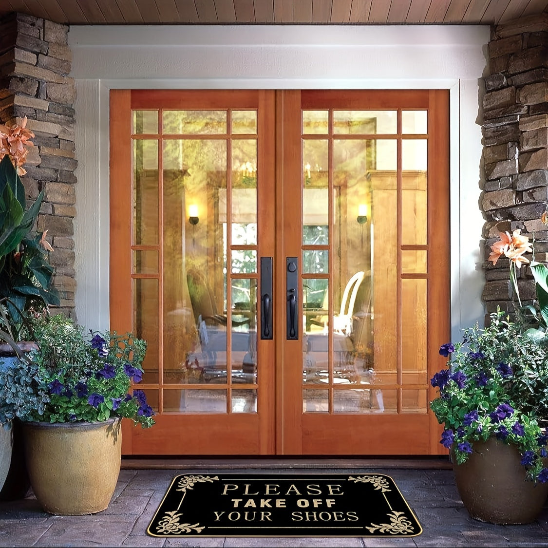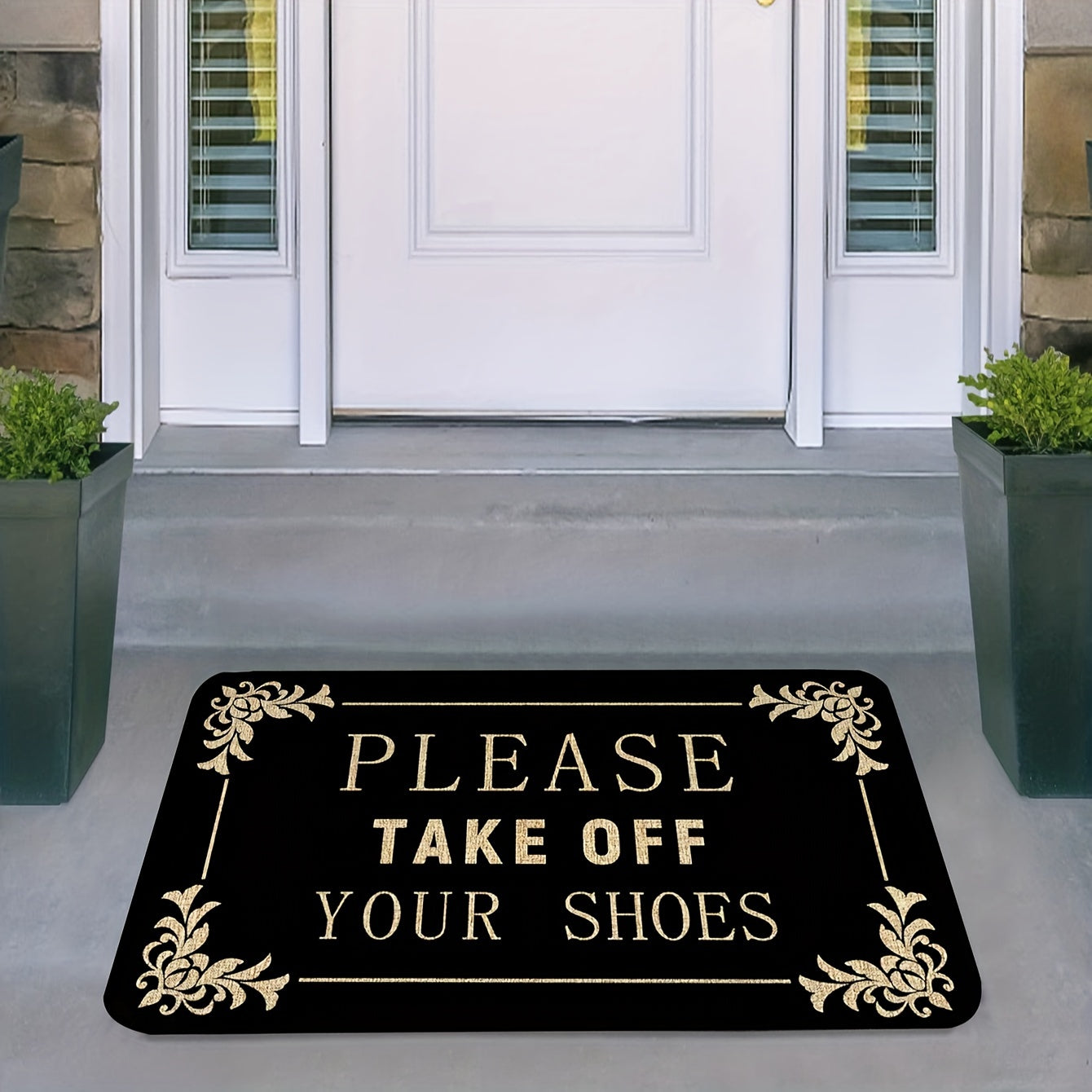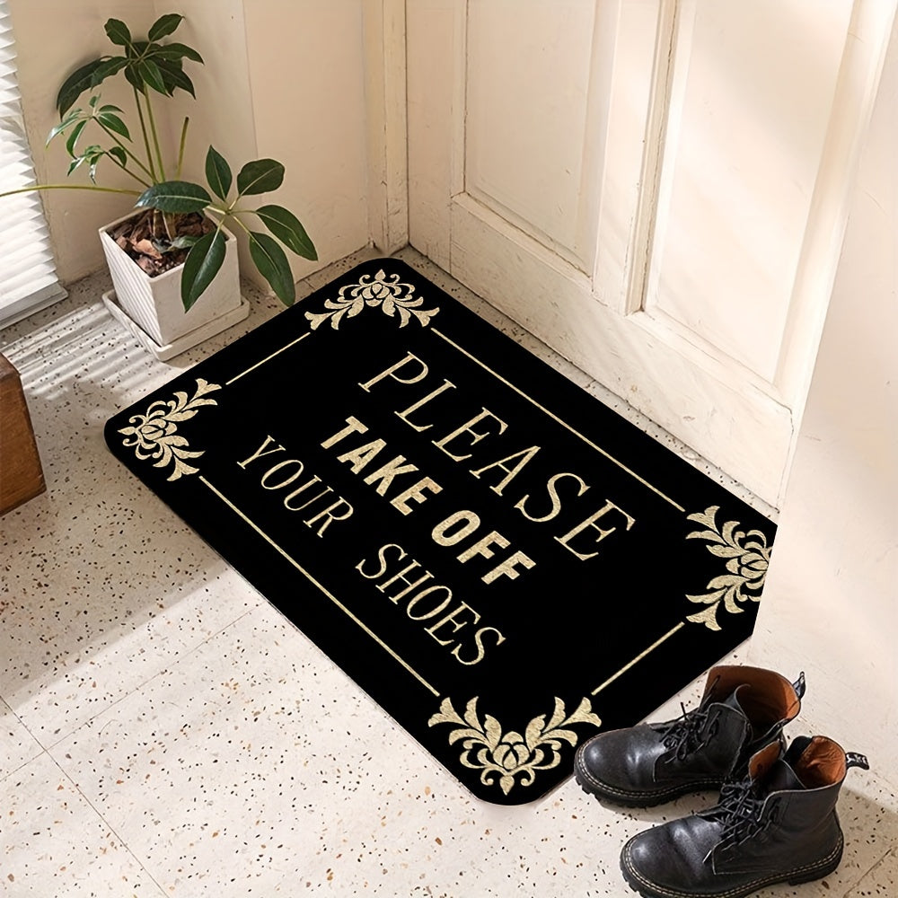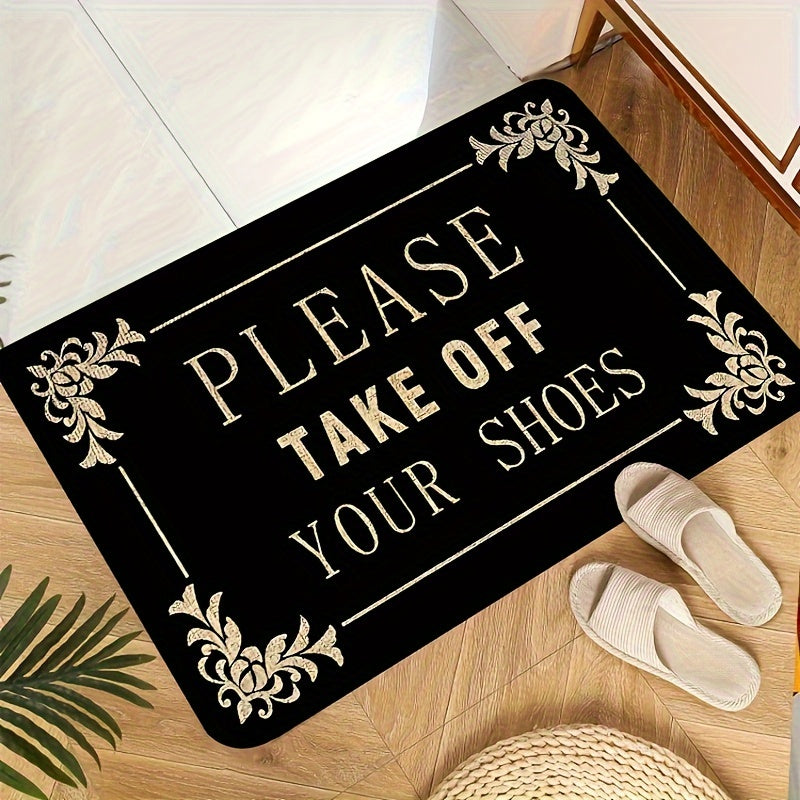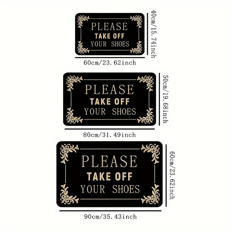 1 часть коврика «Пожалуйста, снимите обувь» из полиэстера с нескользящей ПВХ-подложкой. Идеально подходит для входных дверей, кухонь, садов, патио, веранд и легко моется в стиральной машине.