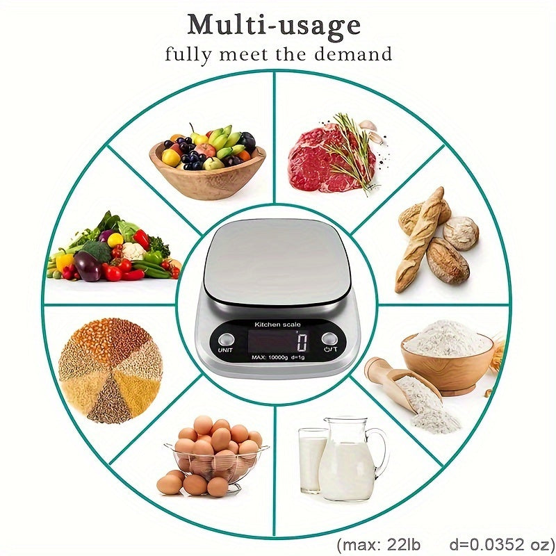 10 кг Цифровые кухонные весы с точностью 1 г, стильный дизайн, ЖК-дисплей, функция тарирования, многократное измерение единиц, работающие от батареи, пластиковый материал, максимальное напряжение 36 В.