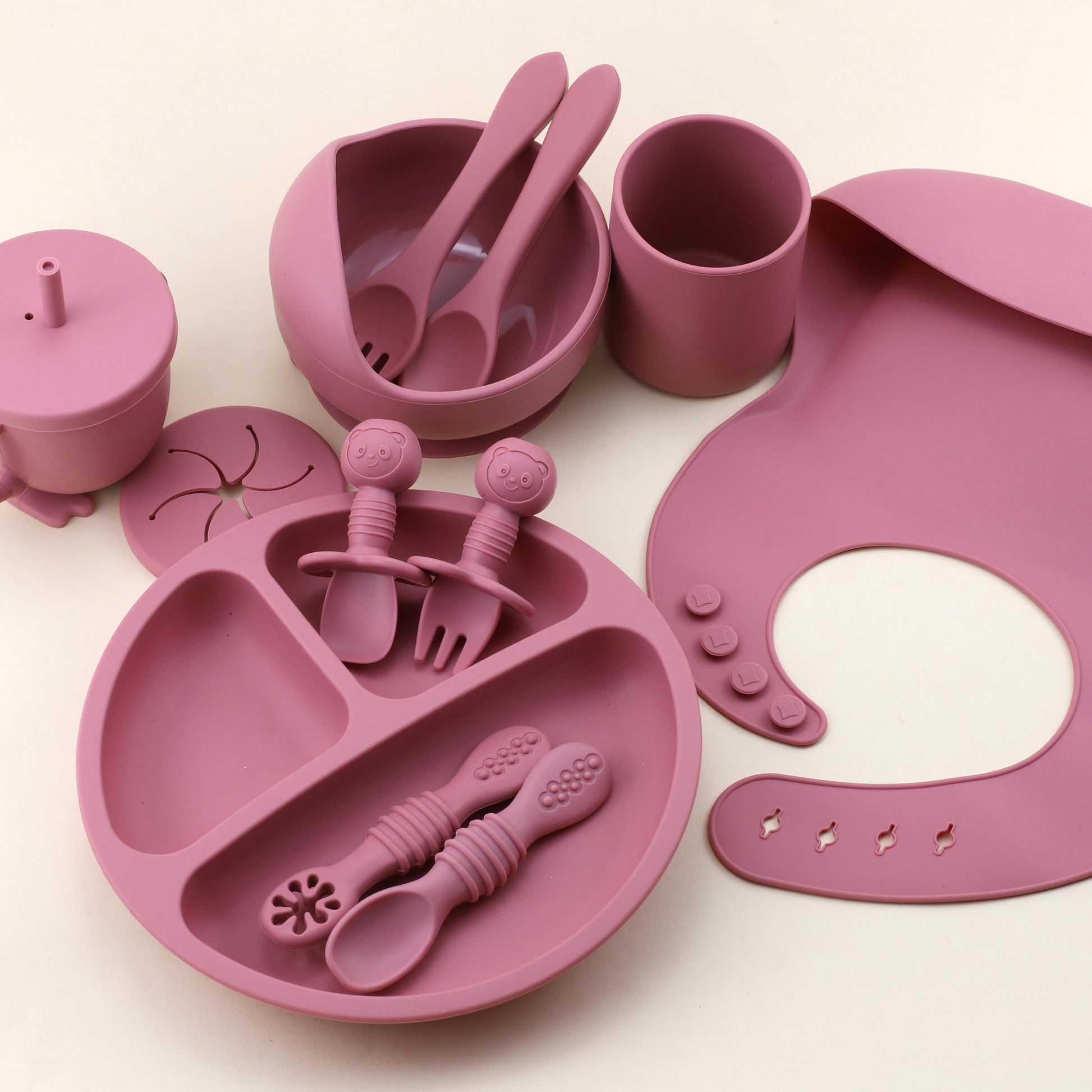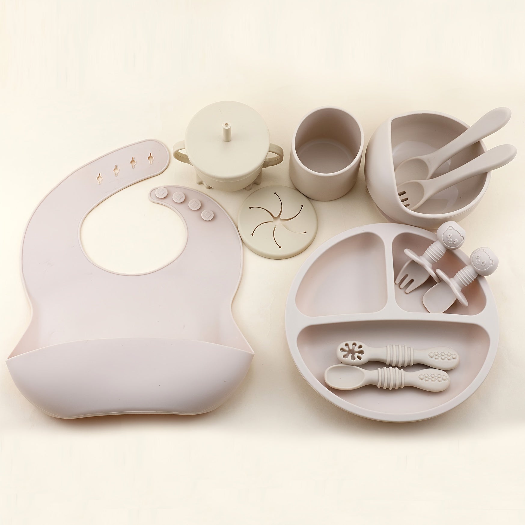 Набор для кормления детей из 12 силиконовых предметов с присоской, разделочной тарелкой, ложкой, вилкой, поильником и нагрудником для самостоятельного кормления
