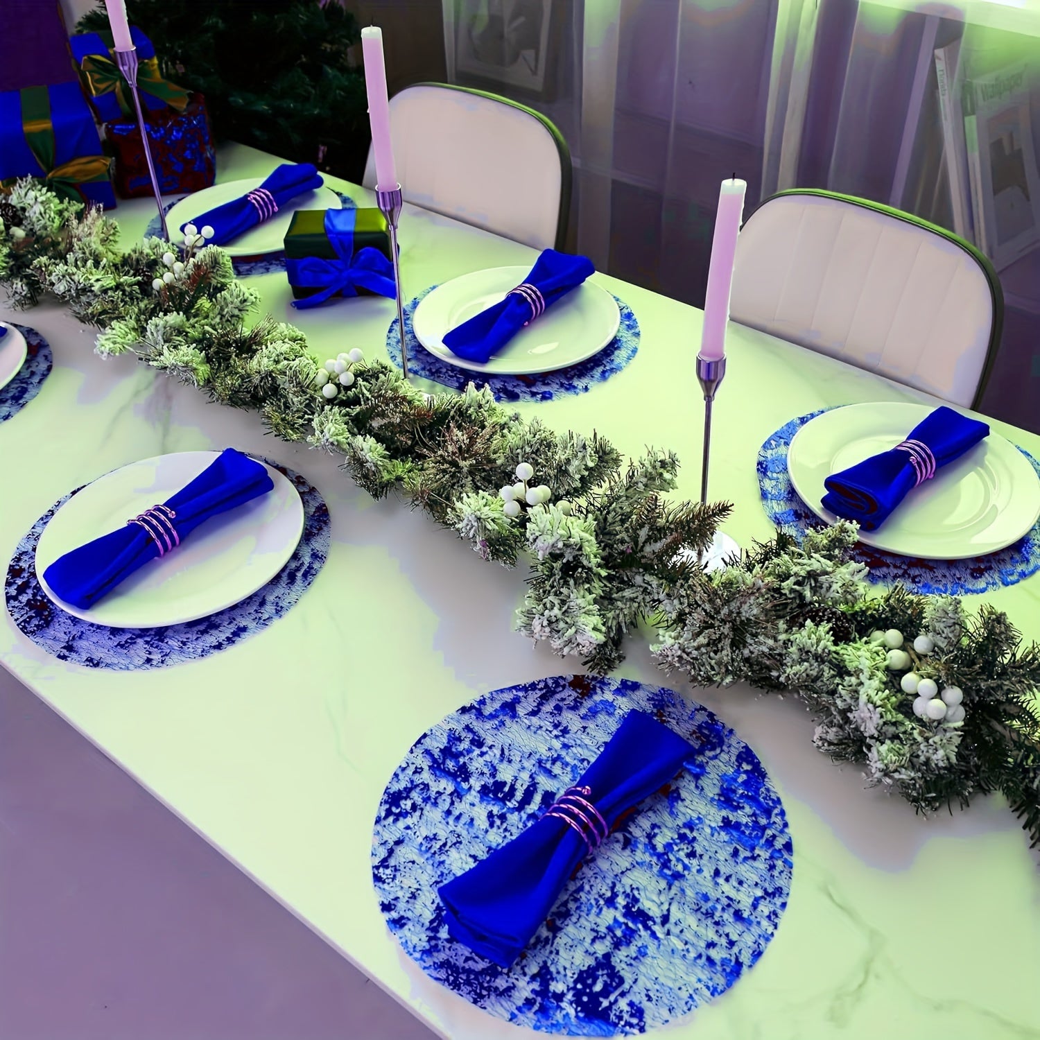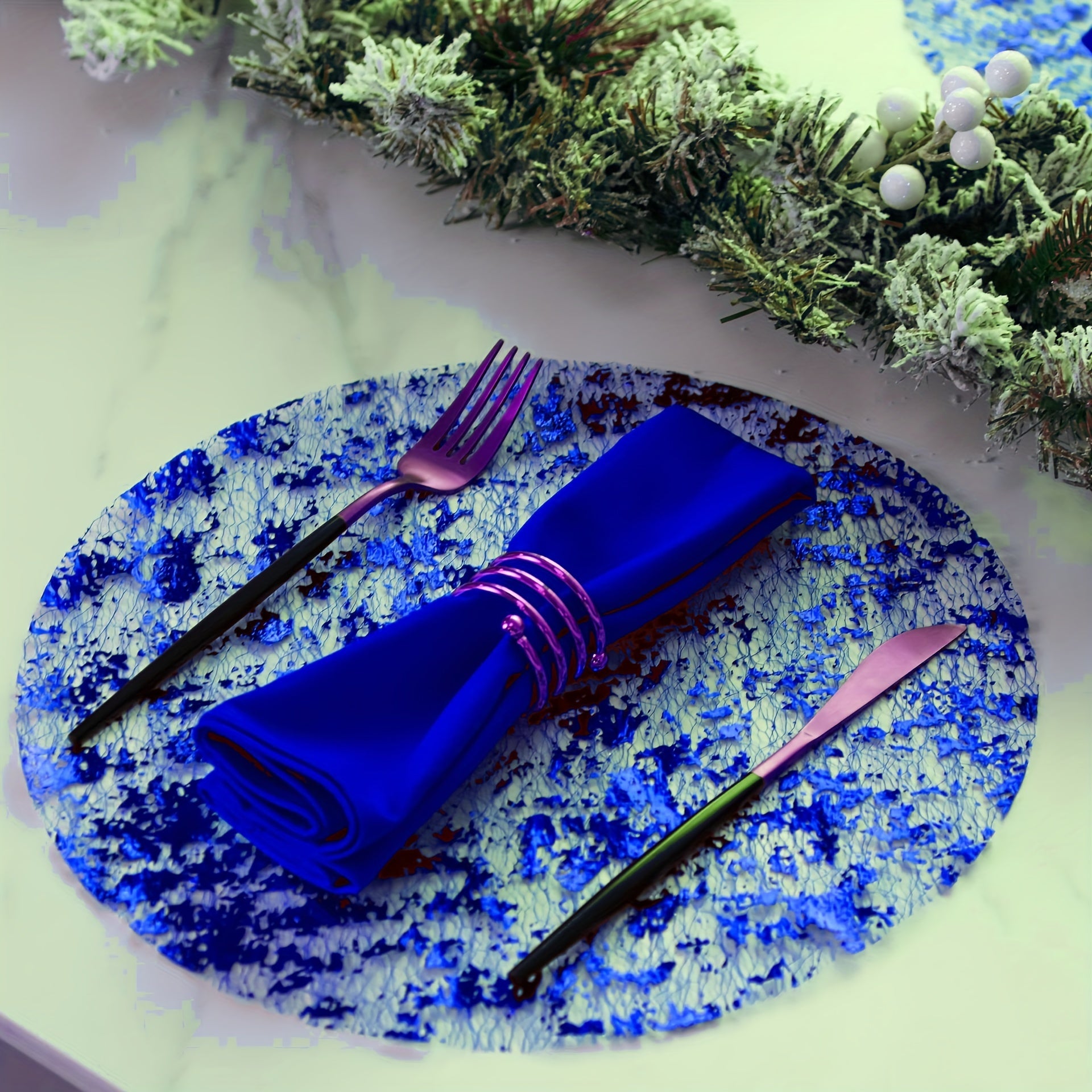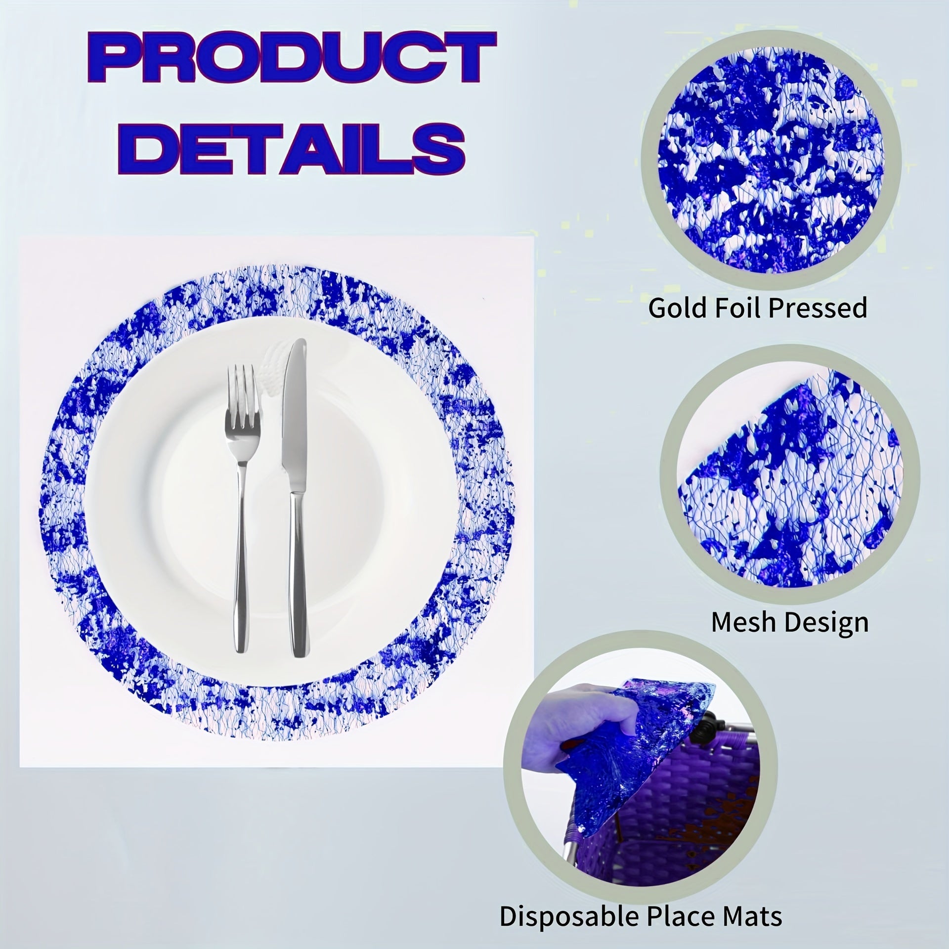 12 штук столовых подкладок из королевского синего фольги, идеально подходящих для свадебных и праздничных украшений. Изготовленные из полиэстера, эти легкие роскошные круглые сетчатые тонкие блестящие подкладки добавляют изысканности любому интерьеру.