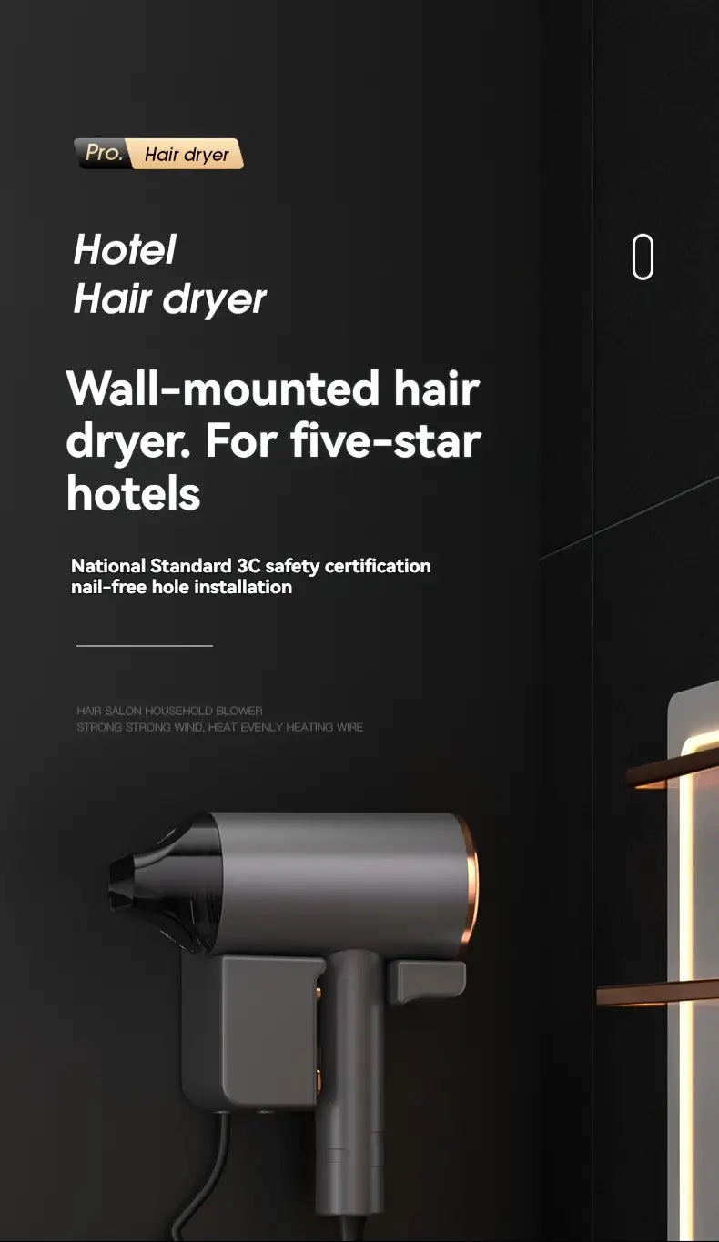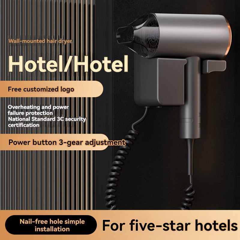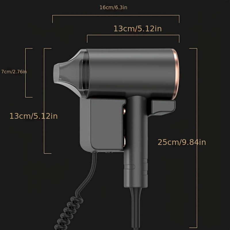 1200W настенный фен с высокой мощностью, идеален для домашнего и гостиничного использования. Включает в себя вешалку/насадку, не складывающуюся ручку, щеточный мотор и шнур длиной 1,5 м - 3 м.