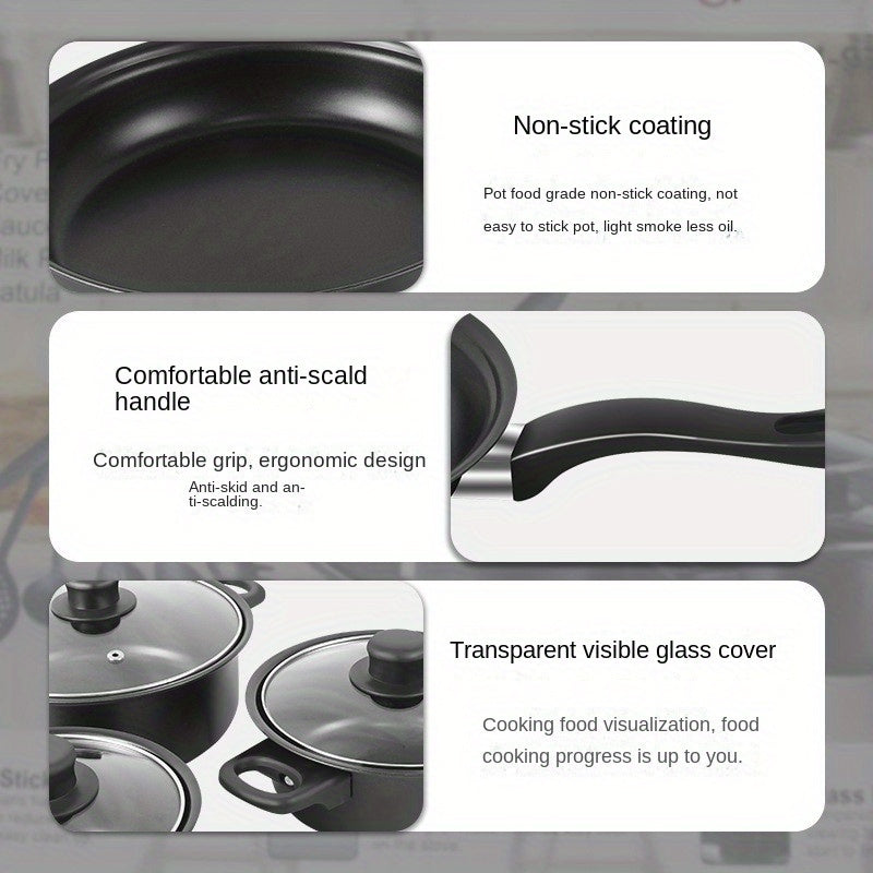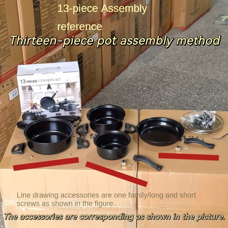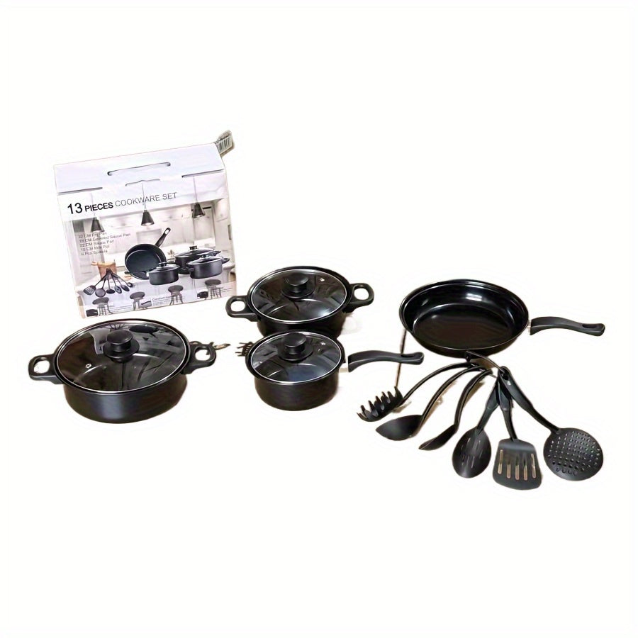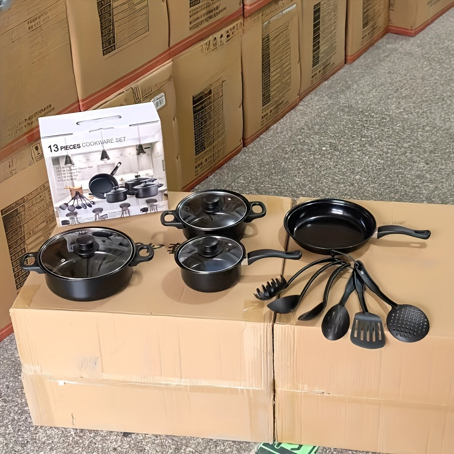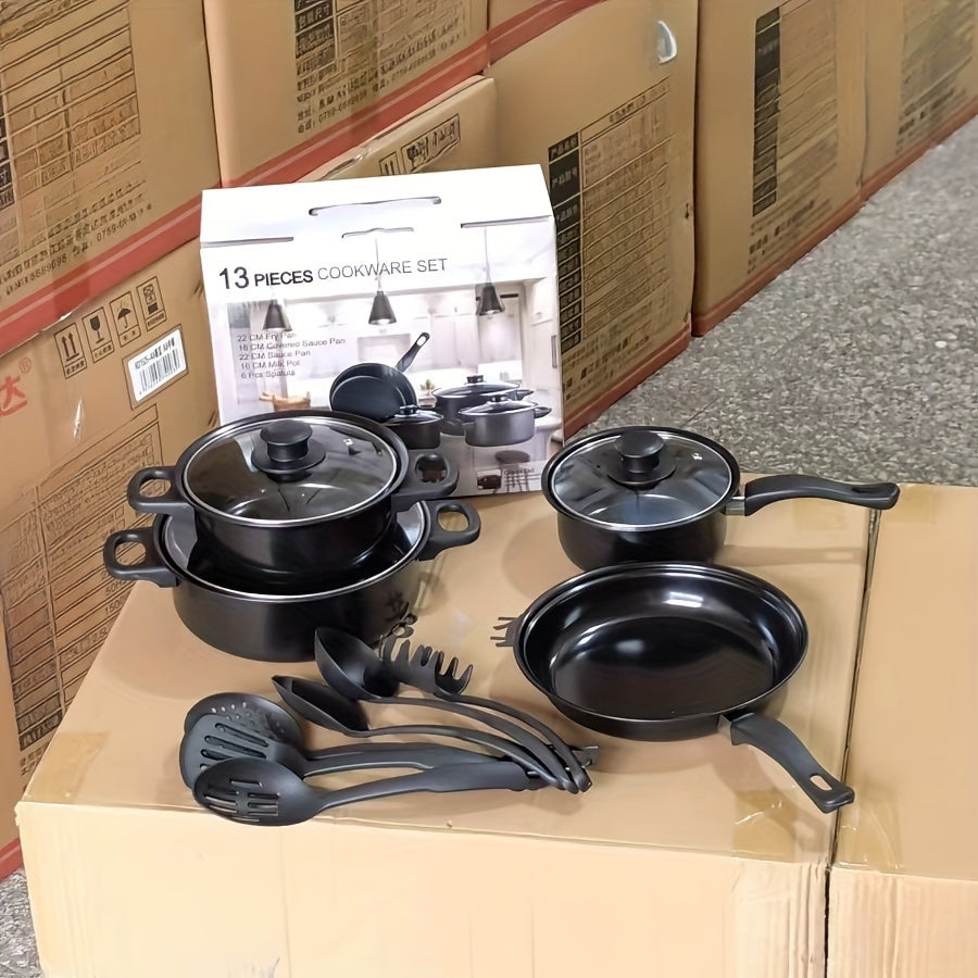 Набор из 13 предметов с антипригарным покрытием включает кастрюлю, сковороду и многофункциональные кухонные сковороды в коробке нейтрального цвета. Идеально подходит для жарки, варки и тушения.