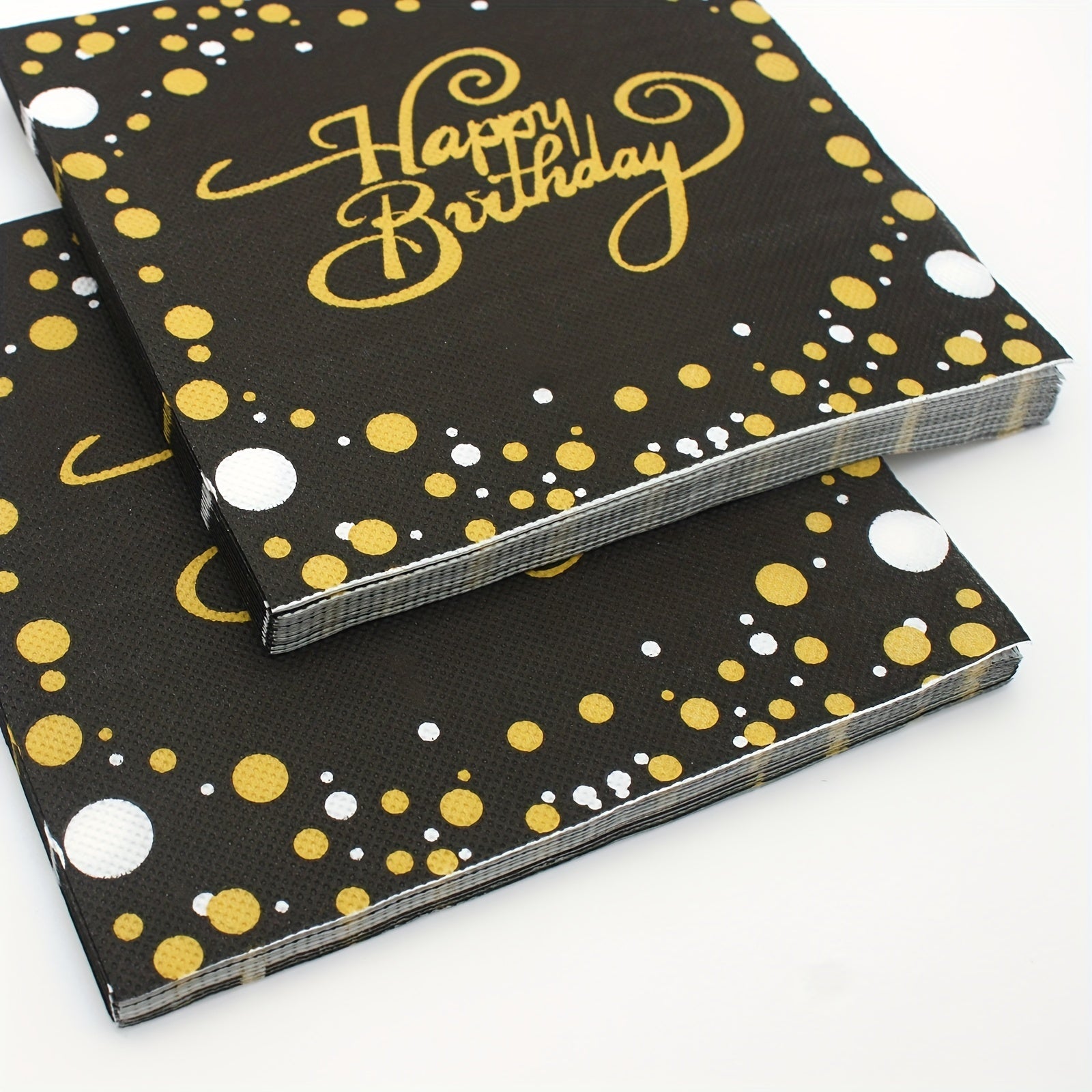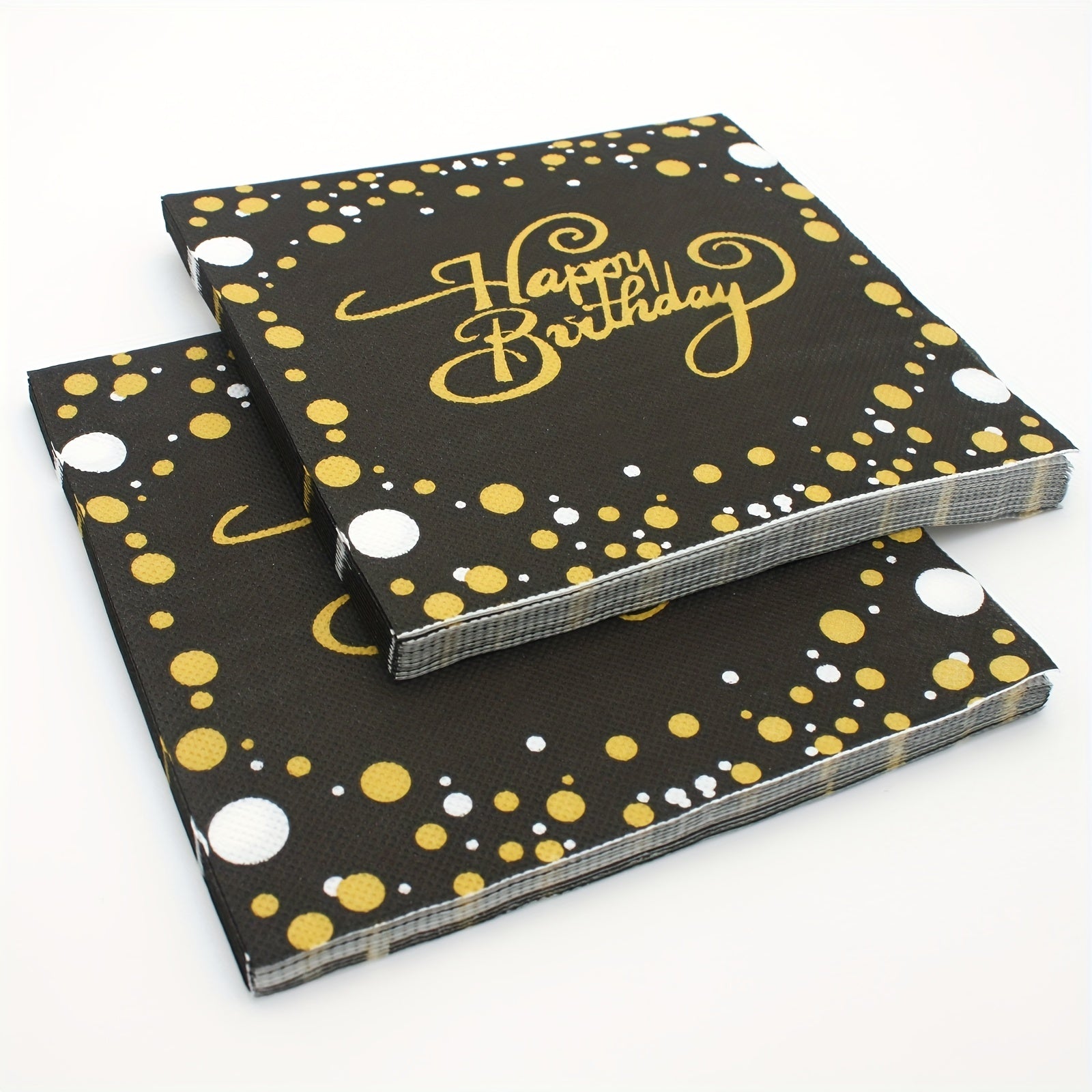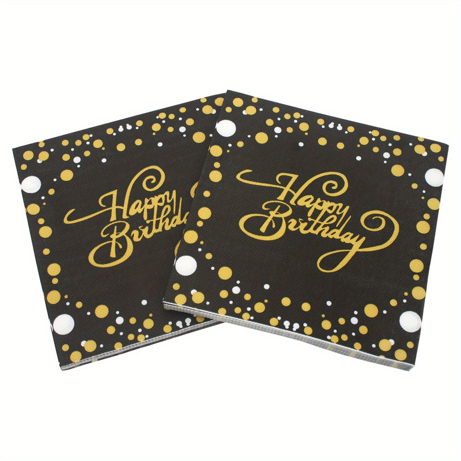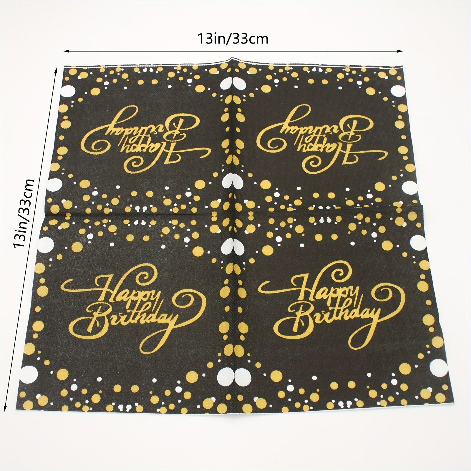 20 черных салфеток (33,02 см x 33,02 см) с золотым узором "С Днем Рождения", идеально подходящих для мероприятий, таких как свадьбы, юбилеи и дни рождения.