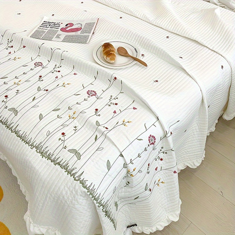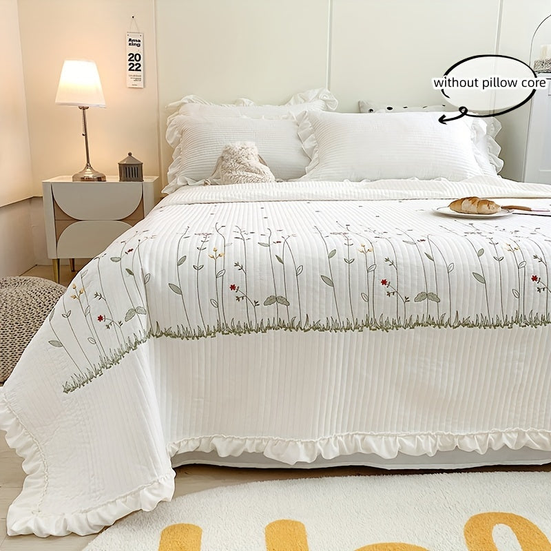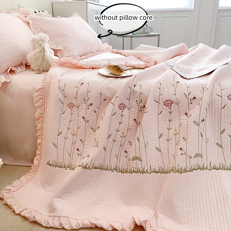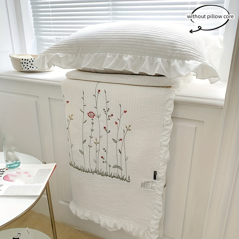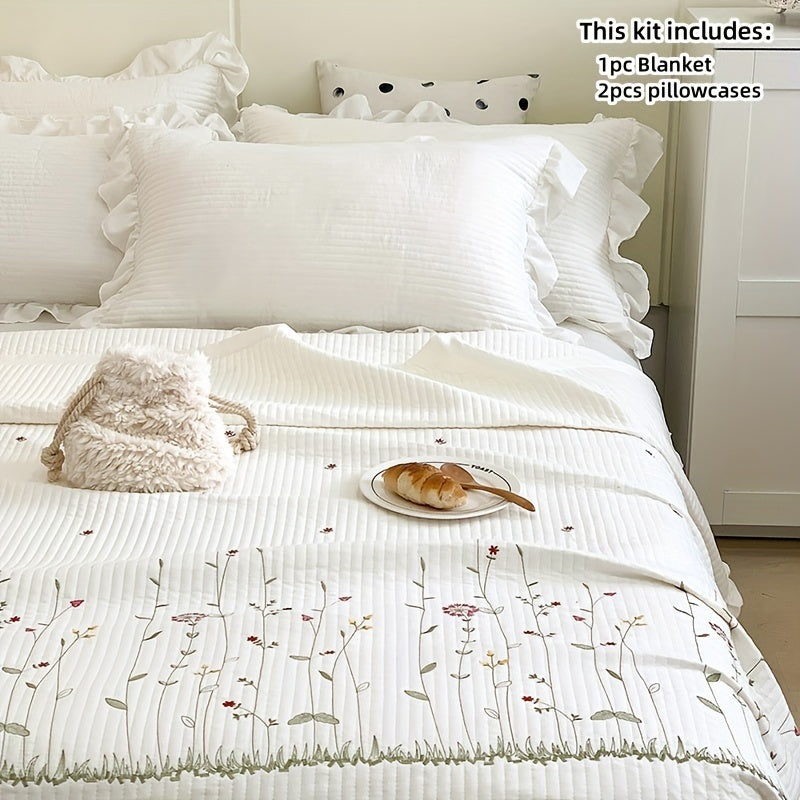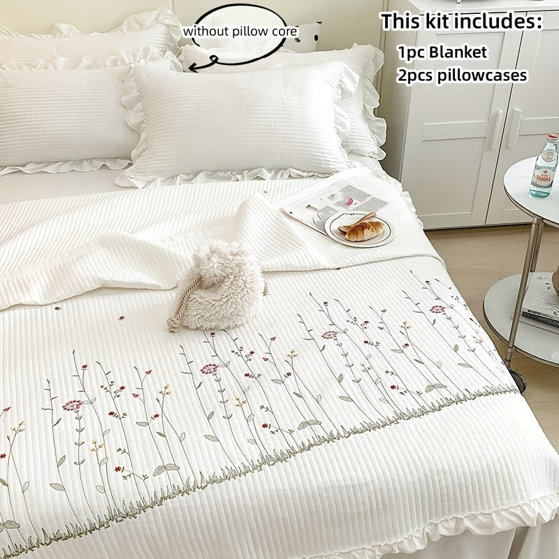 Комплект летнего одеяла из 3 предметов в корейском стиле с цветочной вышивкой включает одно легкое одеяло и две рюши подушки, изготовленные из полиэстеровой ткани, машинная стирка - стильное постельное белье для всех.