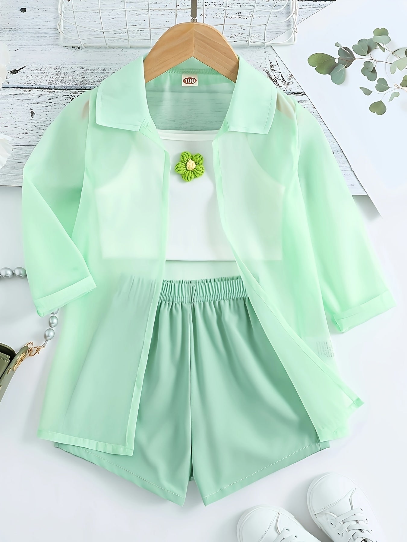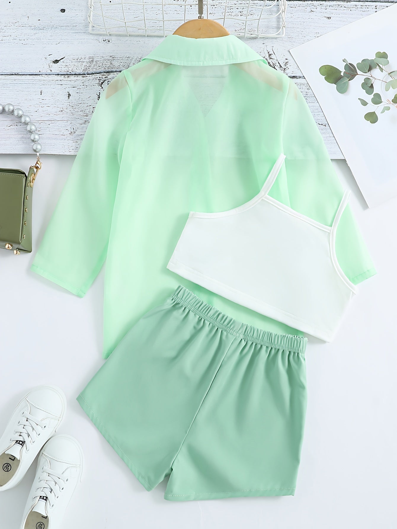 Девочковый комплект одежды для улицы, 3 предмета: длинный рукав, полупрозрачная рубашка, ками, укороченный топ, шорты, лето