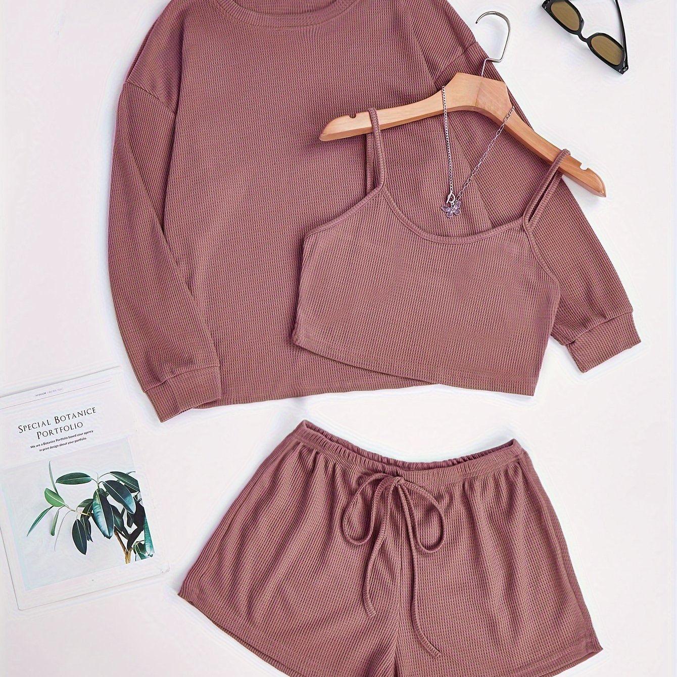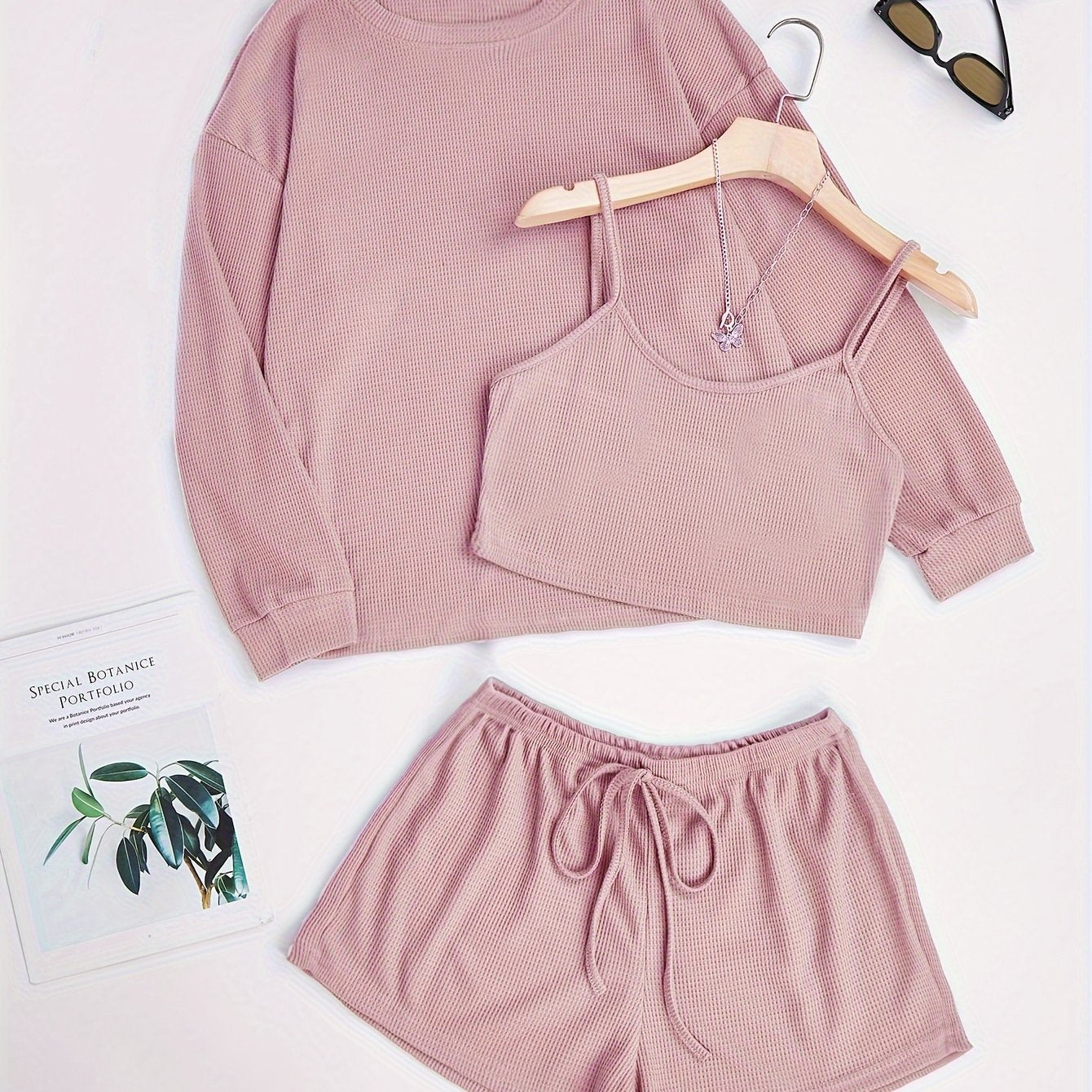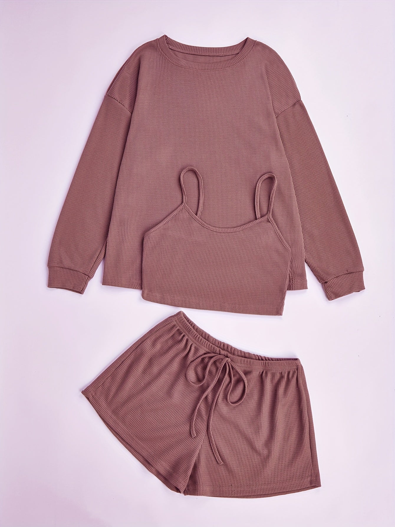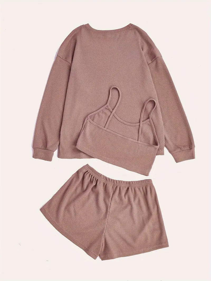 Комплект пижам из 3 предметов, связанный из вафельной ткани, изготовленный на 97% из полиэстера и на 3% из эластана для комфорта в любое время года.