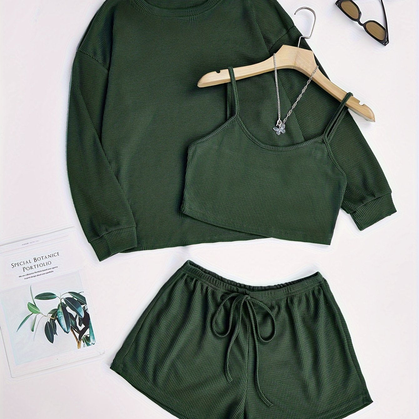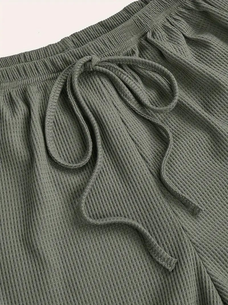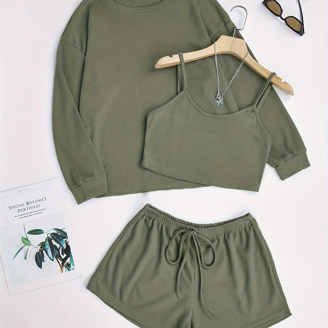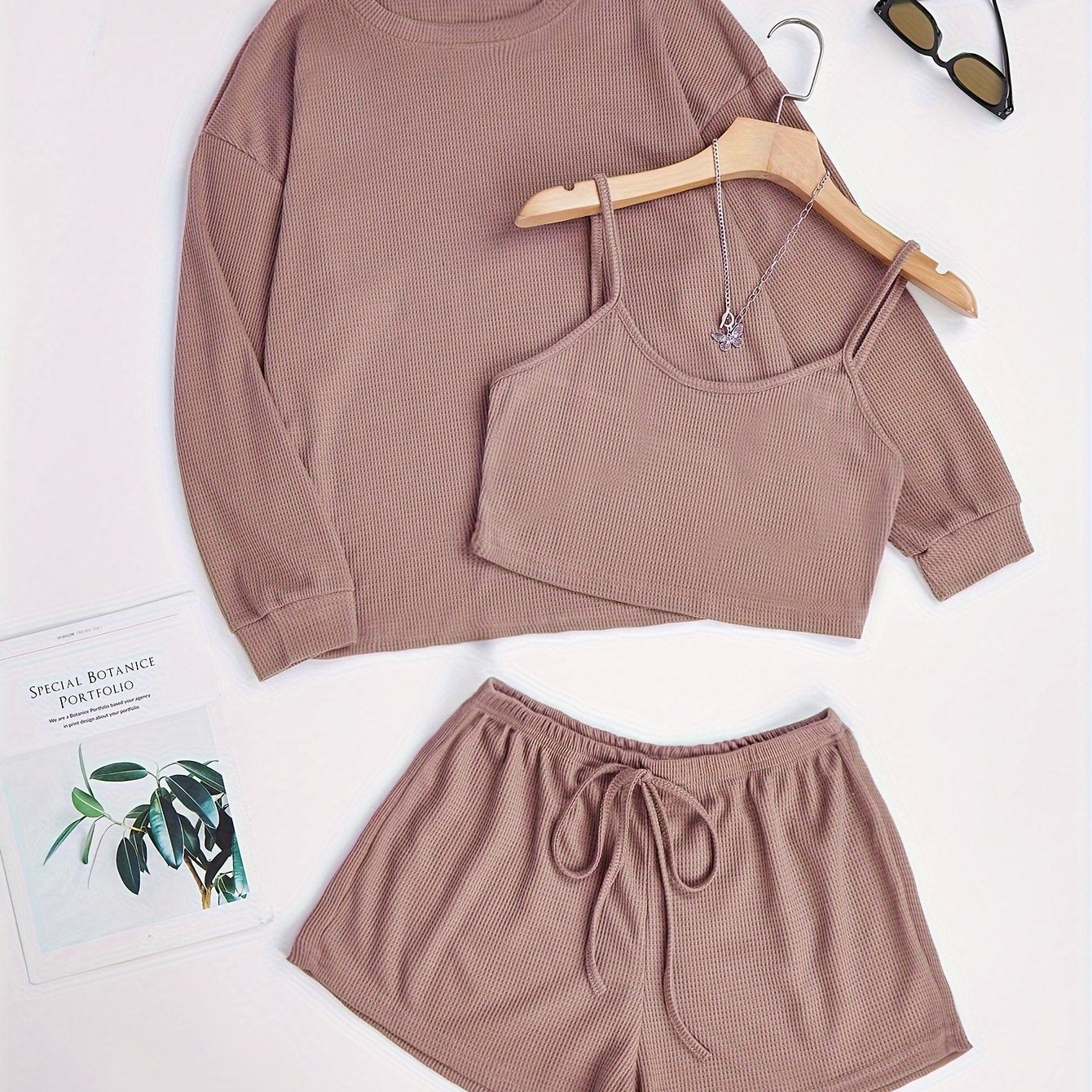 Комплект пижам из 3 предметов, связанный из вафельной ткани, изготовленный на 97% из полиэстера и на 3% из эластана для комфорта в любое время года.